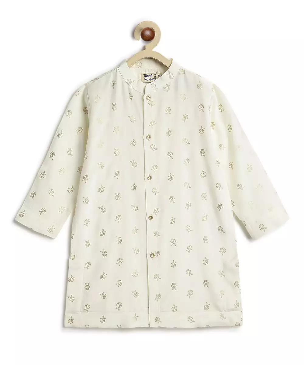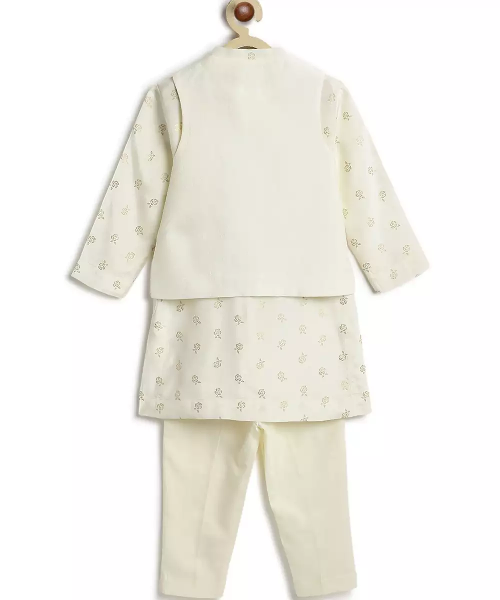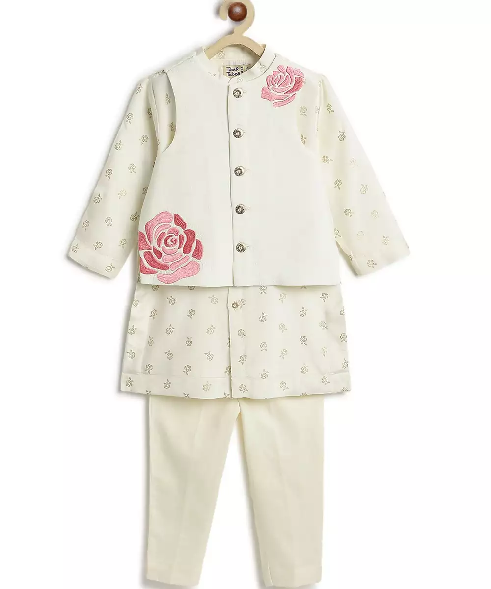 Dress Him Like A Little Prince In This Elegant 3 Piece Bundi Set, Perfect For Weddings, Festive Gatherings, Or Family Functions. The Kurta Features A Subtle Buta Print, While The Bundi Jacket Steals The Spotlight With Delicate Rose Embroidery In Soft Hues. Paired With Classic Cream Pants For A Clean Look.
