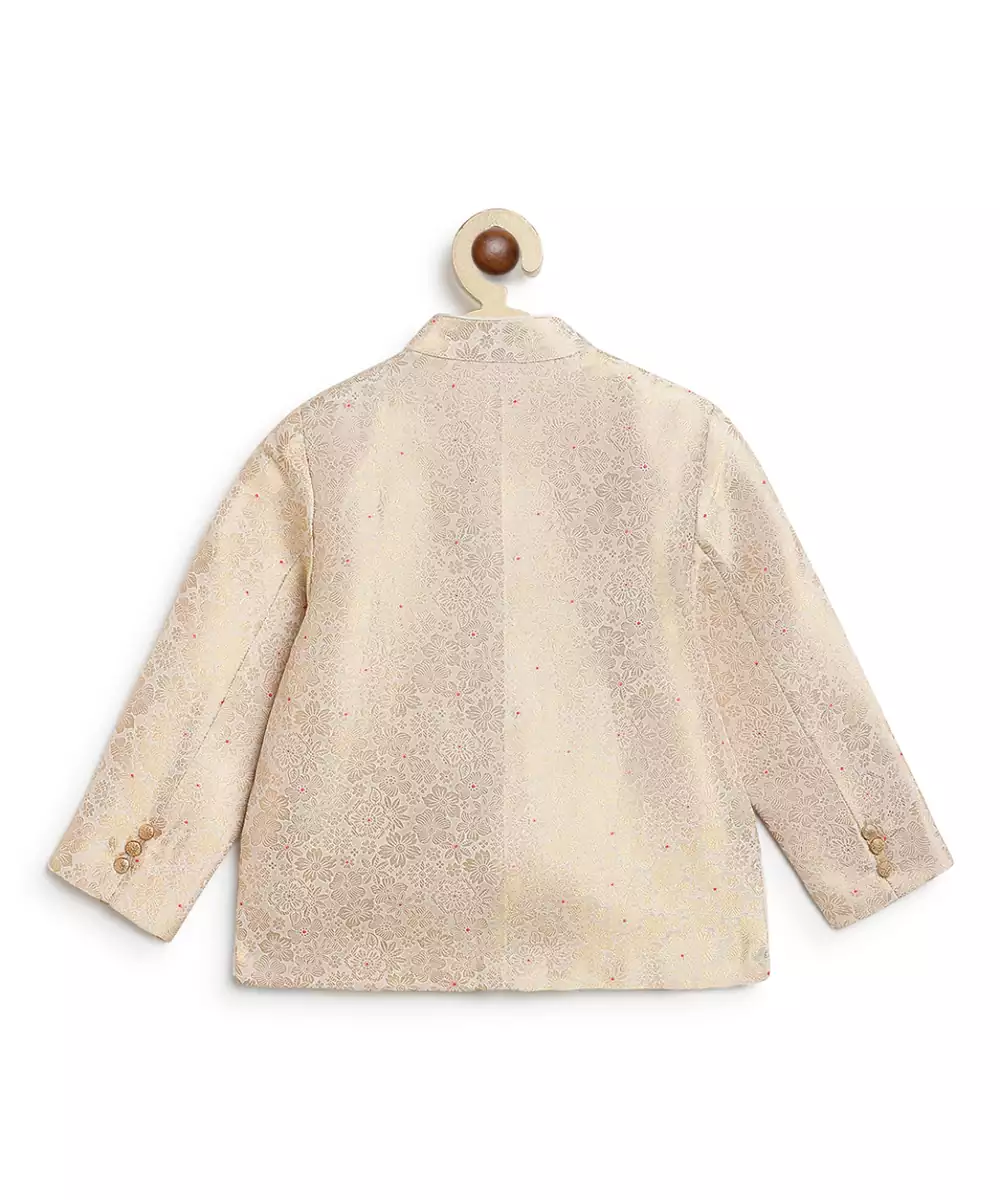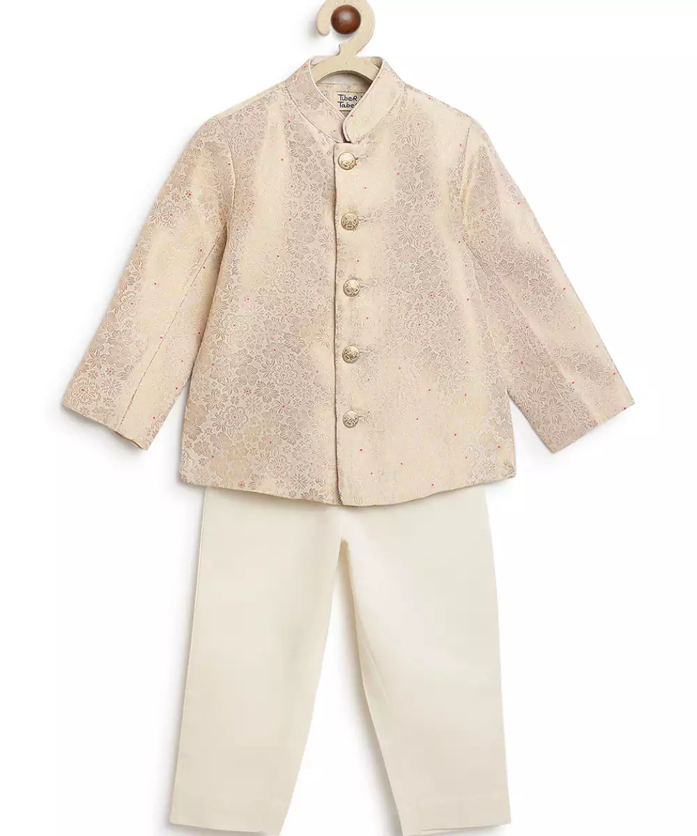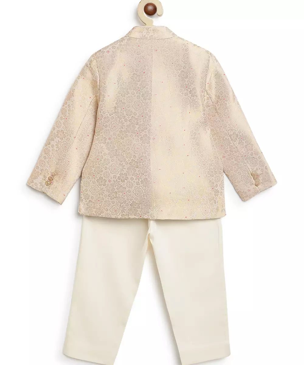This White Embroidered Brocade Bandhgala Set Exudes Regal Elegance And Timeless Sophistication. Crafted From Rich Brocade Fabric, It Features Intricate Embroidery That Adds A Refined, Luxurious Touch. Perfect For Weddings And Festive Occasions, It Offers A Polished Silhouette With Classic Traditional Appeal.