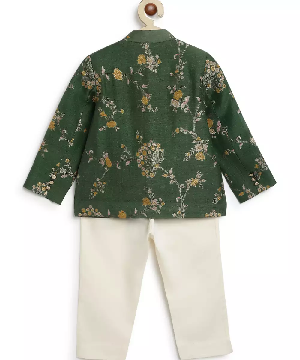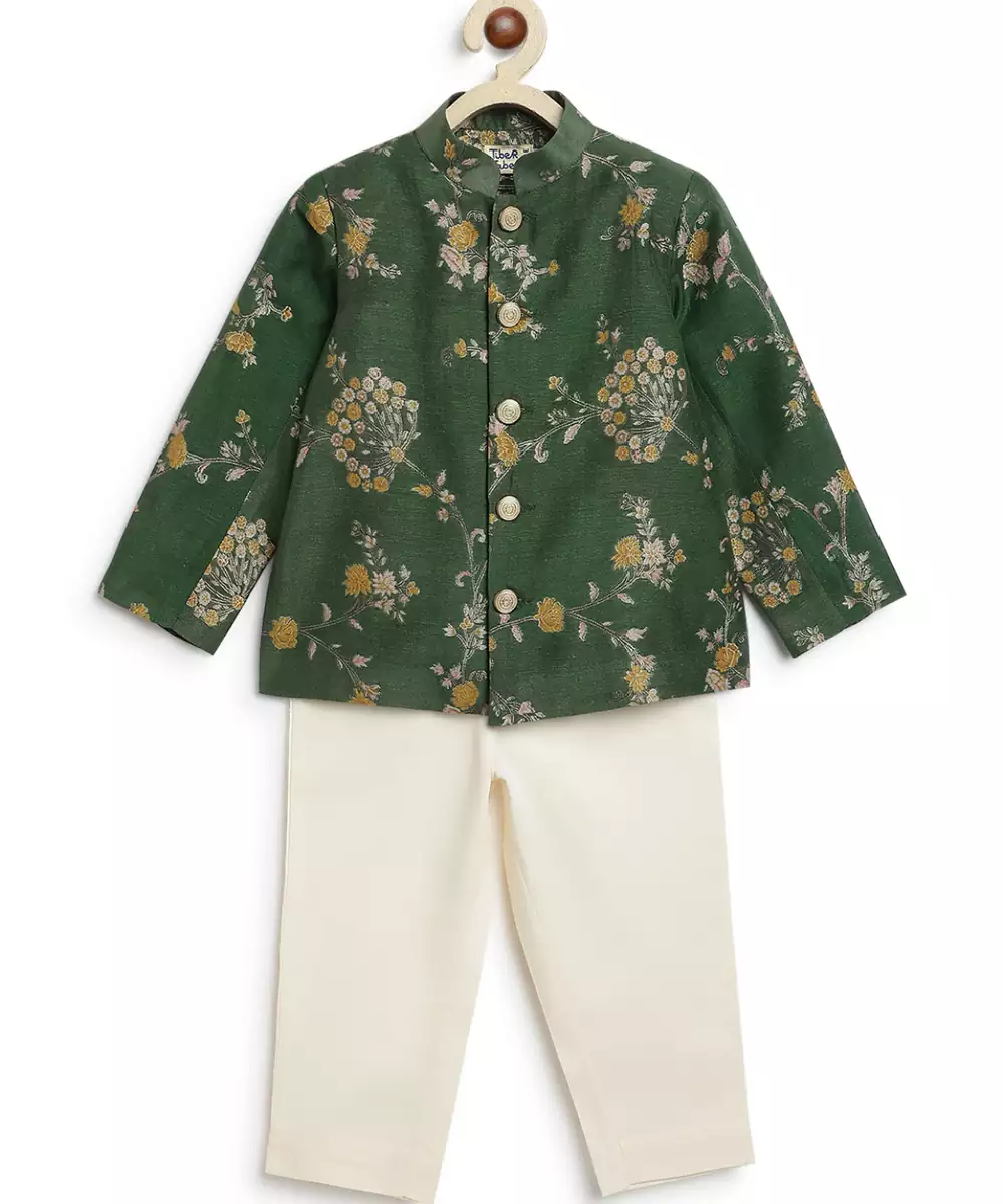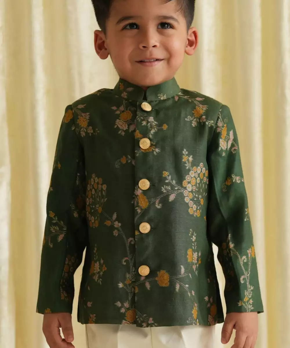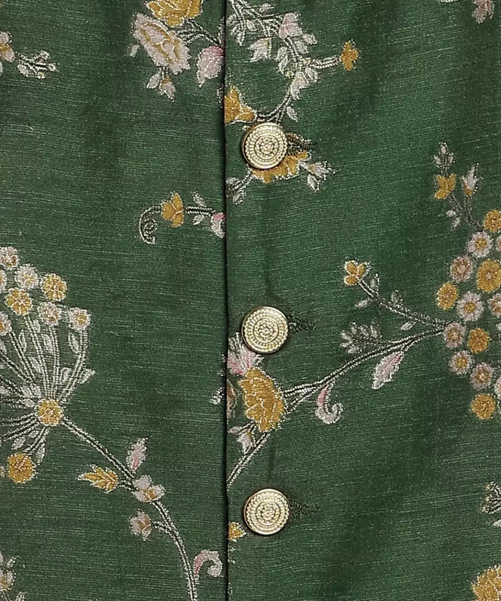 This Green Embroidered Brocade Bandhgala Set Exudes Regal Elegance And Timeless Sophistication. Crafted From Rich Brocade Fabric, It Features Intricate Embroidery That Adds A Refined, Luxurious Touch. Perfect For Weddings And Festive Occasions, It Offers A Polished Silhouette With Classic Traditional Appeal.