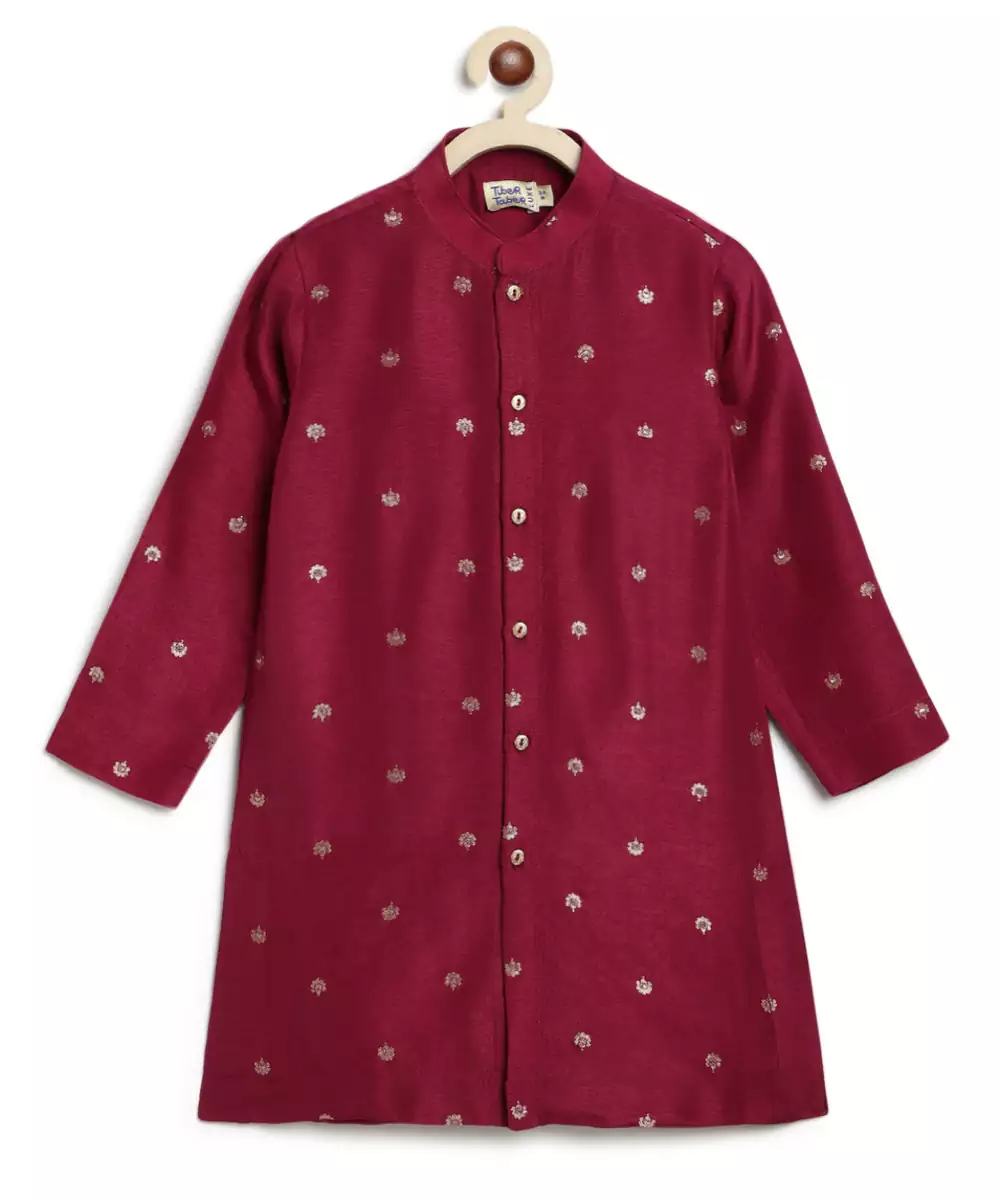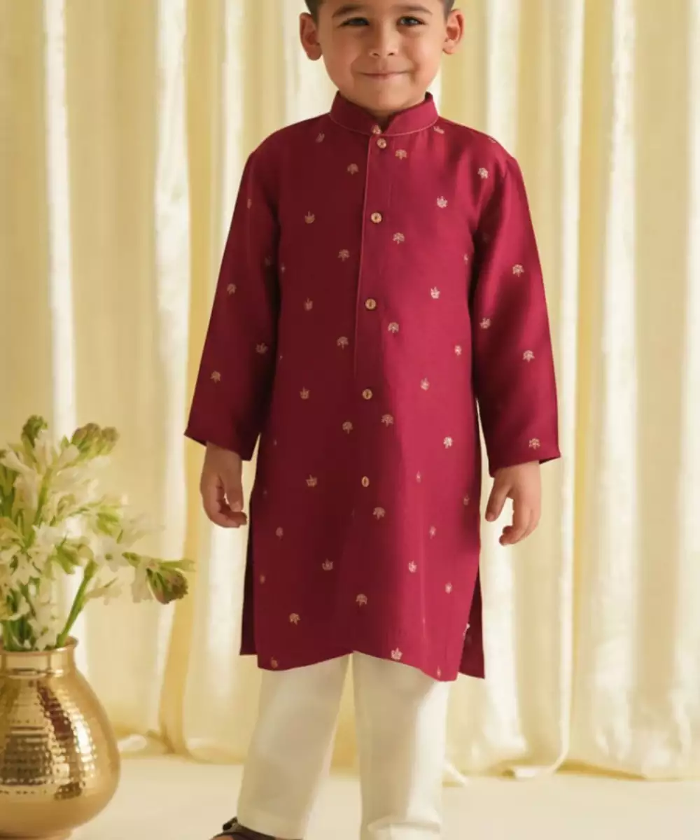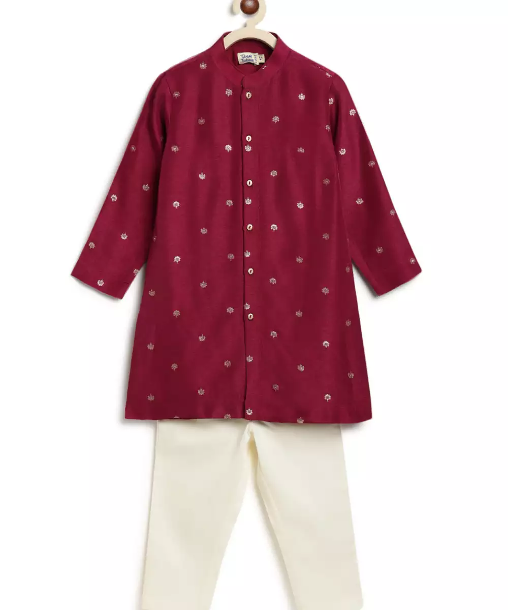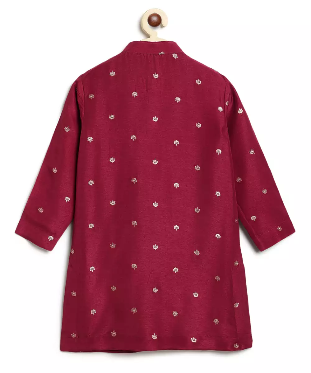 This Maroon Embroidered Brocade Kurta Pyjama Exudes Regal Elegance And Timeless Charm. Crafted From Rich Brocade Fabric, It Features Intricate Embroidery That Adds A Refined, Luxurious Touch. Perfect For Weddings And Festive Occasions, It Offers A Sophisticated Traditional Look With Classic Appeal.