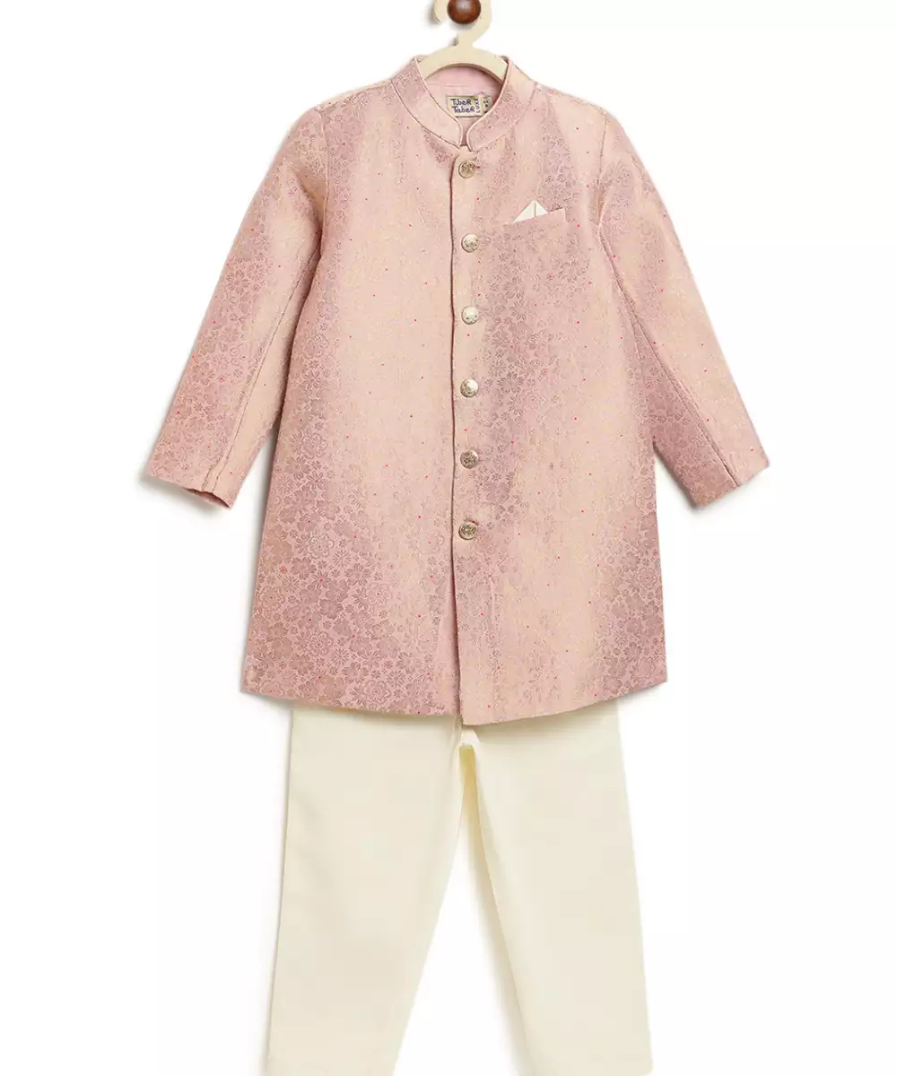 This Pink Embroidered Brocade Bandhgala Set Exudes Regal Elegance And Timeless Sophistication. Crafted From Rich Brocade Fabric, It Features Intricate Embroidery That Adds A Refined, Luxurious Touch. Perfect For Weddings And Festive Occasions, It Offers A Polished Silhouette With Classic Traditional Appeal.