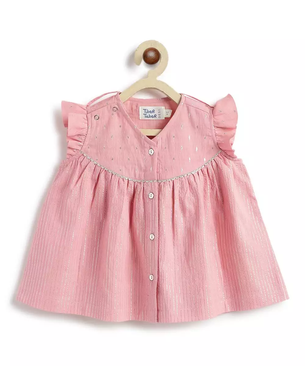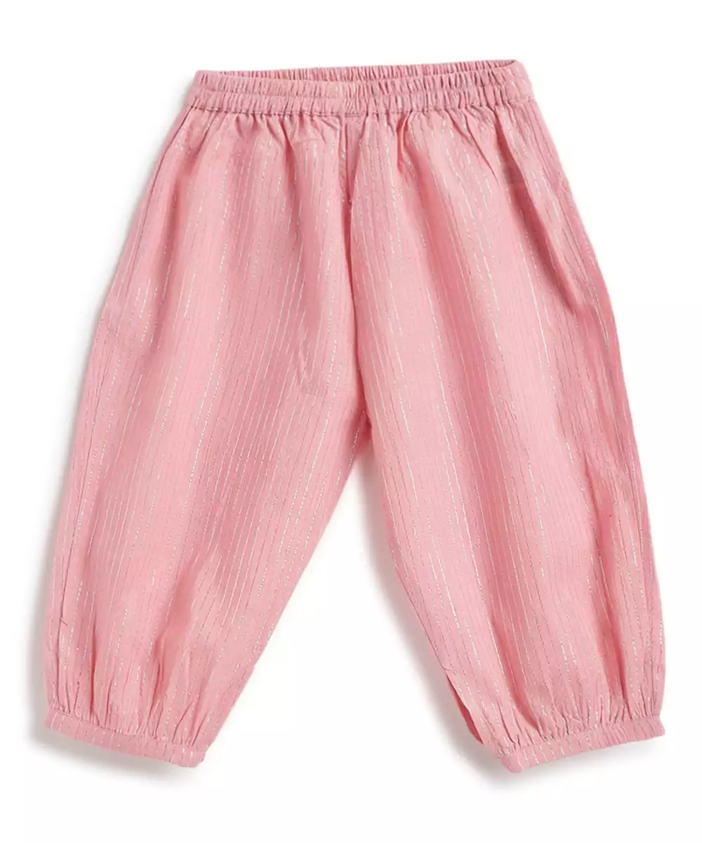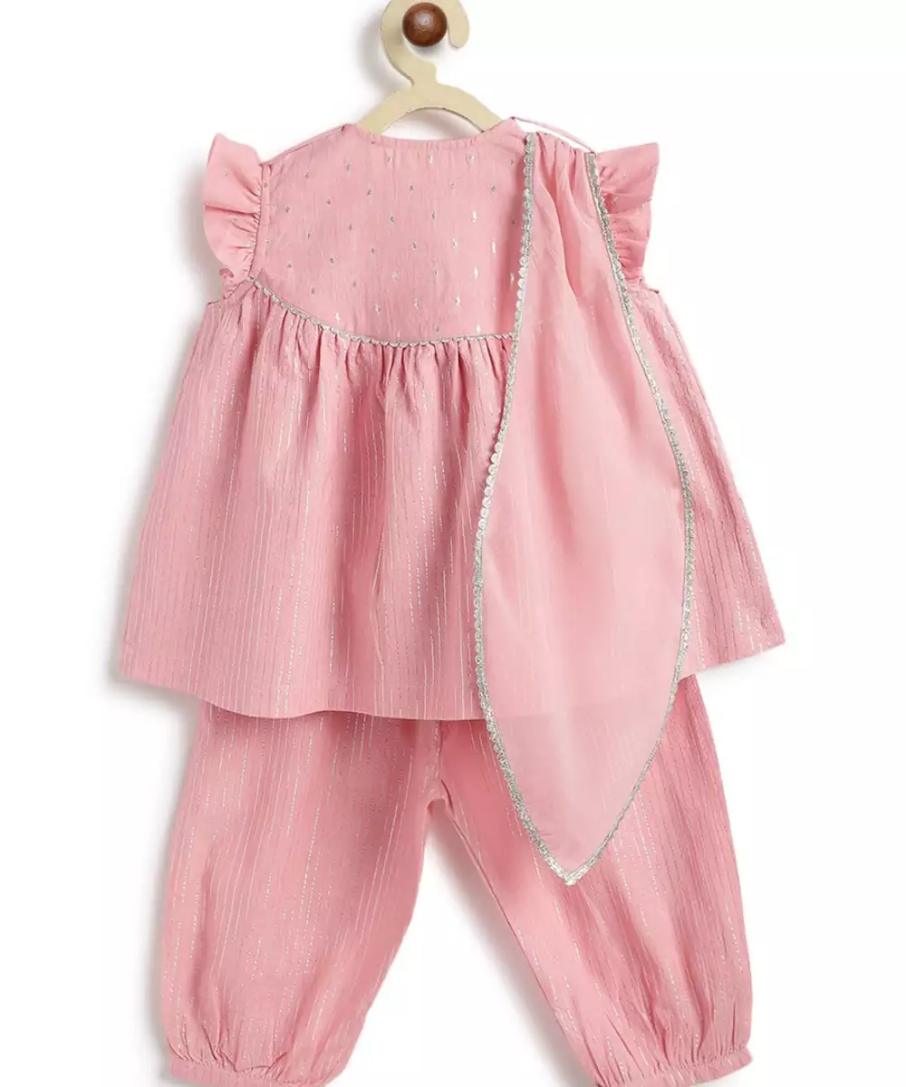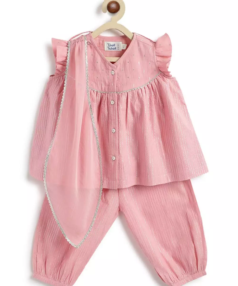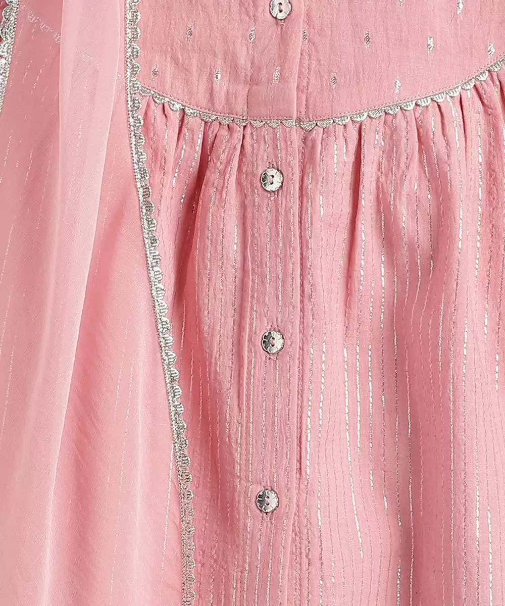 Here’s A Soft Summery Shade Of Pink That She’ll Never Get Bored Of. Crafted From Soft Lurex Fabric With Self Woven Silver Stripes, This Outfit Is Festive Without Being Over The Top. Ruffle Sleeves, A Gathered Flare Silhouette, And Delicate Sequin Lace On The Dupatta Bring All The Filmy Vibes. The Elasticated Bottoms Not Only Make It Easy To Wear But Play Friendly Too!