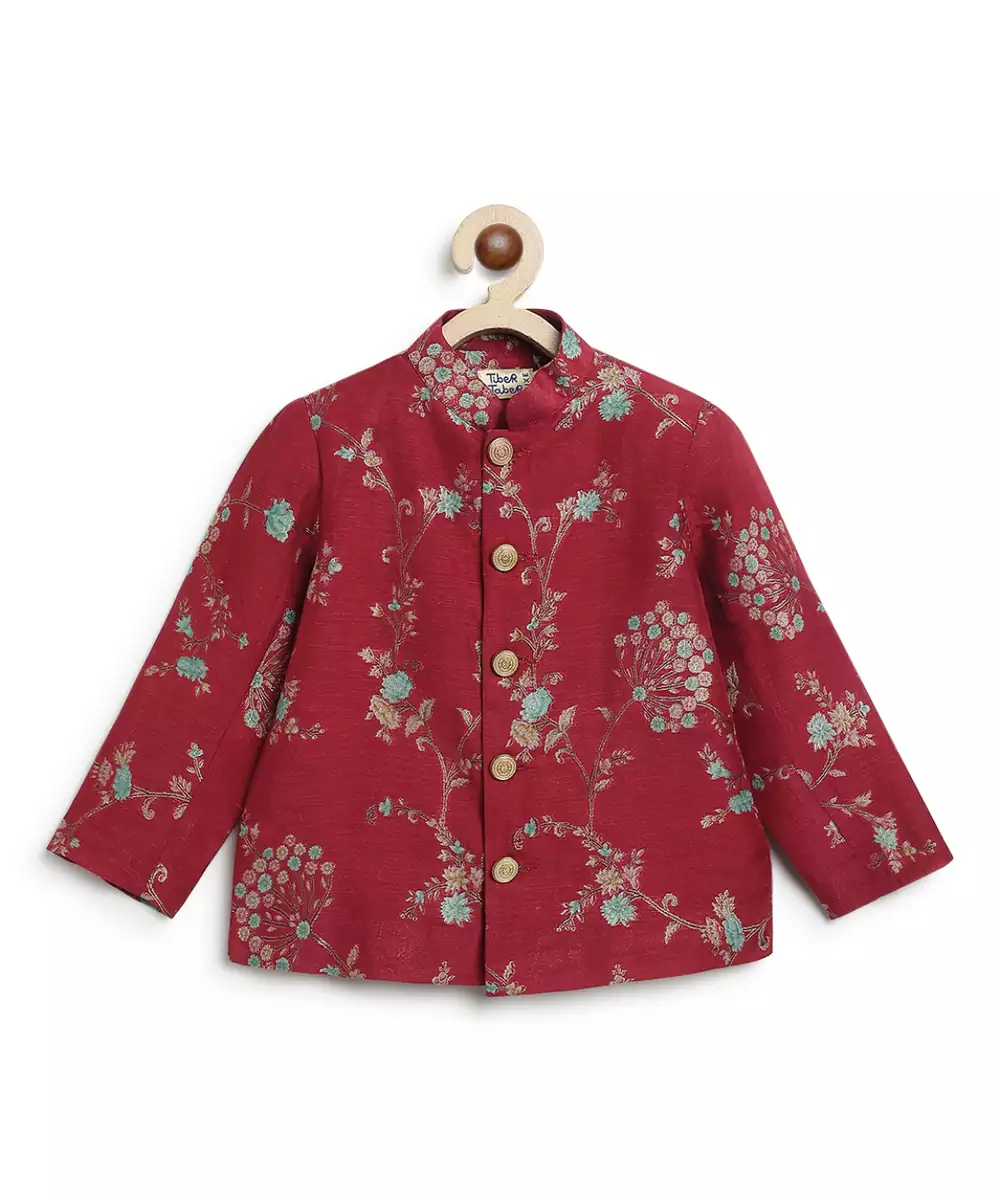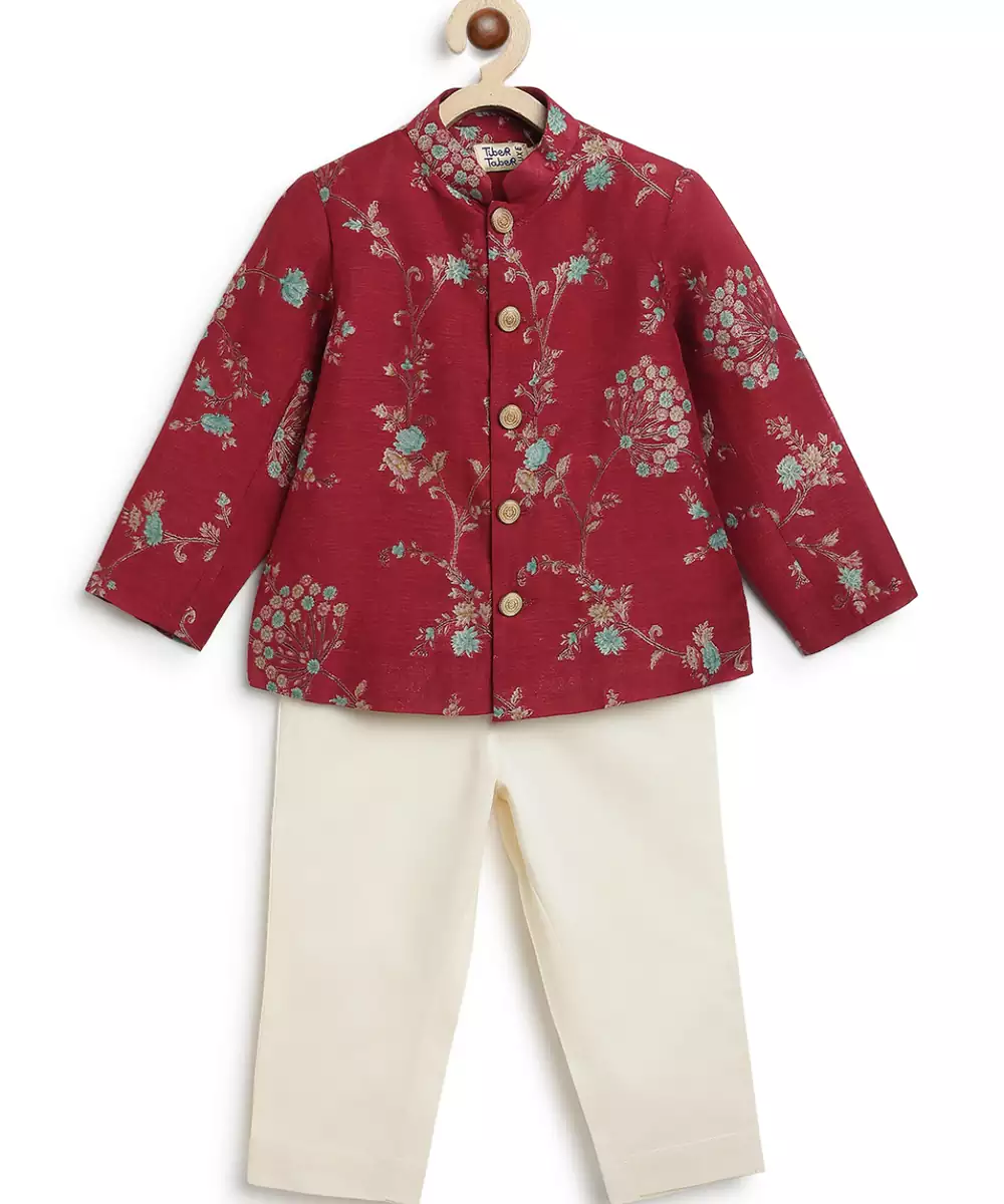 This Red Embroidered Brocade Bandhgala Set Exudes Regal Elegance And Timeless Sophistication. Crafted From Rich Brocade Fabric, It Features Intricate Embroidery That Adds A Refined, Luxurious Touch. Perfect For Weddings And Festive Occasions, It Offers A Polished Silhouette With Classic Traditional Appeal.