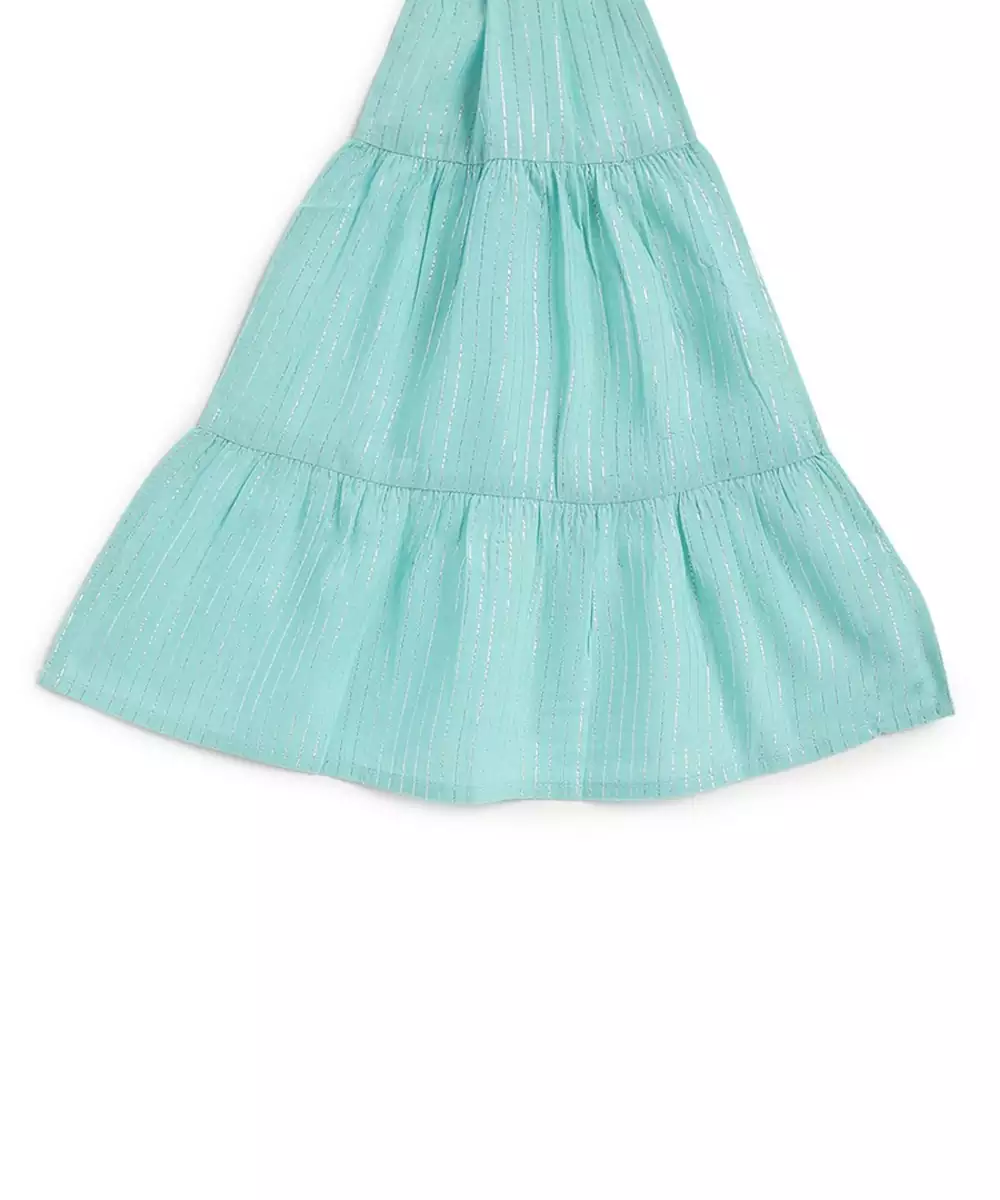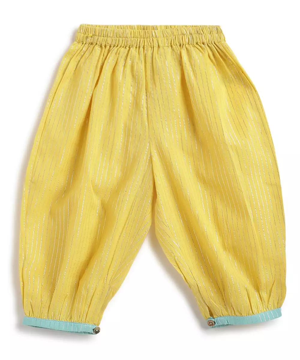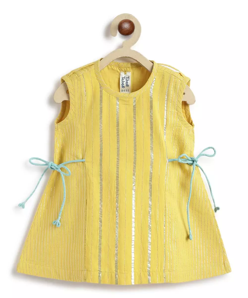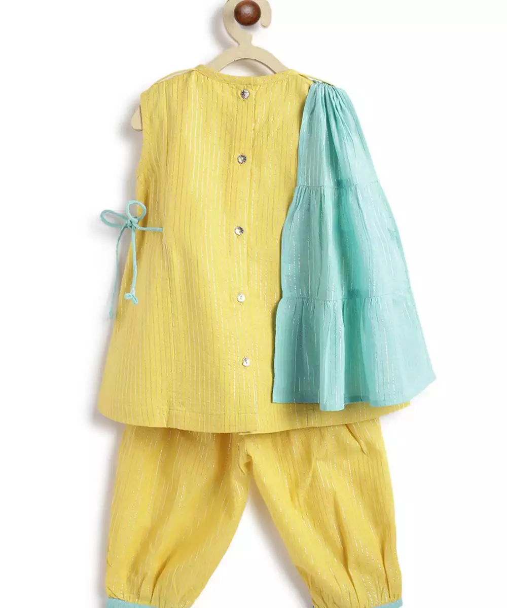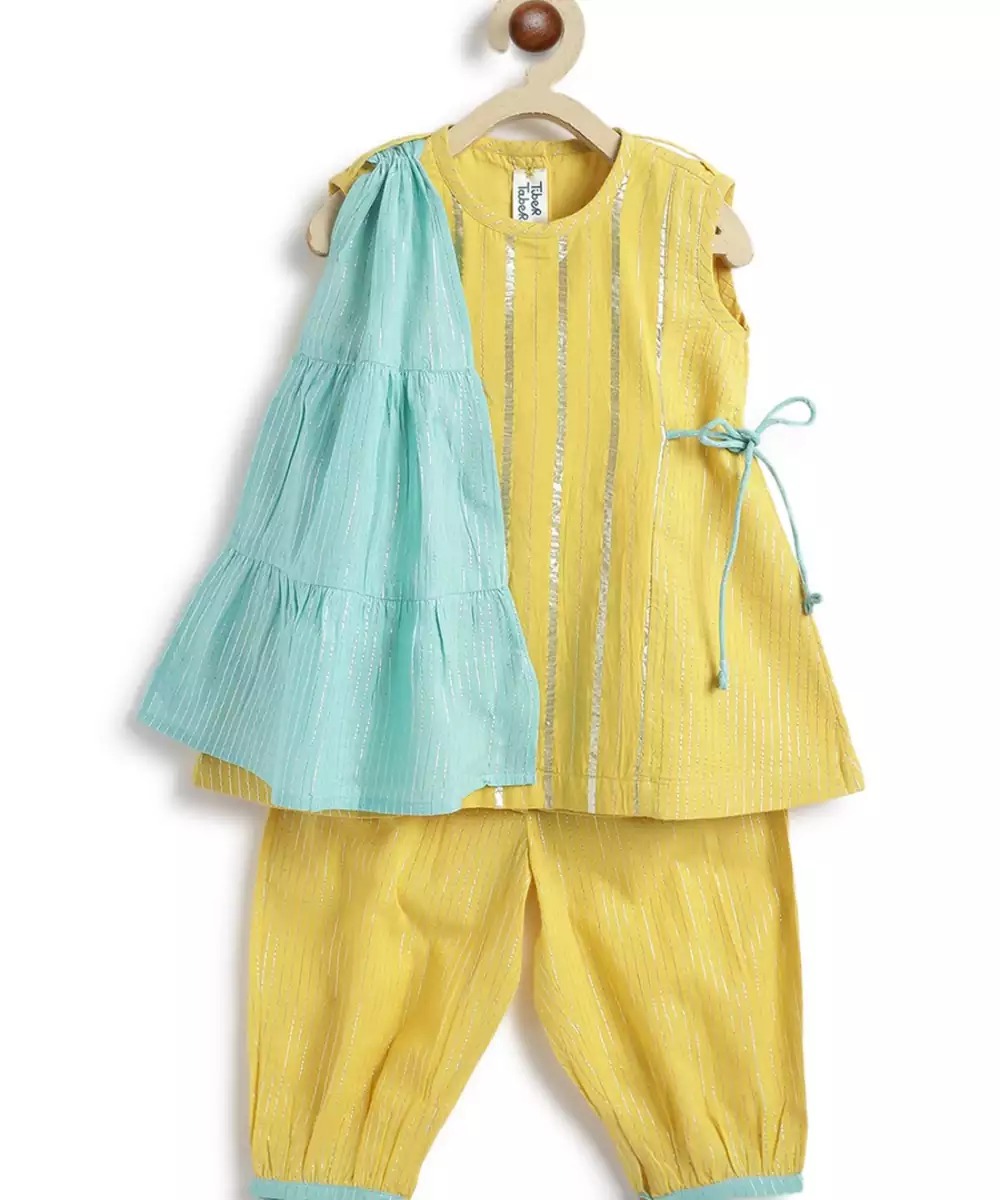 Presenting, Sunshine In The Form Of An Outfit! Doesn’t This Cheerful Yellow 3 Piece Suit Set Screams ‘Festive’? Made From Cotton Blend Fabric With Shimmering Lurex Stripes For Any Kind Of Celebration. The Sleeveless Kurta Is Styled With Adjustable Tie Ups And Paired With Relaxed Fit Salwar. A Contrasting Mint Green Tiered Dupatta Adds That Extra Twirl Worthy Flair. It’s A Vibe—Playful, Bright, And Celebration Ready!