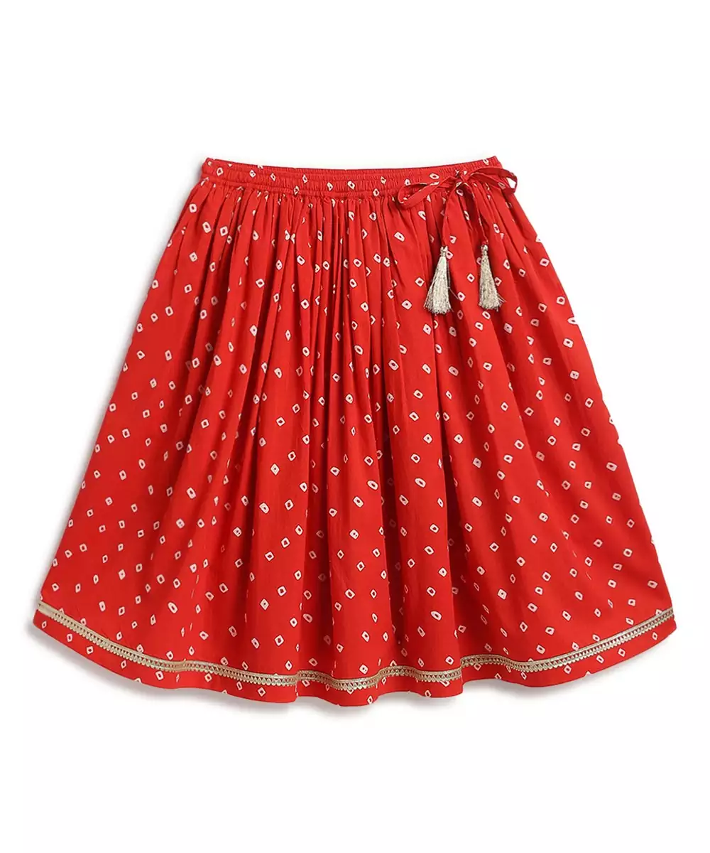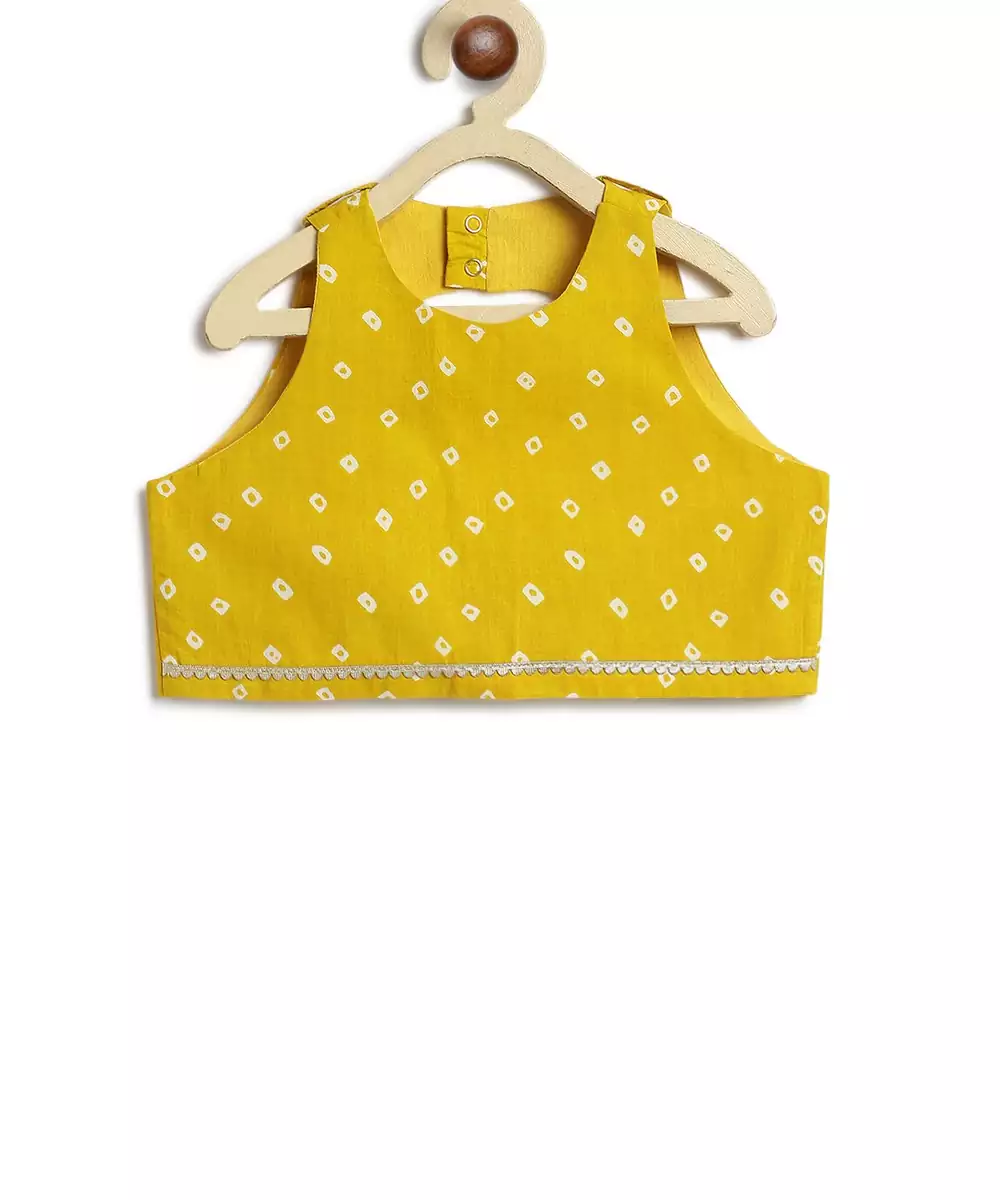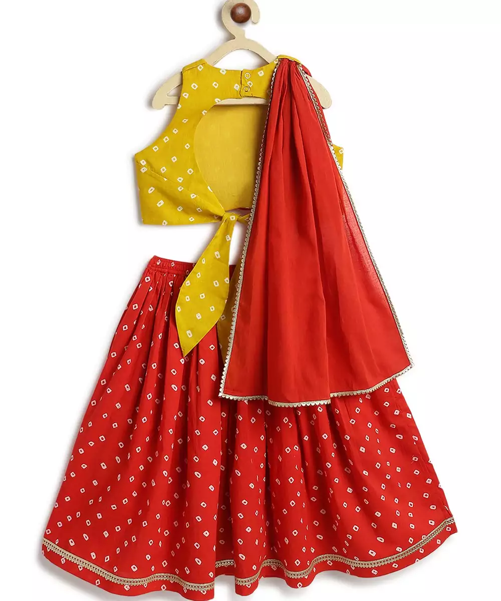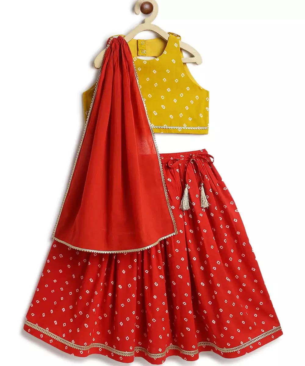 Bright, Festive, And Full Of Charm – This Lehenga Is Made For Twirls And Celebrations! The Vibrant Mustard Blouse (With Shoulder Tabs For Dupatta) Paired With A Striking Red Lehenga Creates A Classic Festive Look. The Delicate Bandhani Inspired Print And Dainty Lace Finishing Make It An Ideal Pick For Weddings, Pujas, And Joyful Family Gatherings.