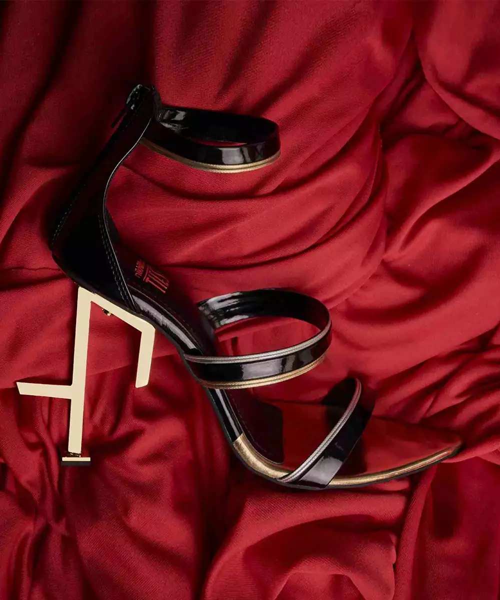Pointed Toe Shoe With Triple Straps Adorned With Gold And Silver Edged Borders, With Nikhil Thampi's Signature Metal Heel. In Line With Commitment To Sustainability, These Shoes Are Crafted Using Vegan Leather.