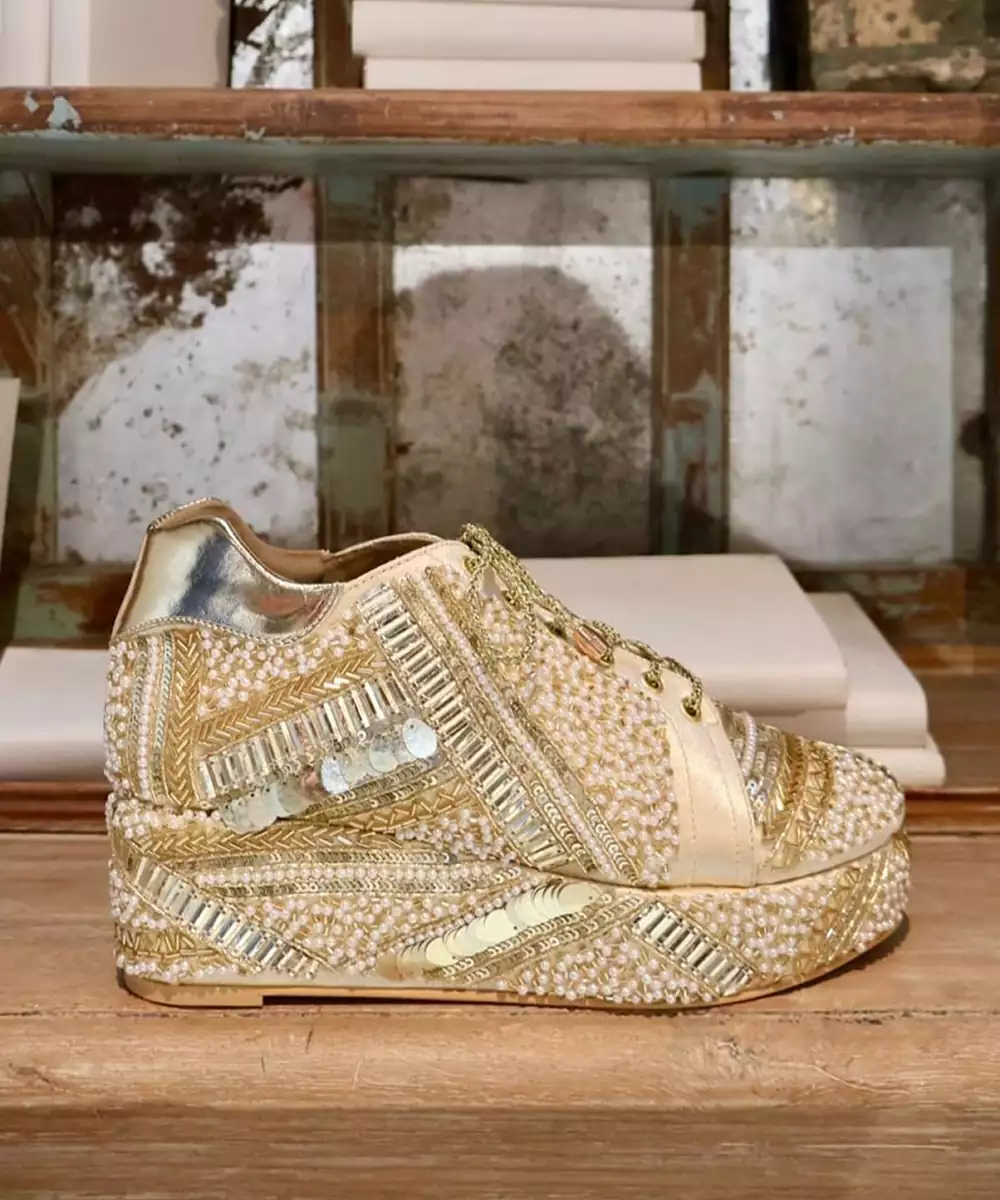 Gold Sneaker Platform Wedges With Sequin, Beads, Cutdana & Pearl Encrustments. Material: Satin Colour: Gold Heel Height(In Inches): 2 2.5 Weight: 1.5 In(Kgs)