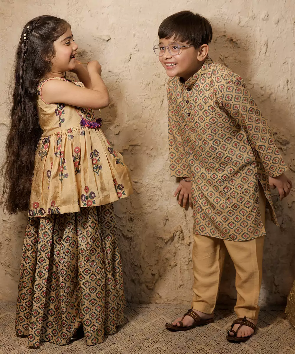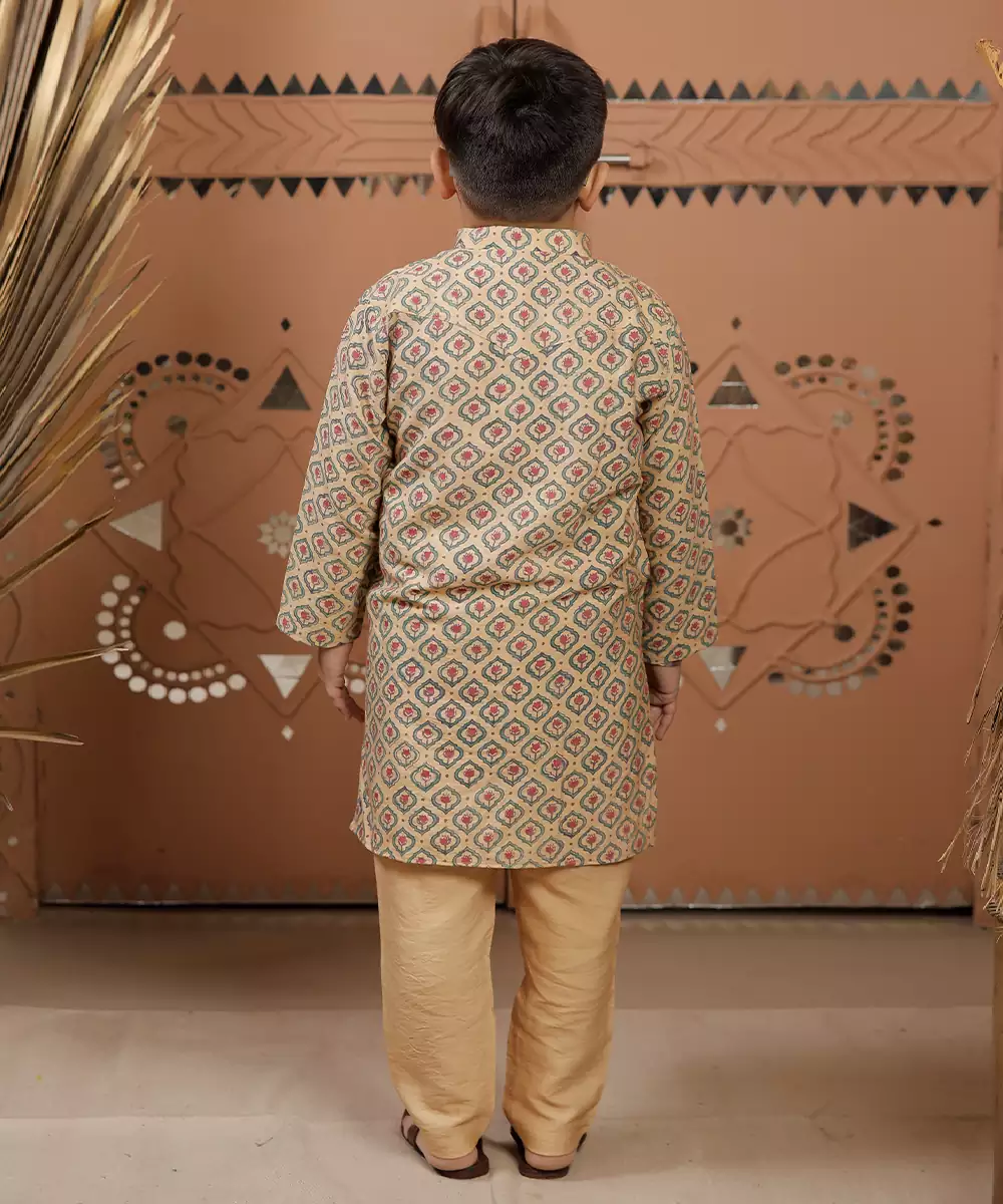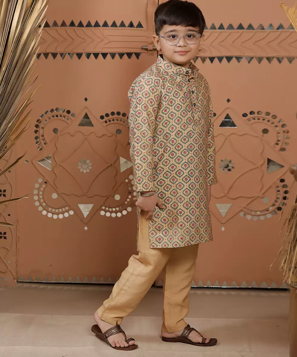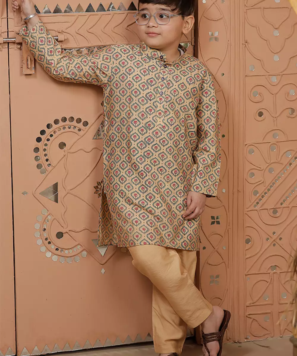 This Beige Cotton Silk Kurta Set Showcases Delicate Prints That Add Charm To Its Understated Tone. The Blend Fabric Ensures Comfort With A Slight Sheen, While The Silhouette Offers Ease Of Wear. Ideal For Casual Or Festive Occasions, It Pairs Effortlessly With Minimal Accessories For A Refined Look.