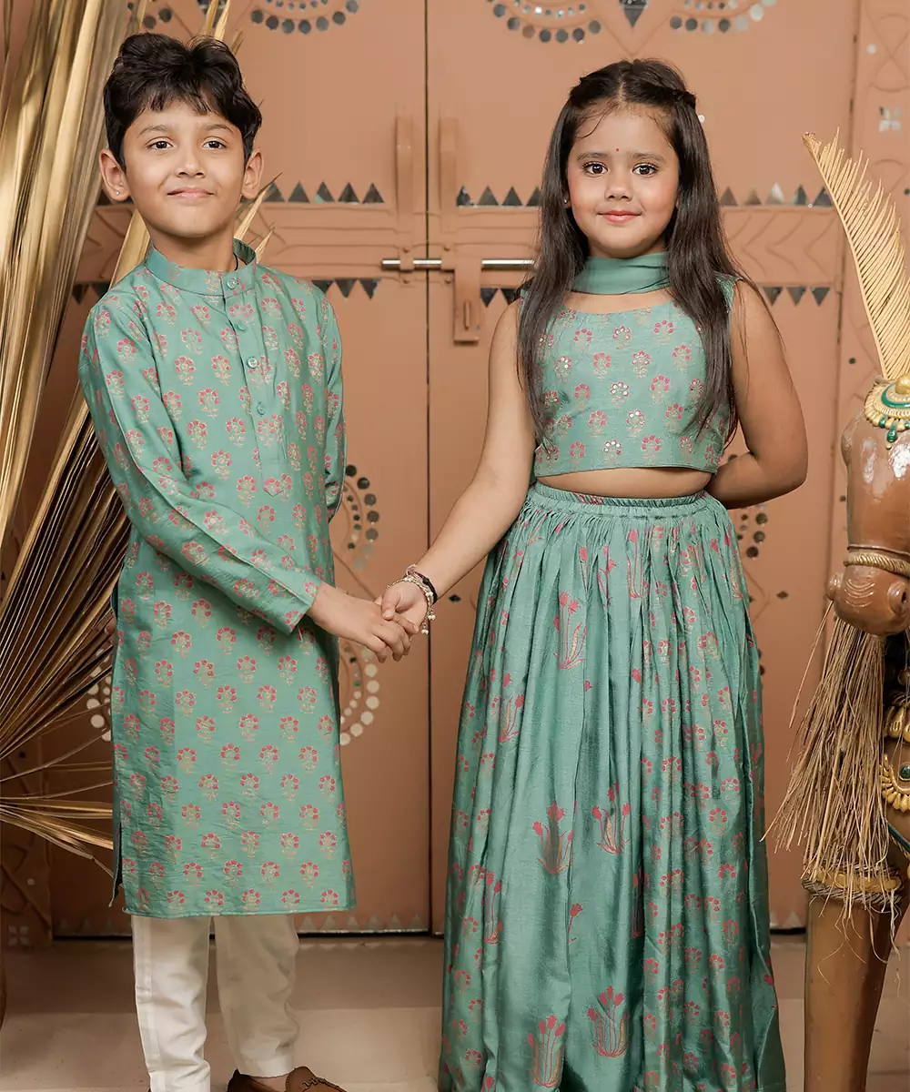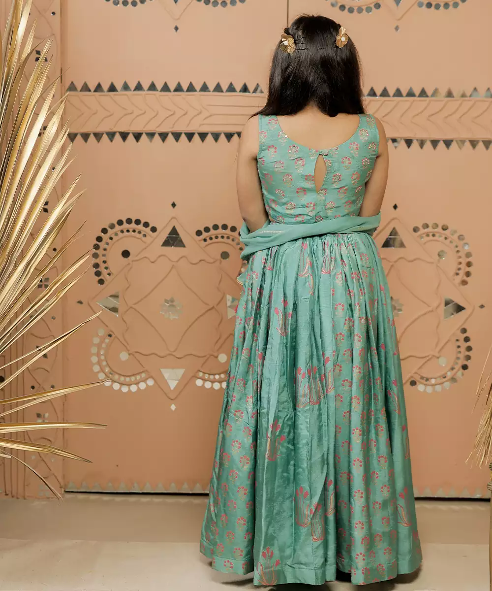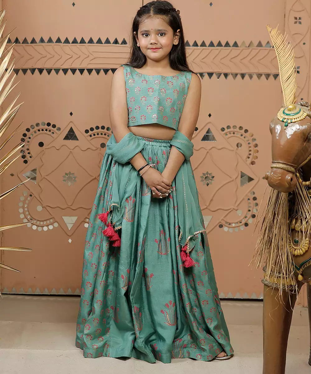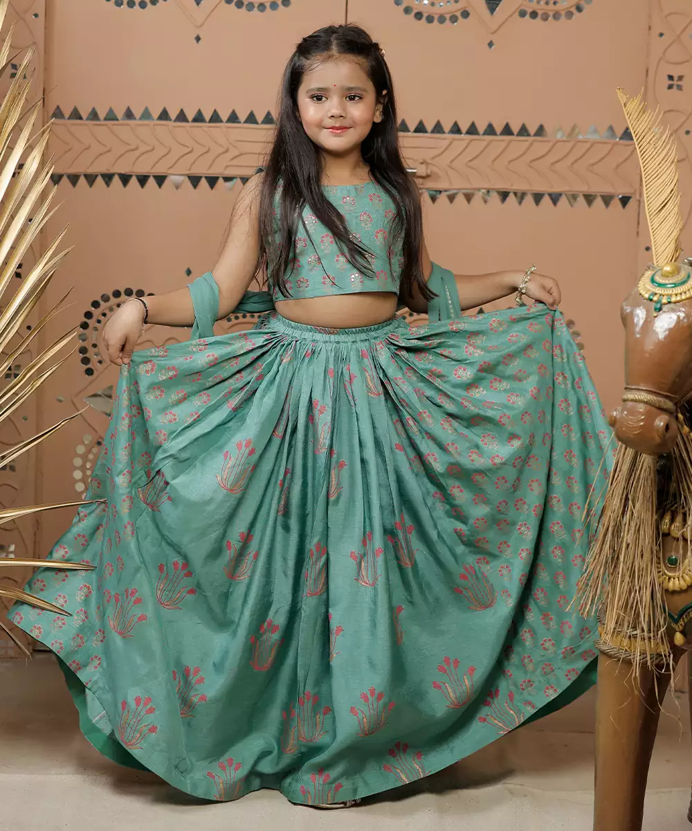This Teal Green Dola Silk Lehenga Set Features Traditional Block Prints That Add Artisanal Charm. The Rich Fabric Offers A Graceful Drape, While The Silhouette Enhances Its Festive Appeal. Perfect For Celebrations, It Pairs Beautifully With Statement Accessories For A Vibrant And Elegant Look.