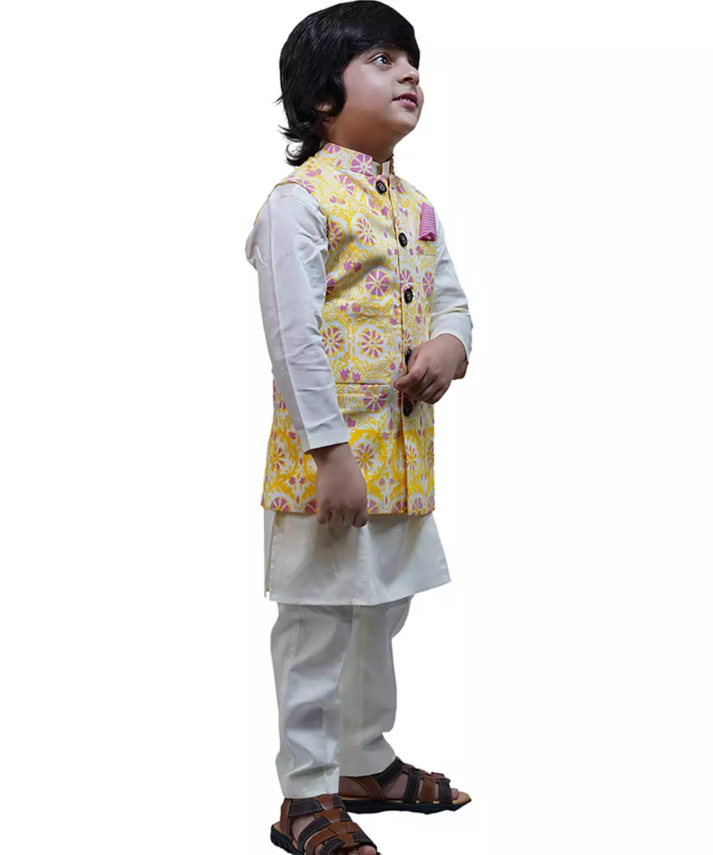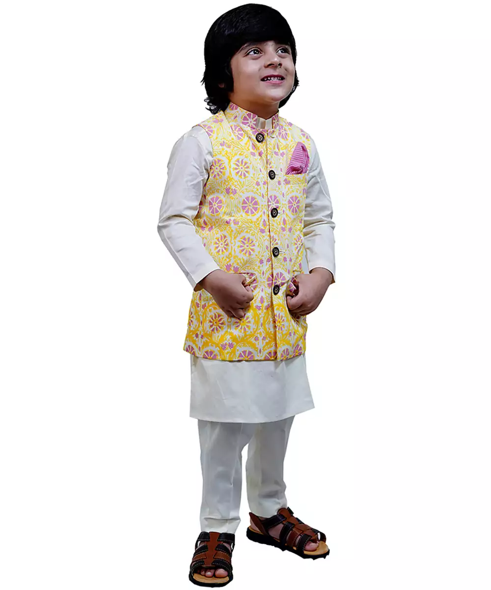 Add Vibrance To Your Festive Wardrobe With This Yellow Printed Cotton Nehru Jacket Set. Crafted From Breathable Cotton Fabric, The Jacket Features Elegant Prints And A Structured Silhouette. Paired With A Matching Kurta And Bottom, This Set Is Perfect For Weddings, Festive Gatherings, And Cultural Celebrations.