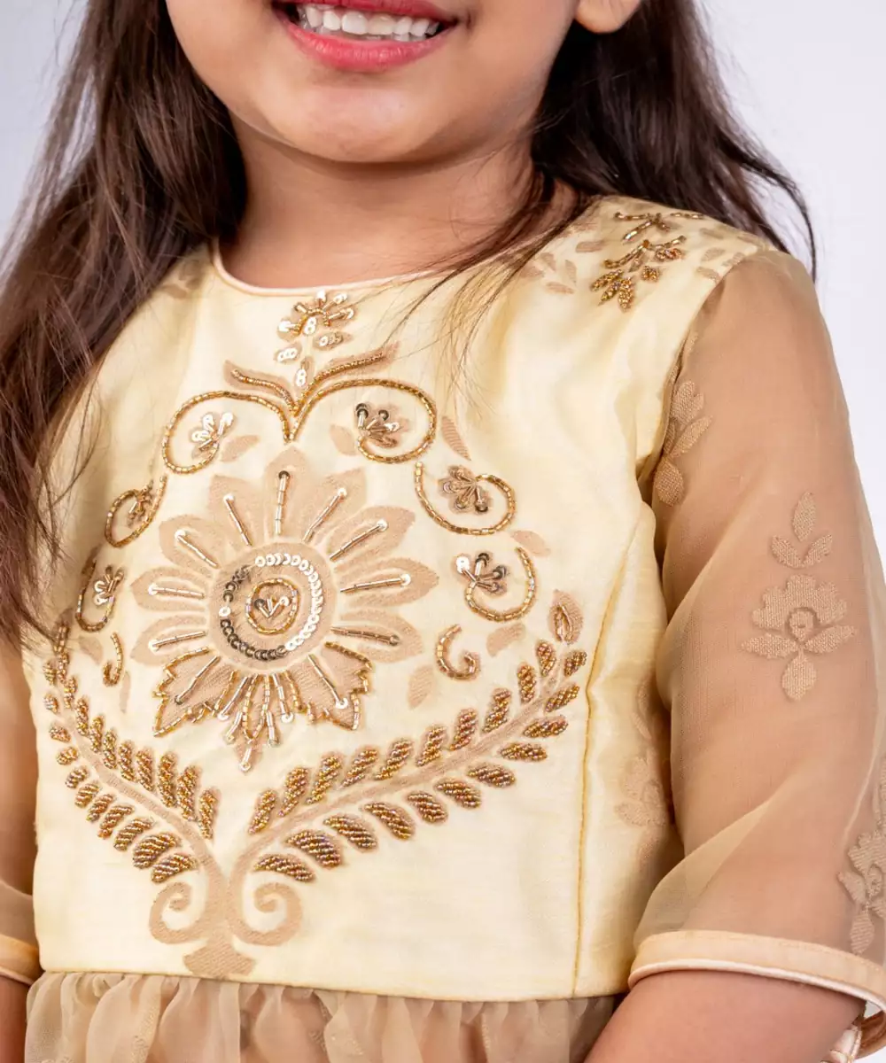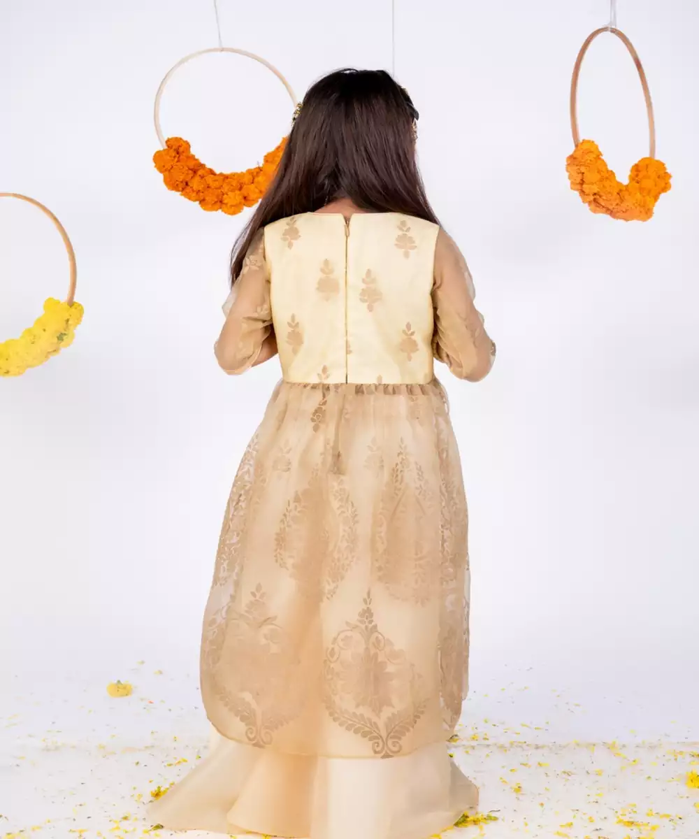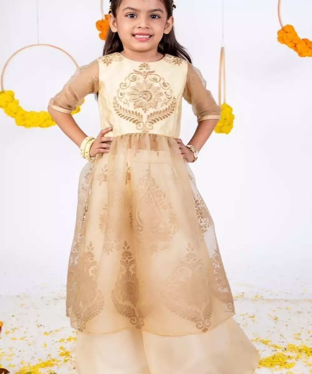 Beige Organza Anarkali With Intricate Gold Self Motifs Woven Throughout, Adding A Touch Of Subtle Glamour. The Yoke Is Beautifully Hand Embellished With Traditional Motifs, Attention To Detail. Paired With A Flowy Organza Palazzo.