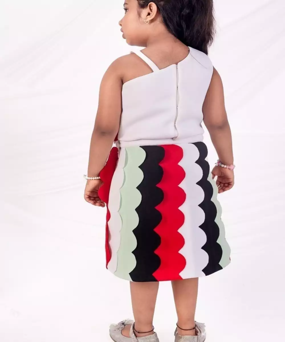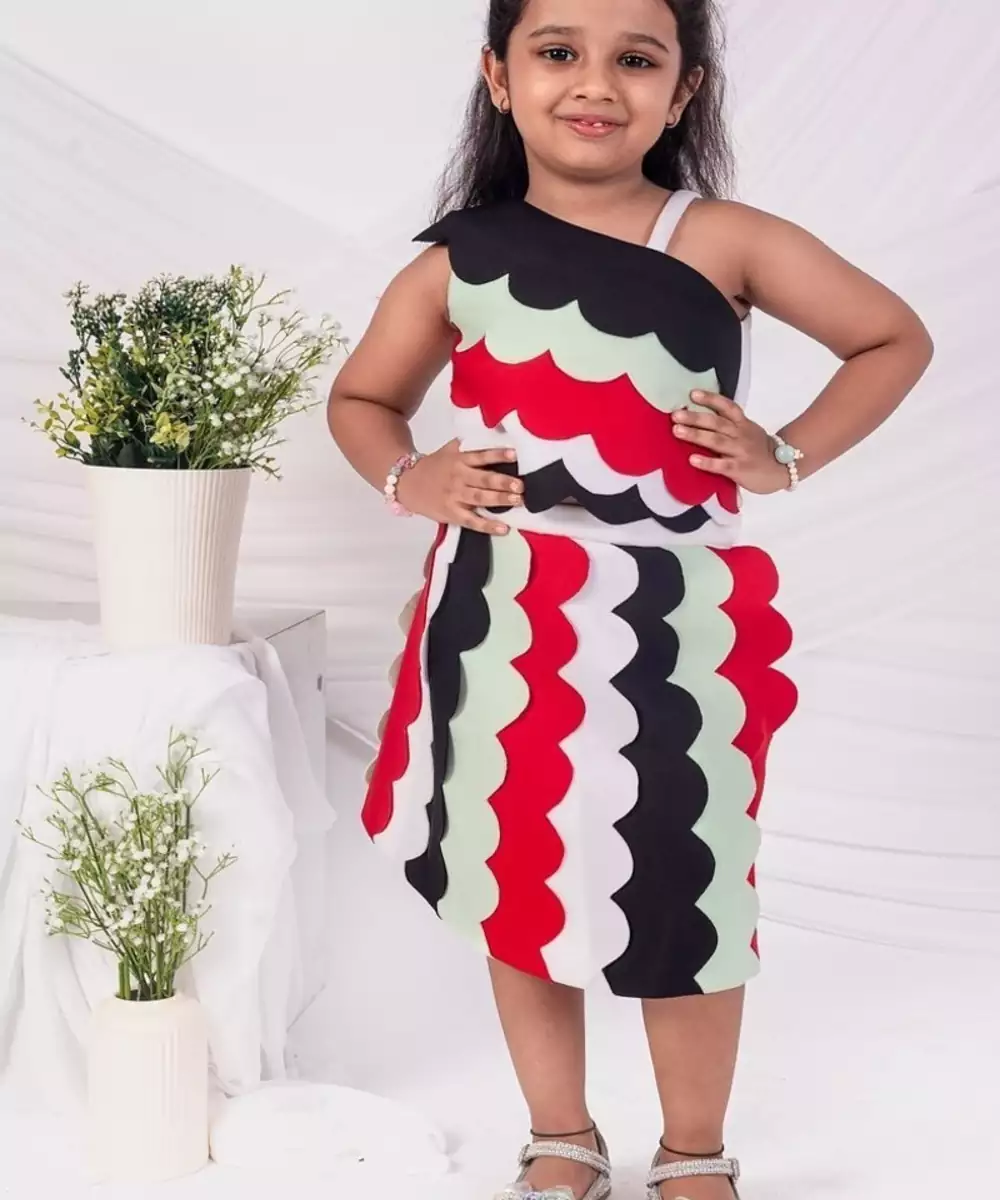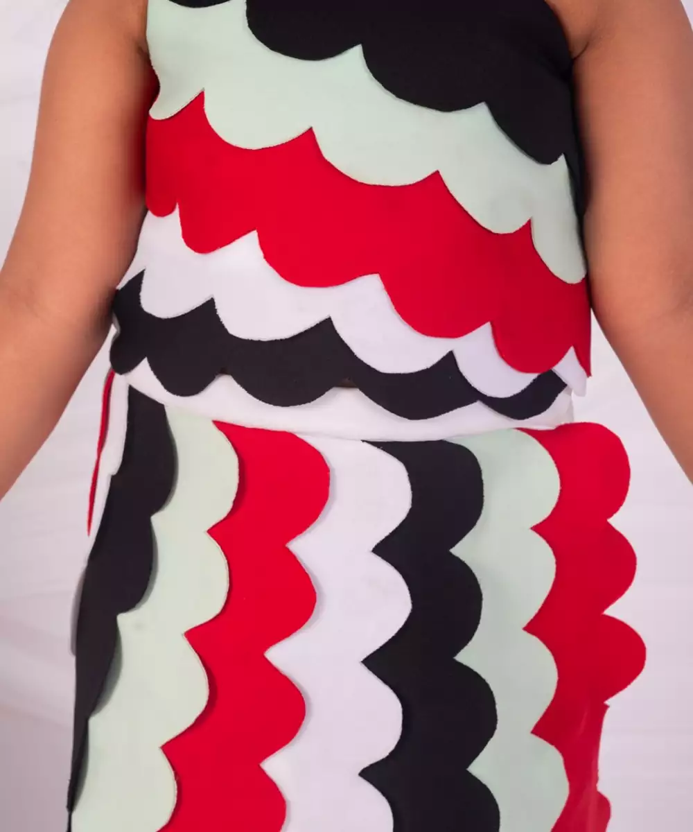 A Quirky And Colorful Two Piece Outfit Made For The Spotlight! Featuring Bold, Layered Scallop Patterns In Red, Mint Green, White, And Black, This Asymmetric Top And Matching Skirt Combo Brings Playful Energy To Any Occasion. Perfect For Fun Outings, Playdate Or Any Other Occasion.