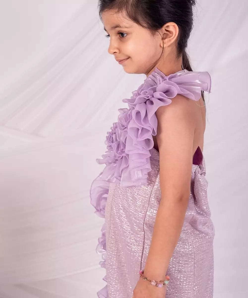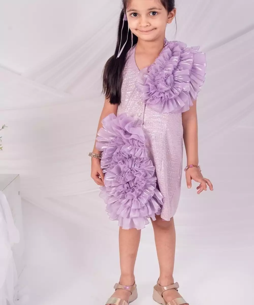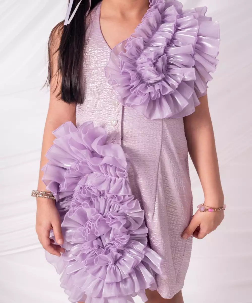 This Dress Features A Shimmering Lavender Fabric That Catches The Light Beautifully, While Two Oversized, Abstract Style Organza Ruffles Add A Dramatic And Elegant Touch. With A Flattering V Neckline And A Comfortable Fit, This Dress Combines Style And Ease For Confident Movement.
