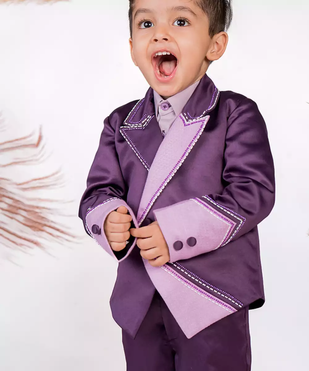 Our Exquisite Three Piece Blazer Set With A Blend Of Purple And Mauve Imported Satin. The Intricate Hand Embroidery On The Sleeves And Lapels Adds A Touch Of Artistry And Exclusivity. Whether You're Attending A Gala, A Wedding, Or A Special Evening Event, This Three Piece Blazer Set Is Sure To Make A Statement.