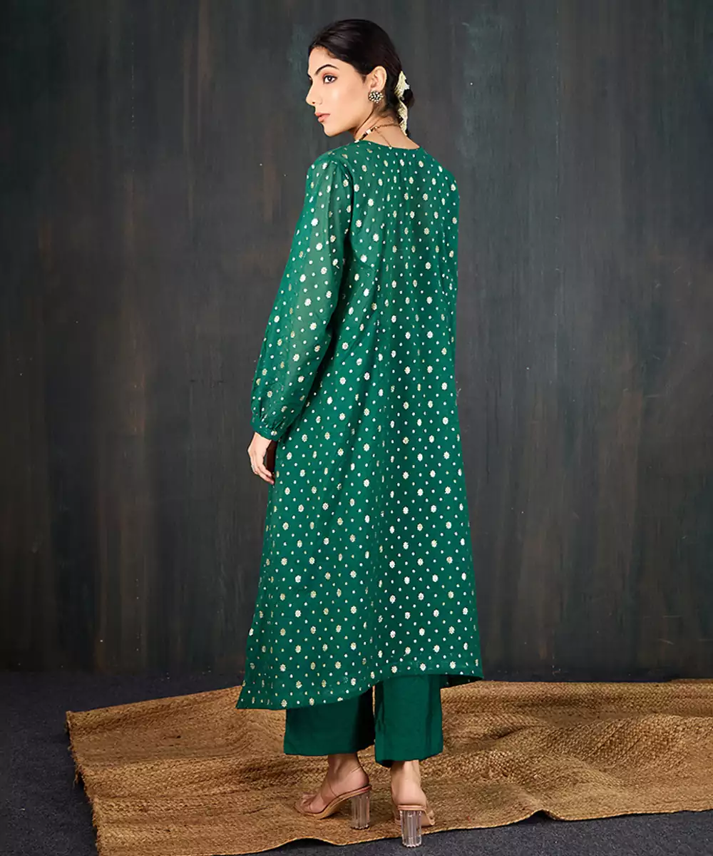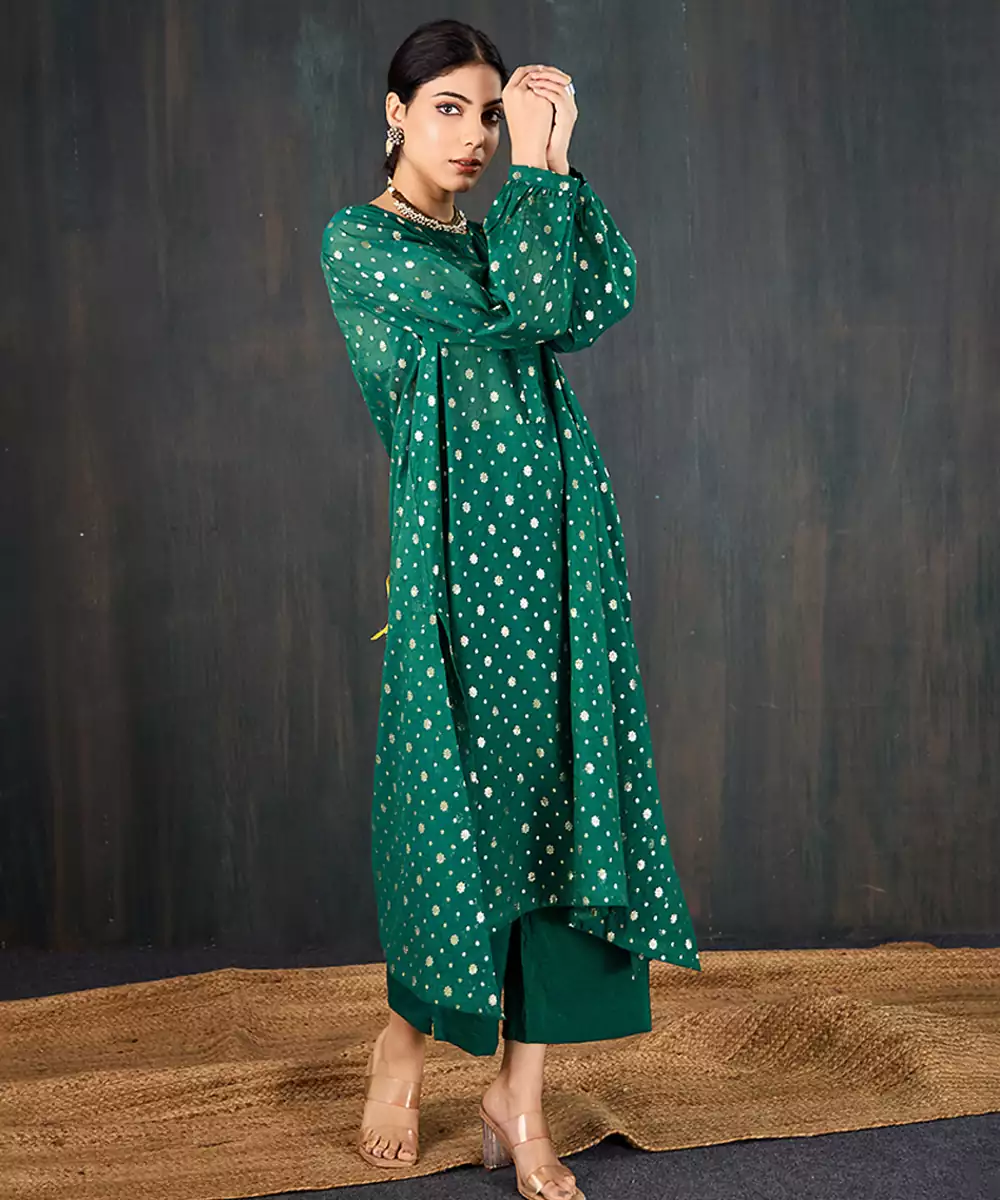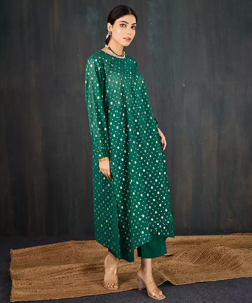 Kurta: A Jewel Toned Green Three Kali Kurta In Our Signature Anar Silhouette. Tailored In Chanderi With Floral Jacquard Woven All Over, It Flows With Anti Fit Ease Yet Falls Elegantly On The Body. The Set Comes With A Sleeveless Inner For Added Comfort And Coverage. Pant: Straight Pants In The Same Green Complete The Look With Clean Structure.