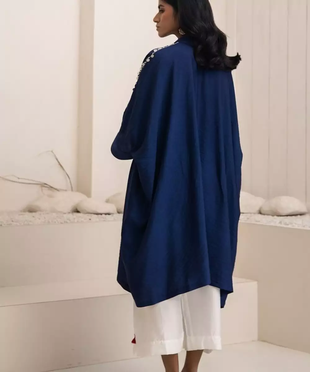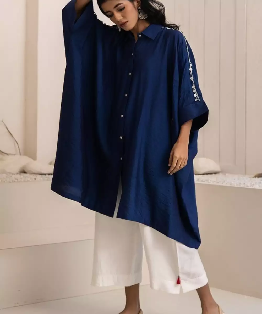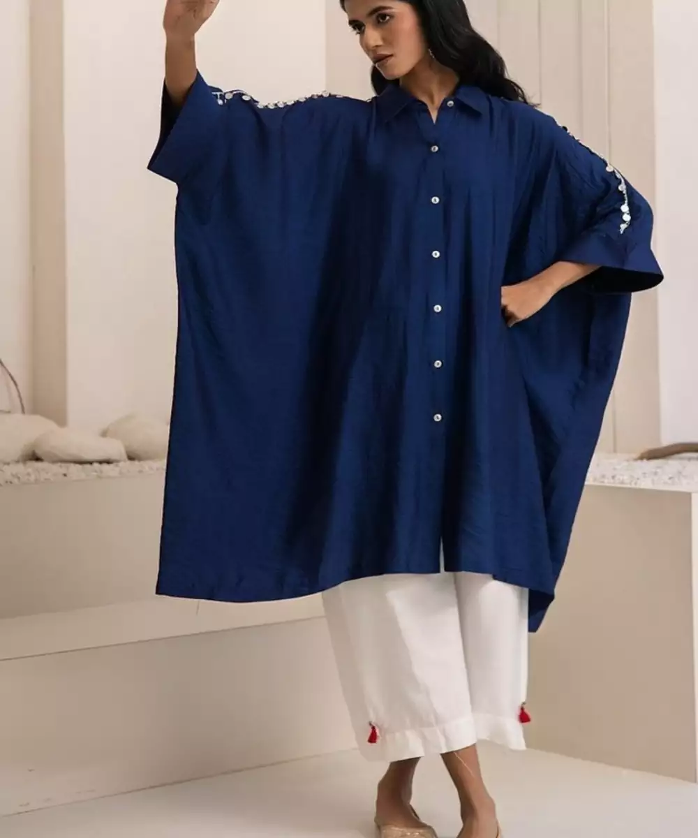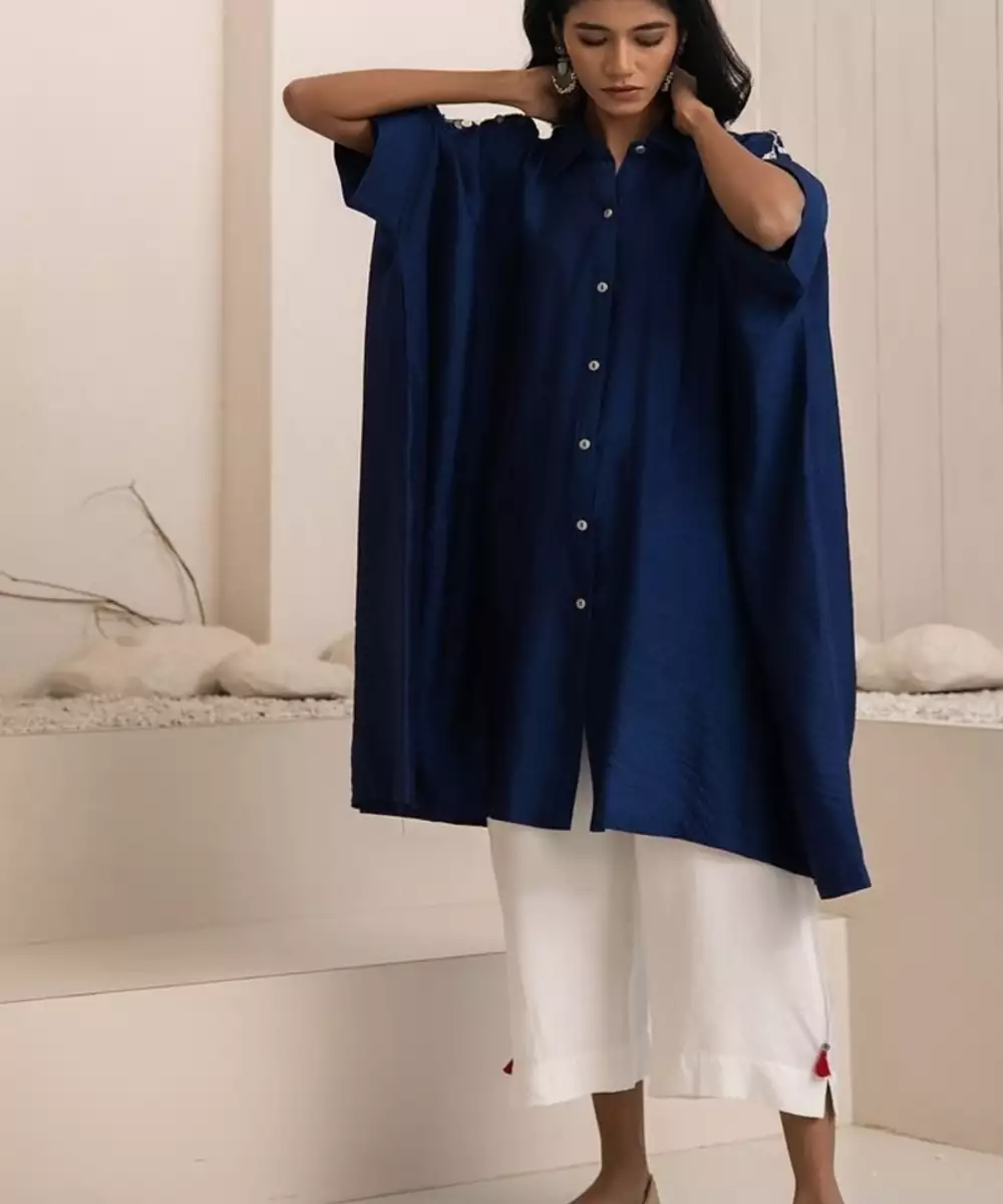 Top: Navy Blue Flowy Loose Fit Shirt Kaftan With Collar Bottom: Ivory Loose Style Pants