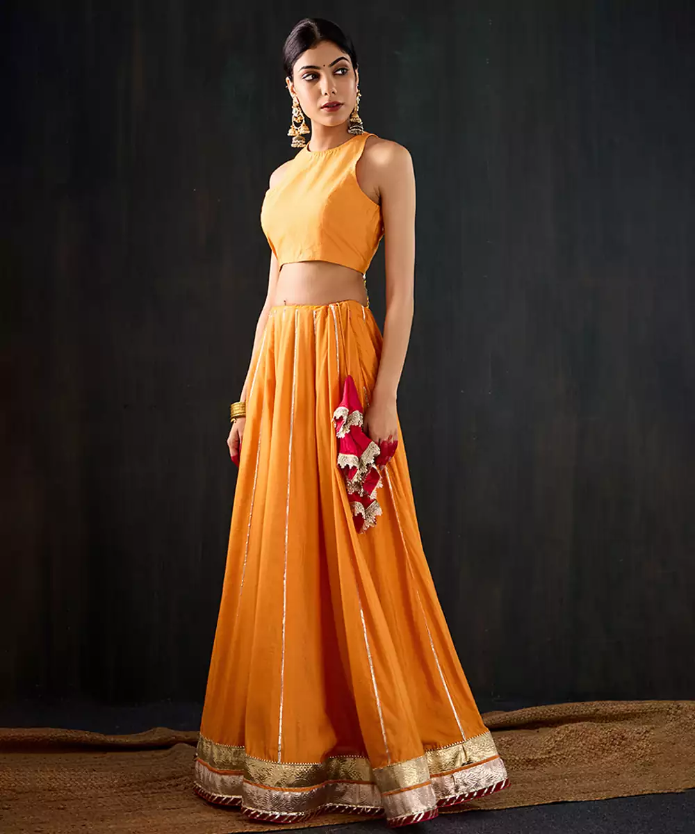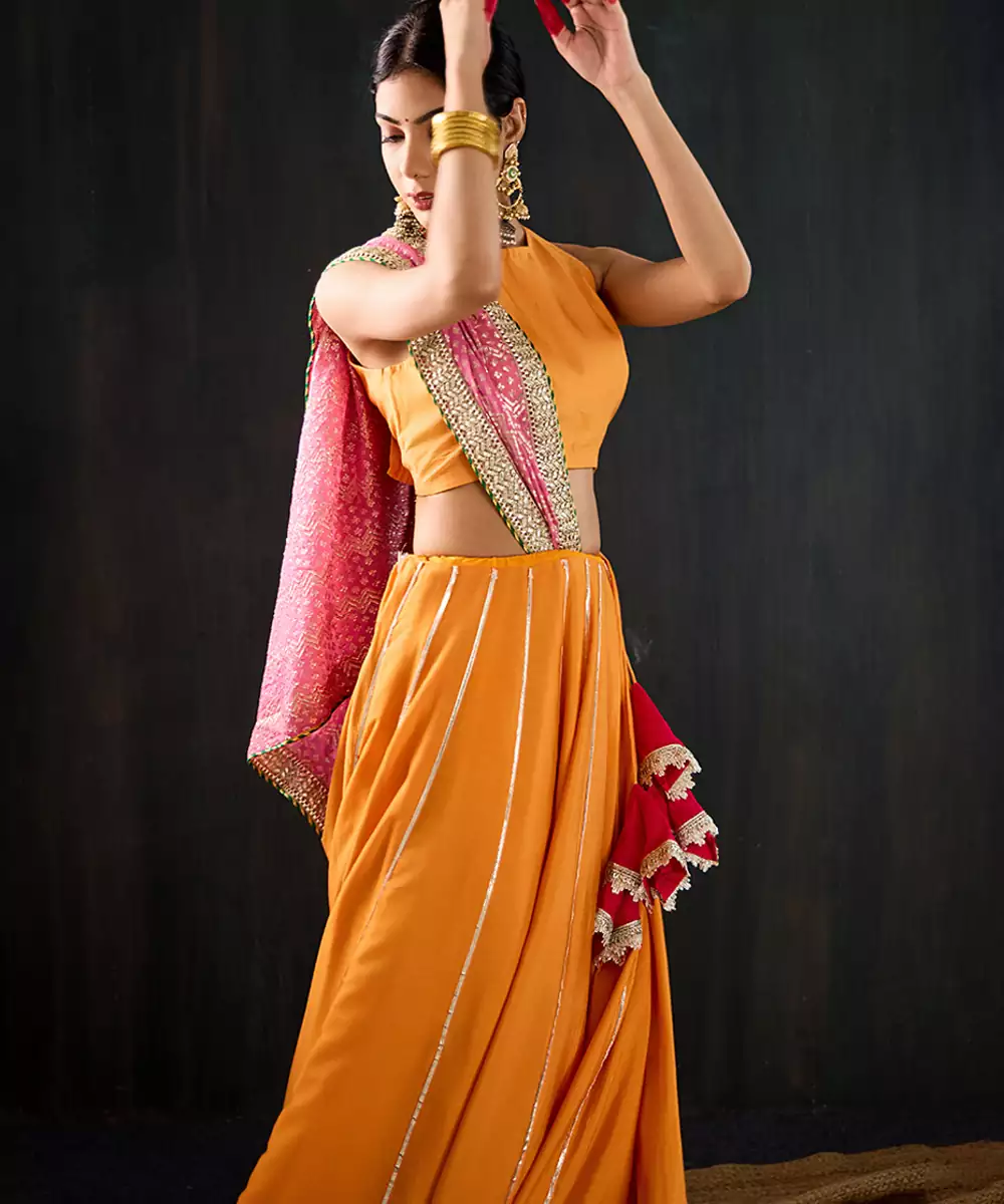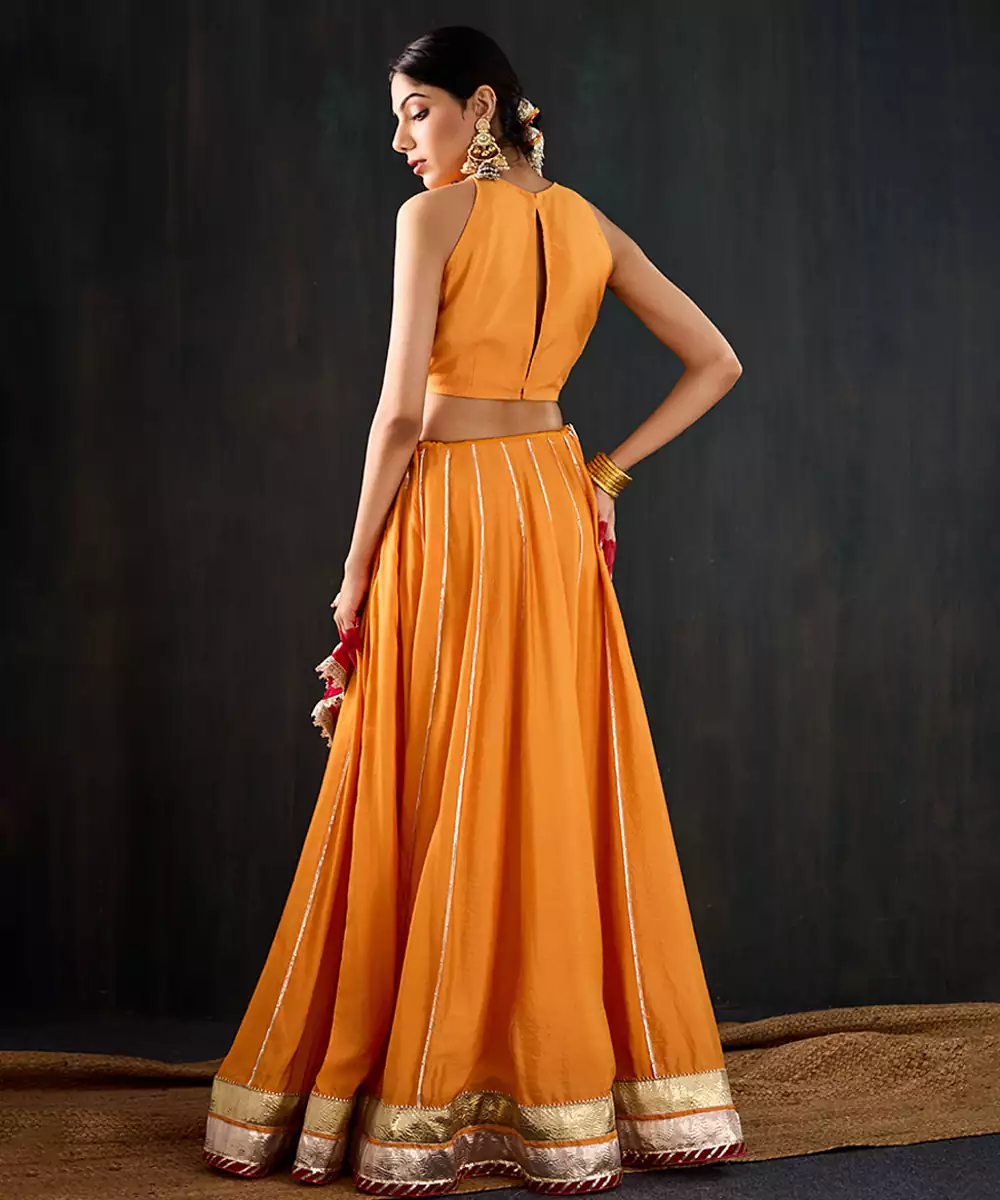 Lehenga: Orange Lehenga Adorned With Gota Work All Over And Pretty Latkans On The Sides.Blouse: Orange Sleeveless Blouse.Dupatta: Statement Contrast Chanderi Dupatta In Pink With Leheriya Jacquard Work And Gota Lace Detailing.Pairing & Occasion: Ideal For Weddings, Festive Celebrations, Or Special Occasions. Pair With Statement Earrings, Bangles, And Juttis For A Traditional Look, Or Heels For A Modern Festive Style.