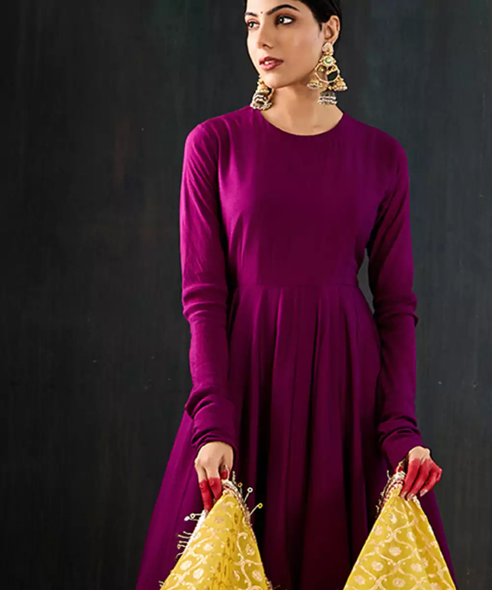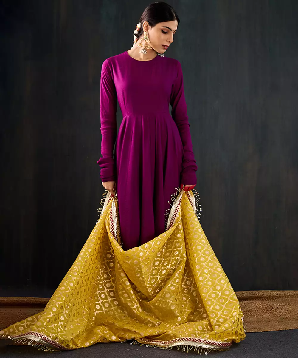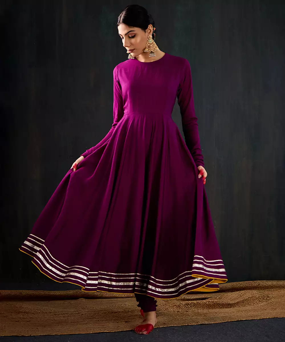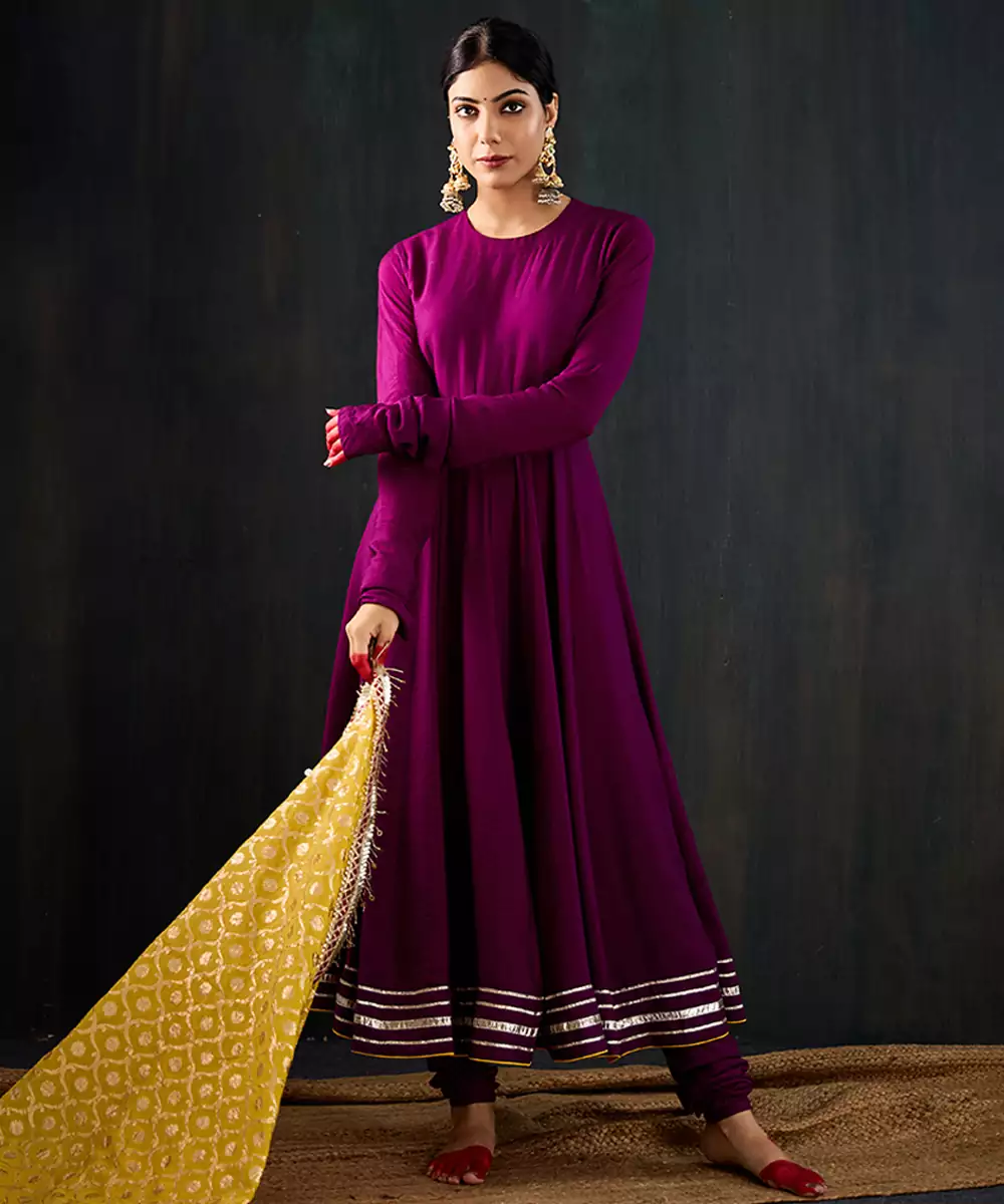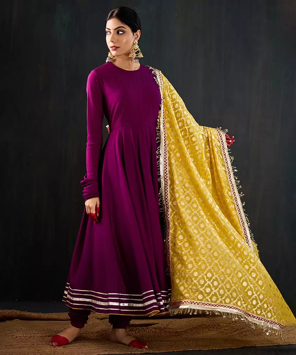 Kurta: Purple Anarkali With Delicate Gota Work Along The Hem. Features A Simple Front Neckline And A Wide Open Back With A Pretty Latkan Tie Up. Made In Soft, Flowy Fabric For A Comfortable And Elegant Fit. Pant: Simple Churidar That Goes Perfectly With The Kurta. Dupatta: Statement Contrast Yellow Chanderi Dupatta With Jaal Jacquard Work, Jhallar, And Red Gota Lace Detailing.