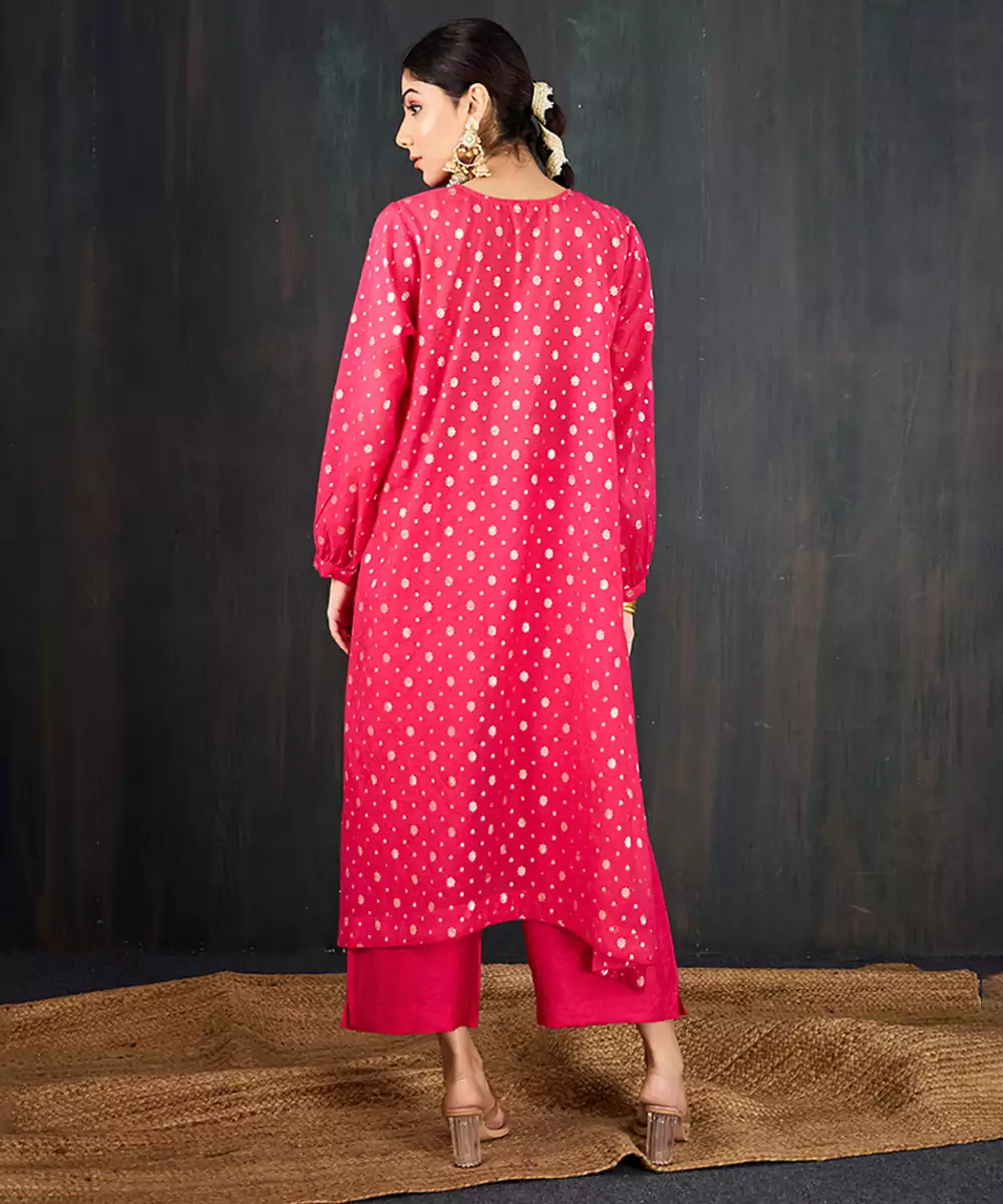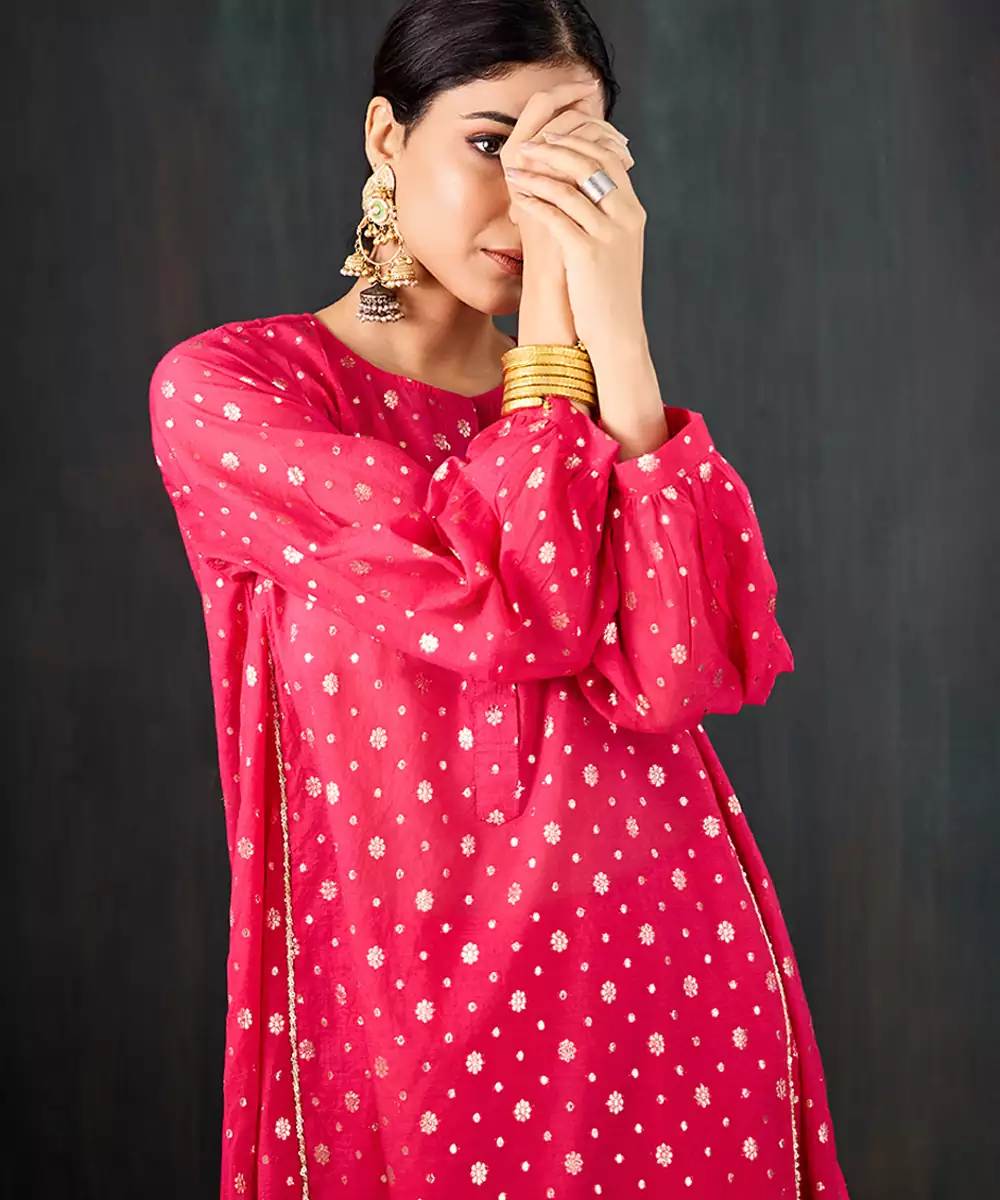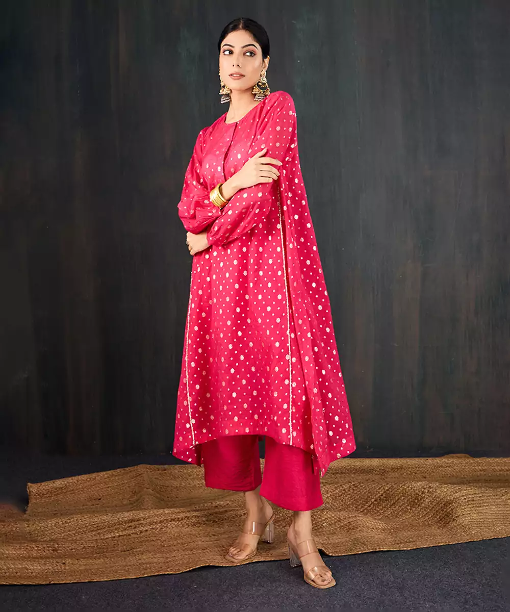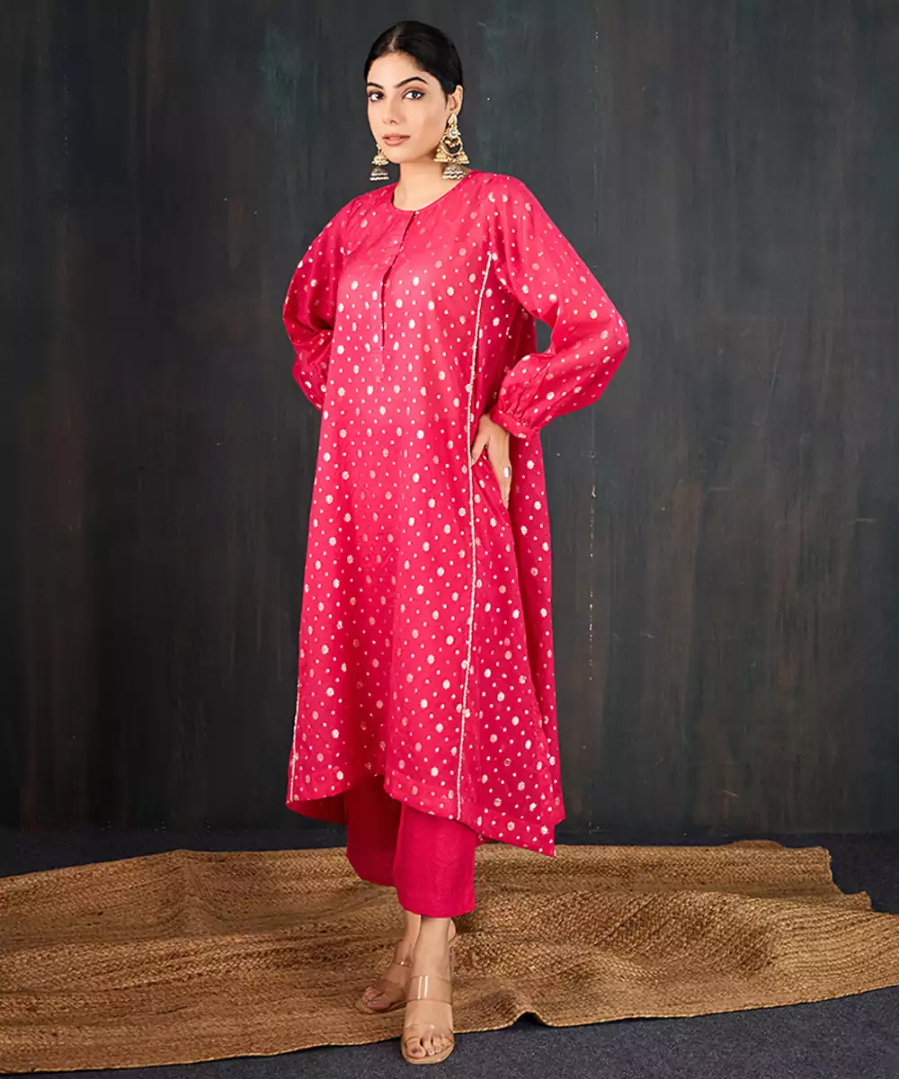 Kurta: A Pink Three Kali Kurta In Our Signature Anar Silhouette. Crafted In Chanderi With Delicate Floral Jacquard Work All Over, It Drapes With Anti Fit Ease Yet Falls Elegantly On The Body. Zari Stitch Detailing Along The Front Kali Adds Subtle Festive Shimmer. Pant: Straight Pants In The Same Shade Complete The Set With Balance And Simplicity.