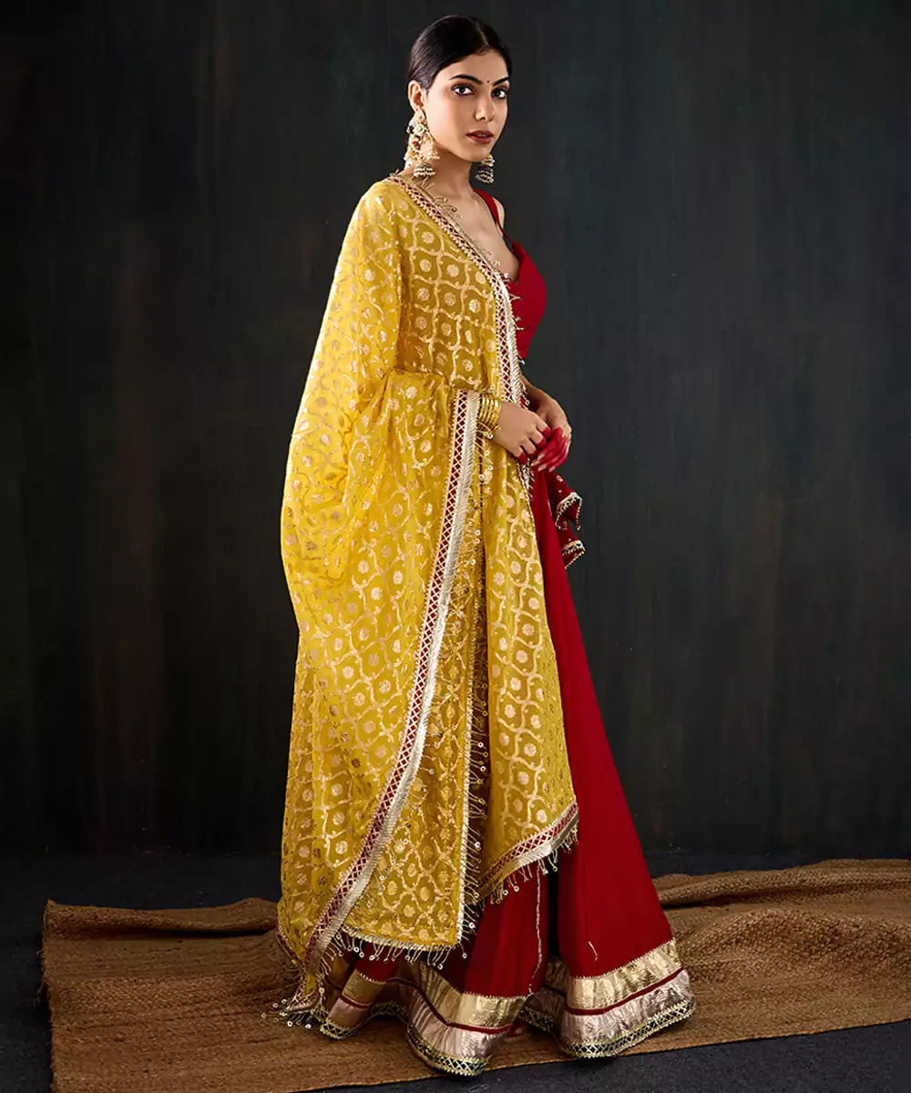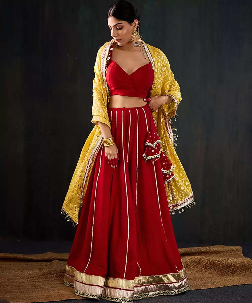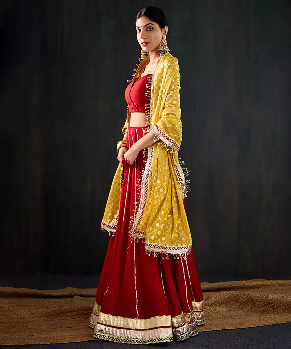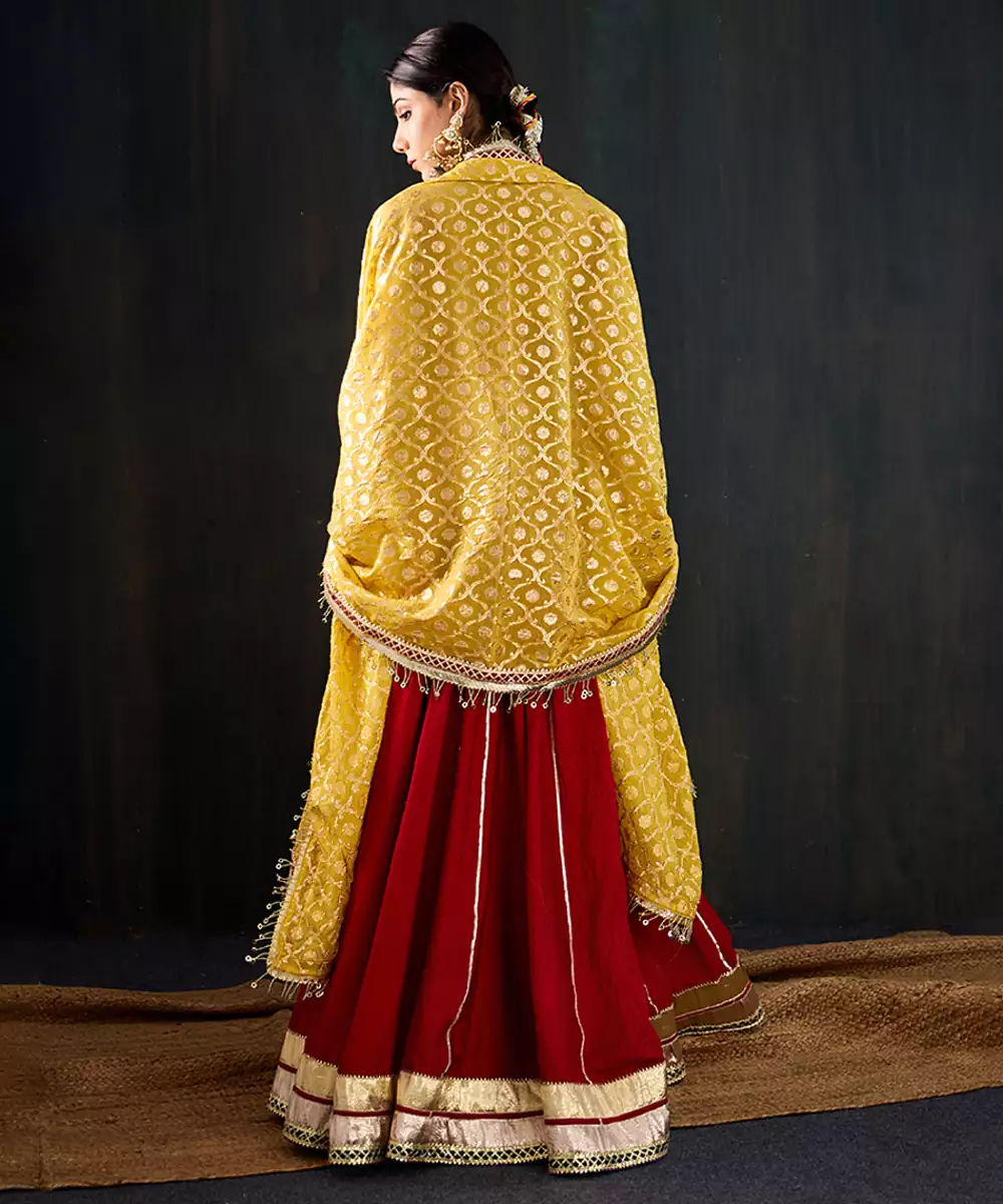 Lehenga: Red Lehenga Adorned With Gota Work All Over And Pretty Latkans On The Sides.Blouse: Red Sleeveless Blouse.Dupatta: Statement Contrast Yellow Chanderi Dupatta With Jaal Jacquard Work, Jhallar, And Red Gota Lace Detailing..Pairing & Occasion: Ideal For Weddings, Festive Celebrations, Or Special Occasions. Pair With Statement Earrings, Bangles, And Juttis For A Traditional Look, Or Heels For A Modern Festive Style.