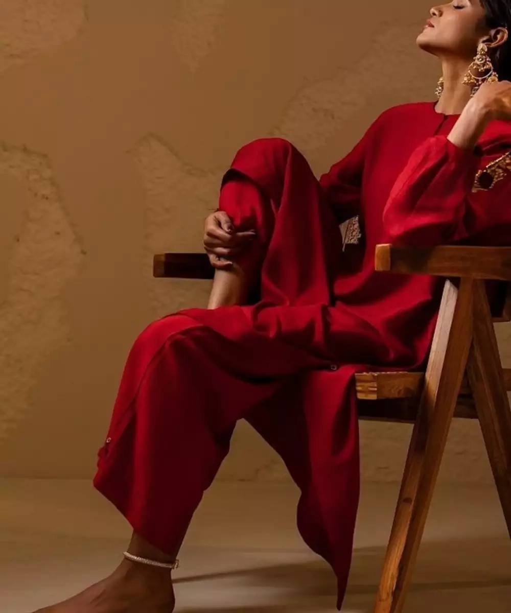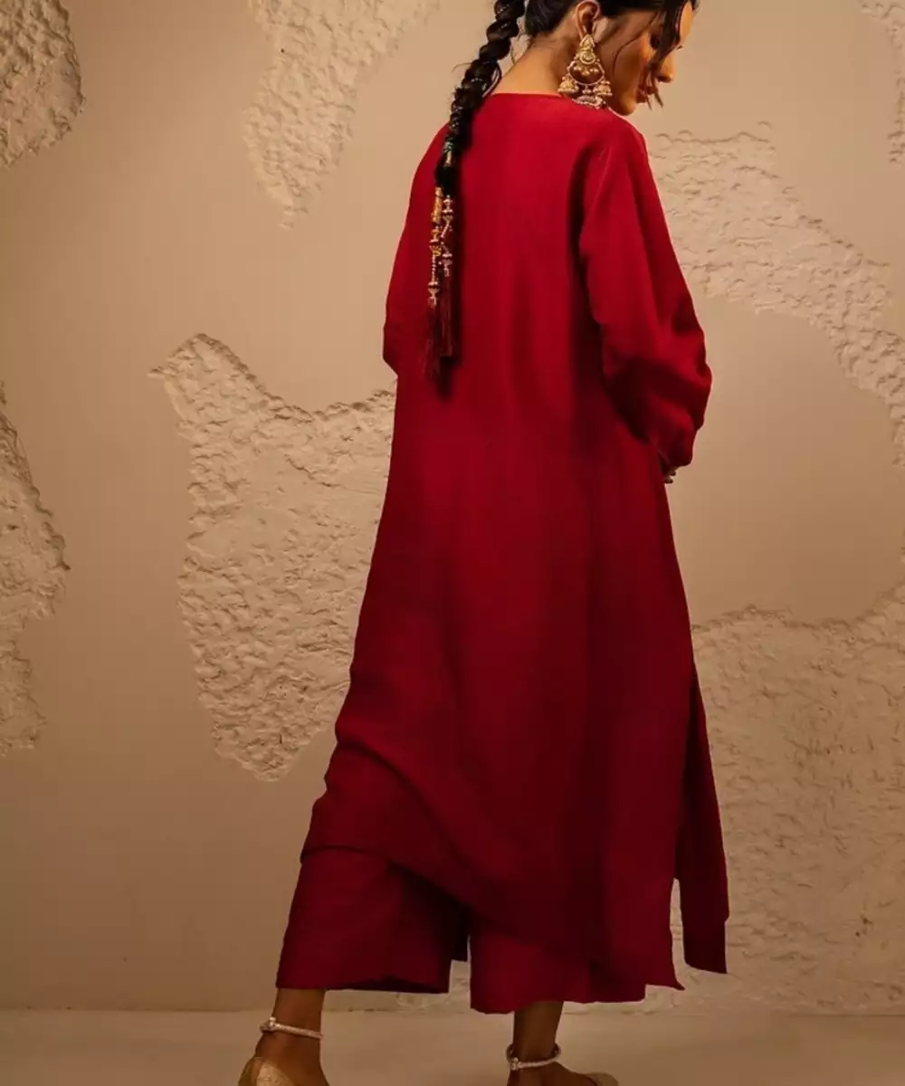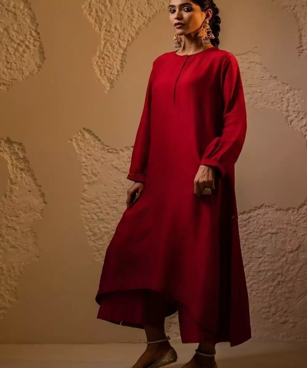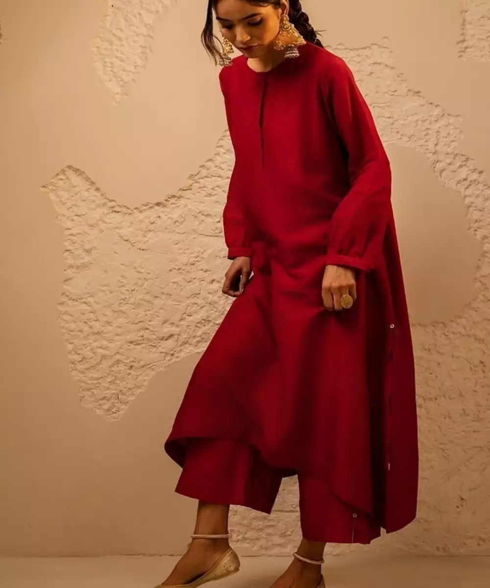 Top: Red Flowy Loose Fit A Line Kurta With Bracelet Gathered Sleeves Bottom: Red Loose Style Pants