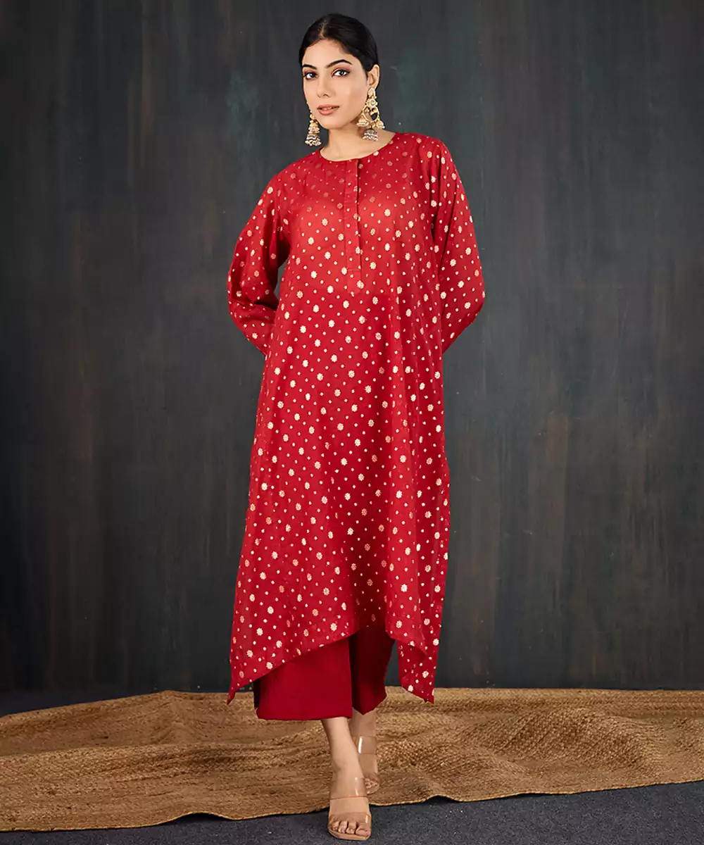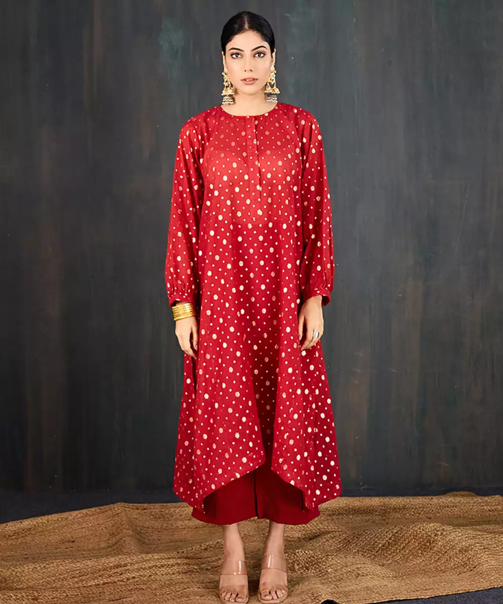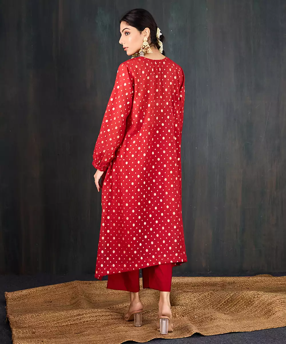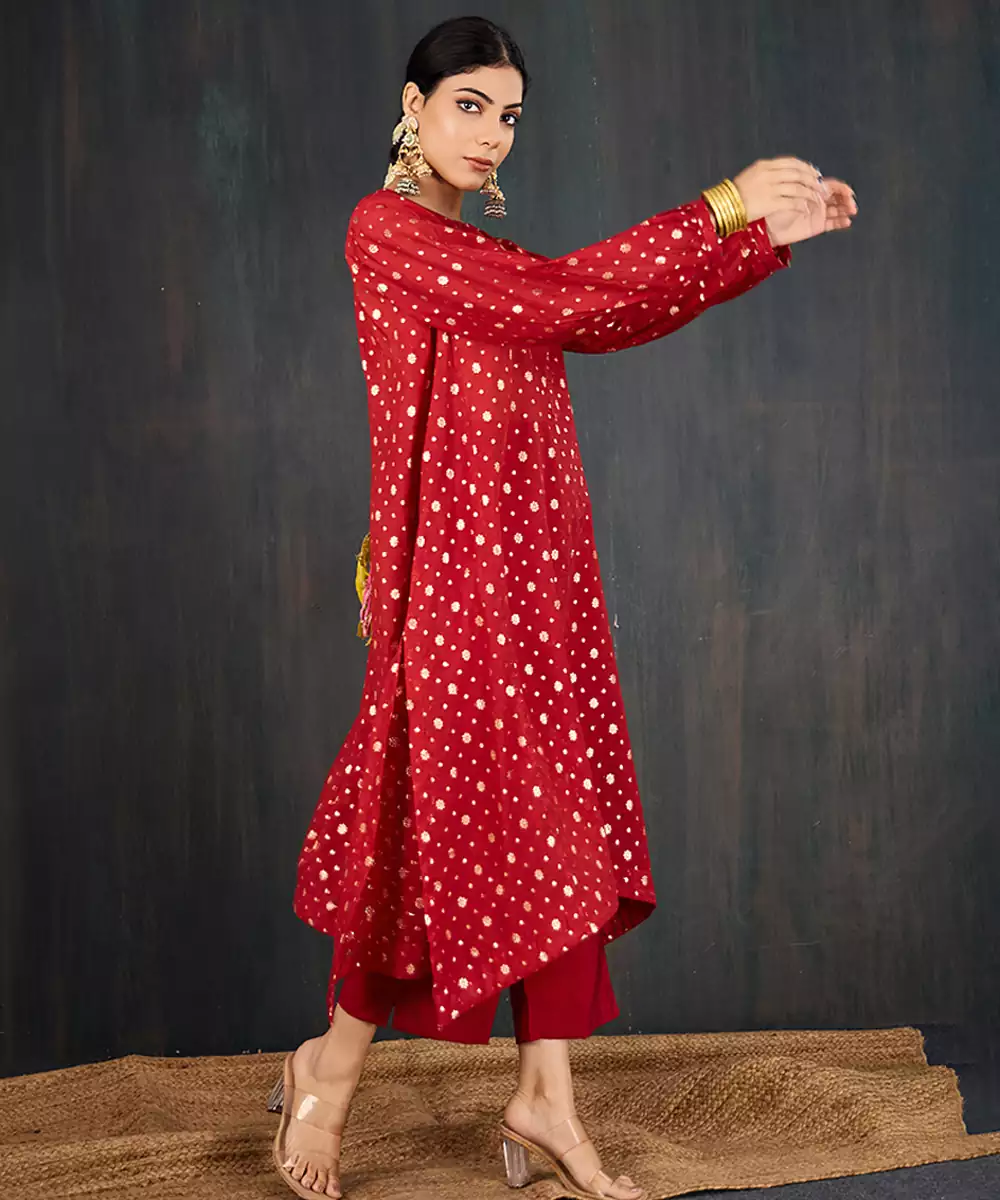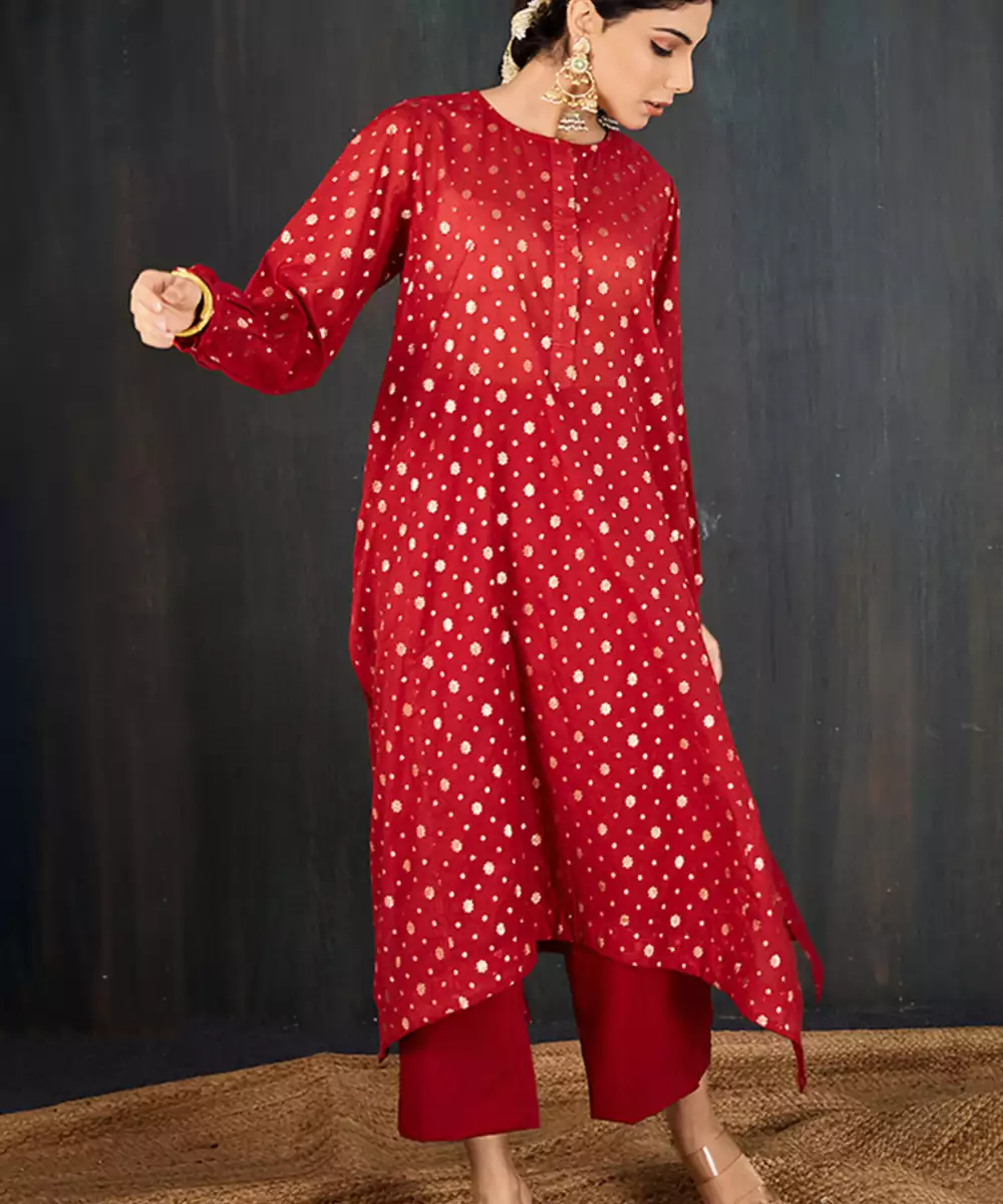 Kurta: A Rich Red Three Kali Kurta In Our Signature Anar Silhouette. Tailored In Chanderi With Floral Jacquard Woven All Over, It Offers A Flowy Anti Fit Shape That Still Falls Gracefully On The Body. The Fabric's Subtle Sheen Lends It A Festive Edge. The Set Comes With A Sleeveless Inner For Added Comfort And Coverage. Pant: Straight Pants In Matching Red For A Cohesive And Balanced Look.