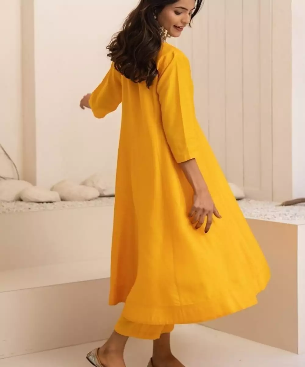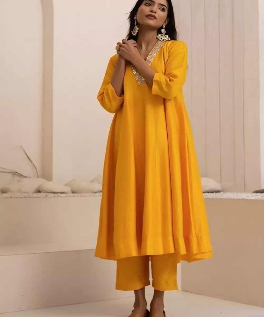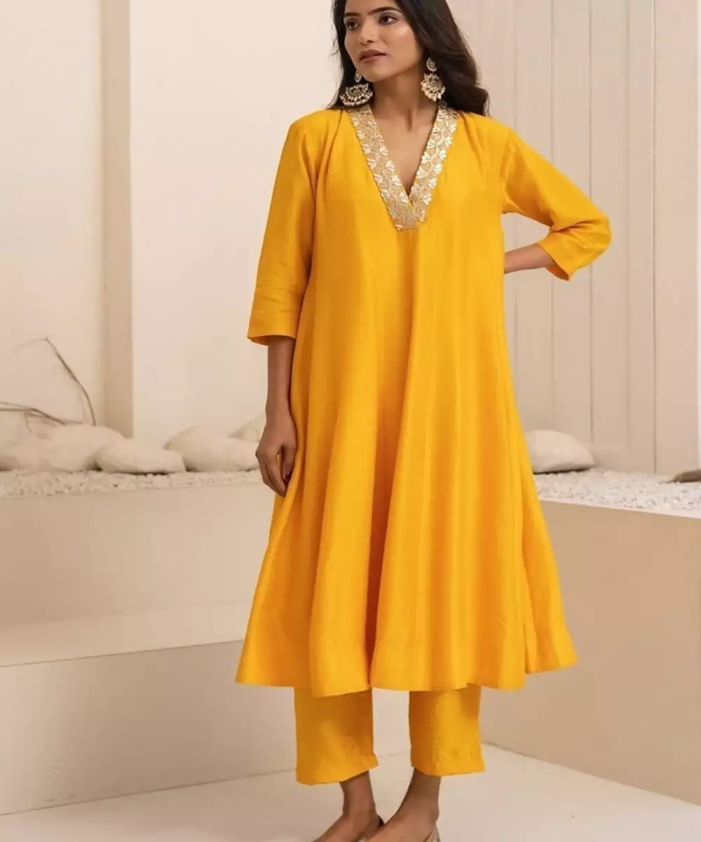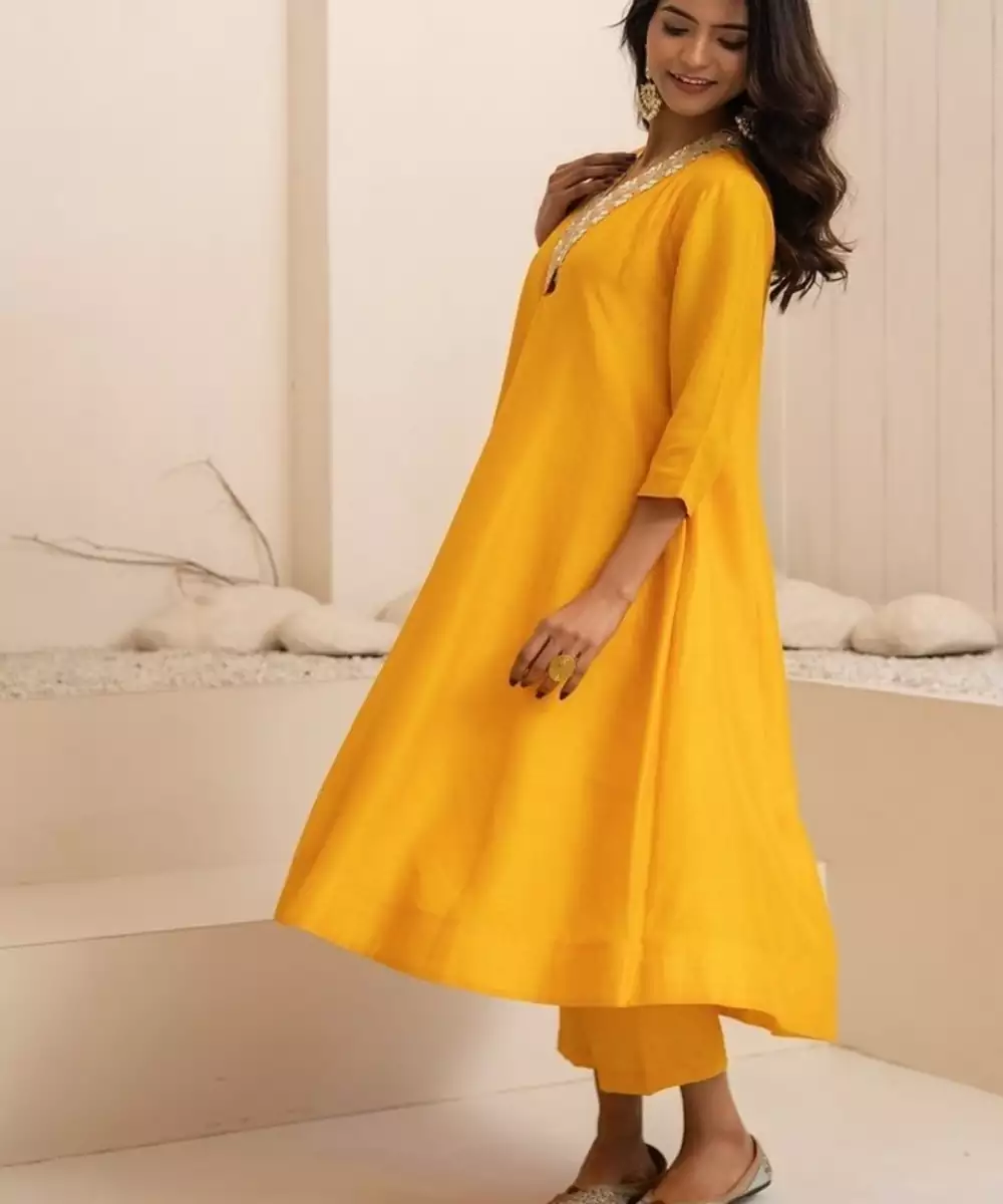 Top: Yellow Kalidaar Loose Fit Kurta With Intricate Gota And Floral Zari Work V Neck Bottom: Yellow Straight Style Pants Colour: Yellow Fabric: Dola Silk Components: 1 Kurta / 1 Pant