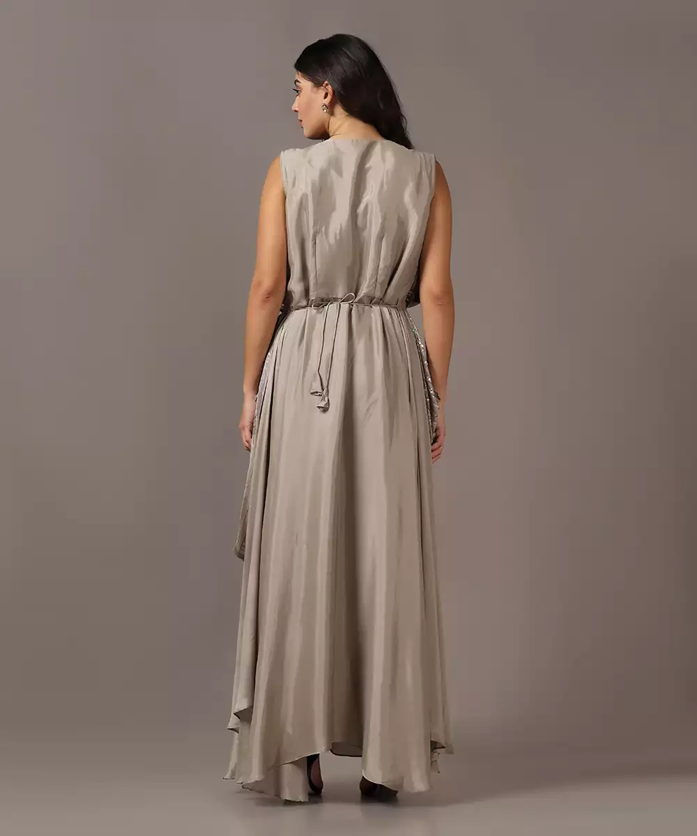 Beige Gown Enhanced With The Drape On The Top. It Has Sequins Work For All That Glitter