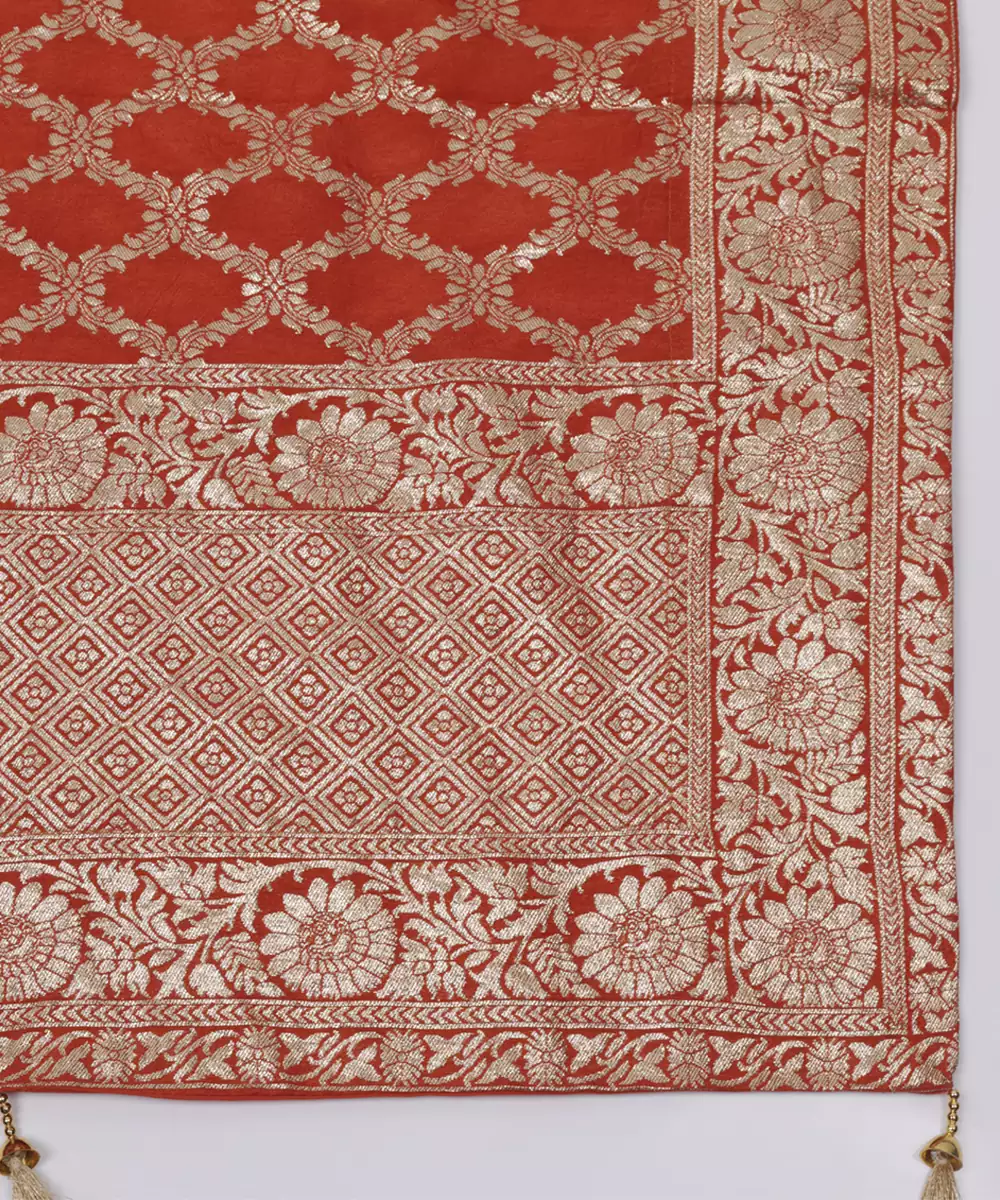Burnt Orange Sequins Embroidered Banarasi Silk Lehenga Sets 0 F 3 Colour: Orange Fabric: Silk Components: 1 Blouse / 1 Skirt / 1 Duppatta