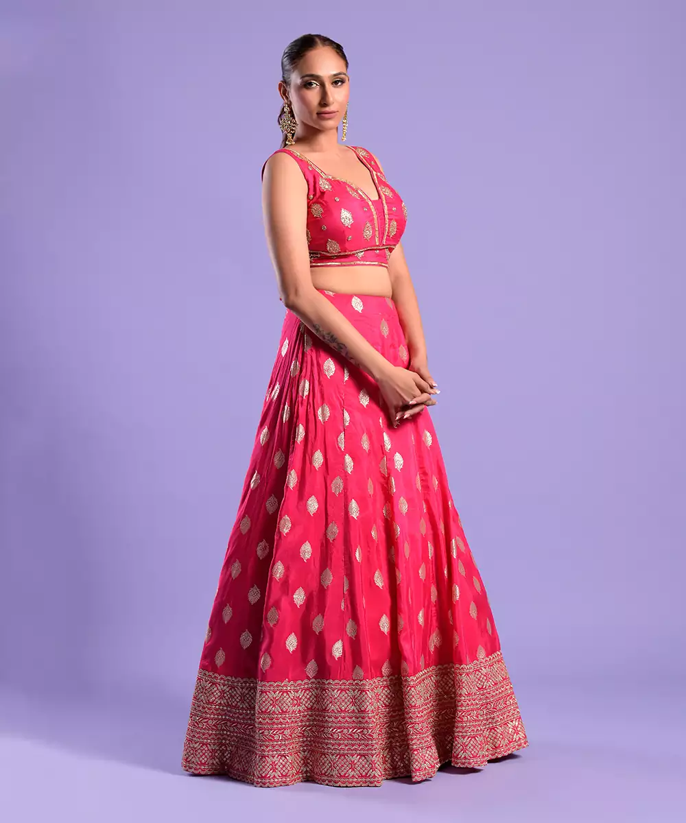 A Kalidar Lehenga Set Has Zari Work . The Blouse Has A Beautiful Neckline It Is Offset With An Net Dupatta Which Has Delicate Zari Work On The Edges To Compelete The Look.
