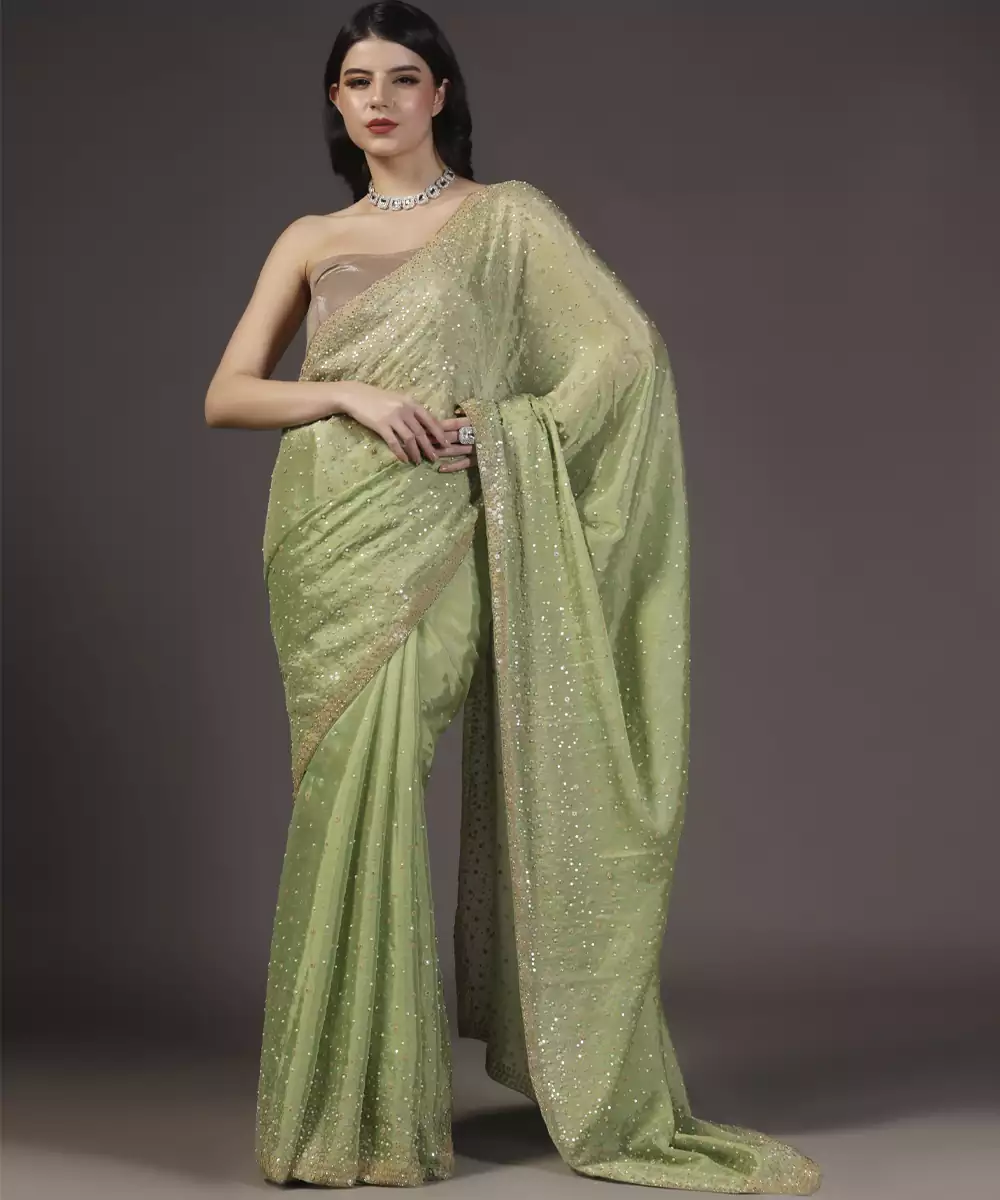 Green Embellised Tine Dull Sequins Embroidered Georgette Saree With Unstitched Blouse Sets Of 2 Colour: Light Olive Fabric: Chiffon Components: 1 Saree / 1 Blouse