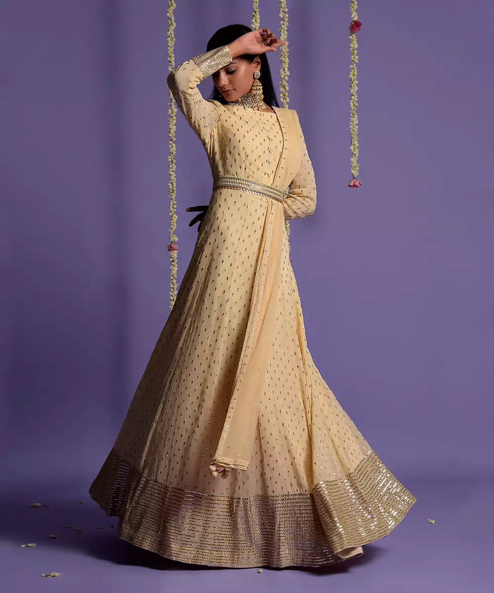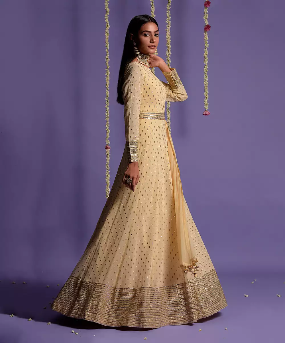 This Ivory Full Length Sequin Embroidered Anarkali Set Is Designed To Give You A Beautiful Look. Made With Net & Georgette Fabric, It Has Sequins And Resham Work All Over. With A Boat Neck It Makes Ones Look Complete.