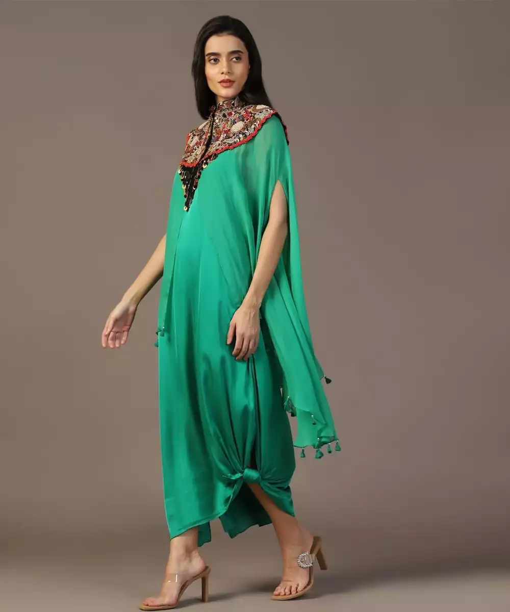Step Into A World Of Luxury And Glamour With This Breathtaking Leaf Green Gown, A True Embodiment Of Elegance. The Gown Features A Flowing Organza Cape That Adds An Ethereal Touch To The Look, Intricately Embroidered With Antique Gold Sequins And Adorned With Delicate Tassels For A Playful Yet Sophisticated Vibe. The Gown Itself Is A Masterpiece Of Craftsmanship, Embellished With Antique Sequins And Pearls, While The Delicate Dapka Work Adds Richness And Texture.The Stunning Neckline Is Beautifully Adorned H A Combination Of Pearls, Antique Gold Sequins, And Zardosi, Creating A Regal Finish That Elevates The Entire Look. The Playful Tassels, Crafted From Sequins And Silver Poth, Bring A Touch Of Whimsy To The Design, Ensuring You Stand Out At Any Event.