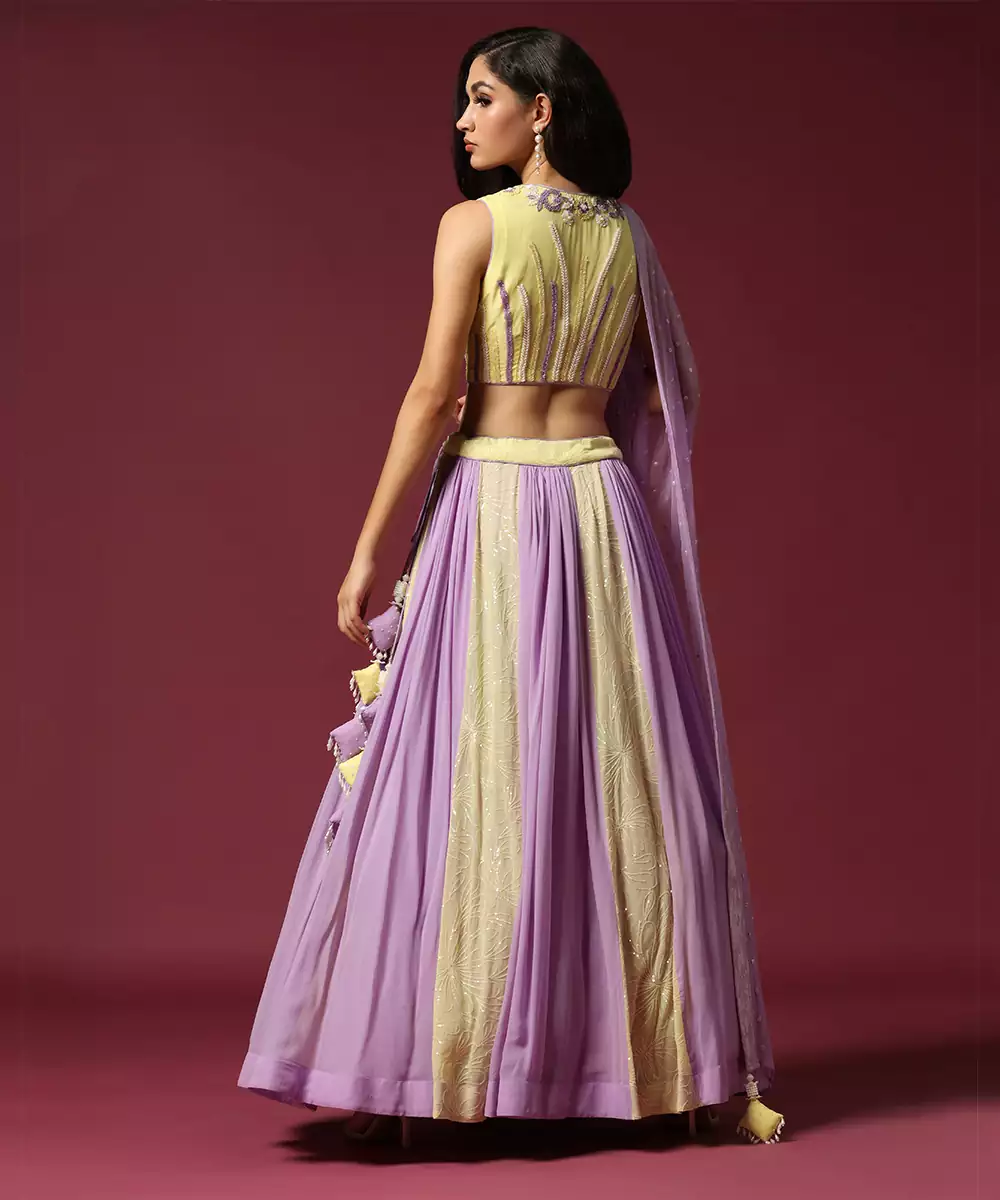 Lilac And Lime Kalidar Lehenga Paired With Lime Hand Embroidered Blouseembellished With Pearls Cutbeads Sequins. Lehenga Is Teamed Up Withgeorgette Dupatta Having Sequins Work.