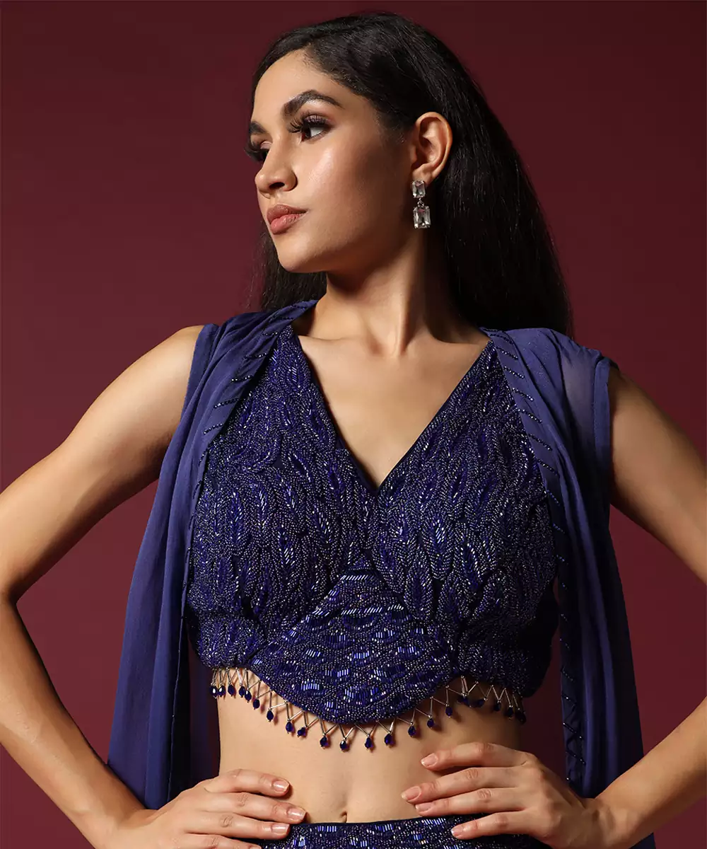Indulge In The Luxury Of This Timeless Modern Classic A Navy Blue Georgette Skirt Set, Featuring A Intricately Embroidered Blouse Decorated With Subtle Tone On Tone Sequins, Beads, And Threadwork. The Same Embroidery Echoes On The Belt Of The Skirt. Complete The Ensemble With A Whisper Thin Georgette Cape.