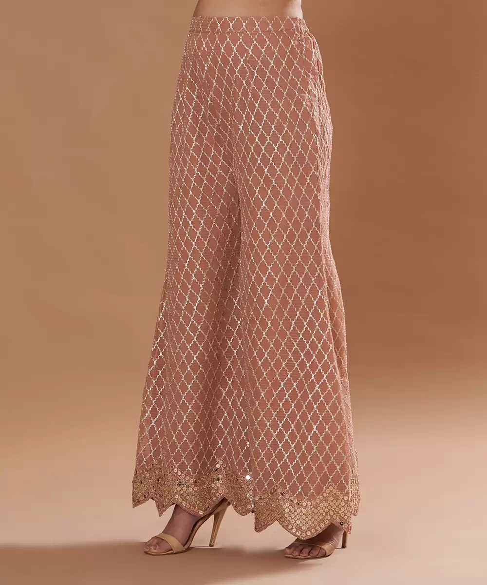 Peach Suit With Zari Jal Emberiodery On Kurti And Sharara And Net Dupatta