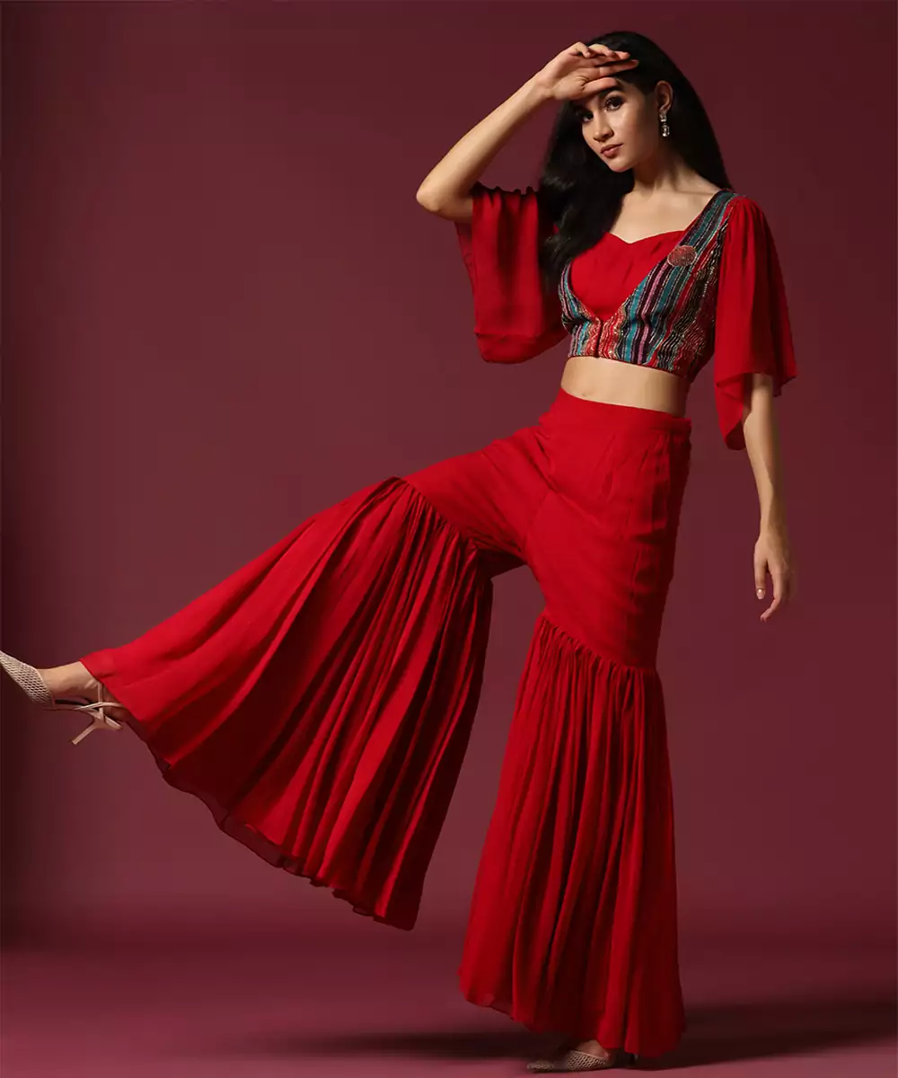 This Red Gharara Set Consists Of A Georgette Crop Top Which Is A Plain Bustier Teamed With An Outer Cover In The Form Of A Crop Top. The Unique Feature Of This Garment Is The Bold Splash Of Multicolor Thread Embroidery Forming The Bodice And The Flared Sleeves. It Sits Atop A Plain Well Cut Gharara Pant.