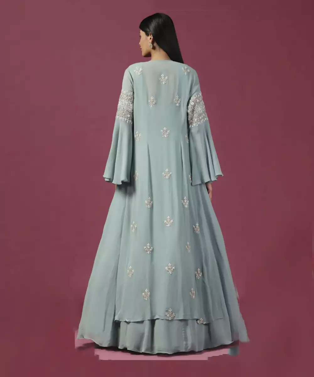 Indulge In Our Luxurious Sea Green Georgette Anarkali, Adorned With Intricate Resham, Cut Dana, And Sequins Work That Adds Sparkle To The Neckline. Detailed Embroidery Enriches The Neckline, Adding Opulence And Grace. A Matching Georgette Cape With Umbrella Style Sleeves Complements The Anarkali, Decorated With Sequins And Resham Work At The Front Borders, Near The Elbow, And Featuring An All Over Design On The Cape's Back. This Ensemble Exudes Sophistication And Charm, Making It Perfect For Special Occasions Where You Want To Make A Memorable Statement With Your Attire.