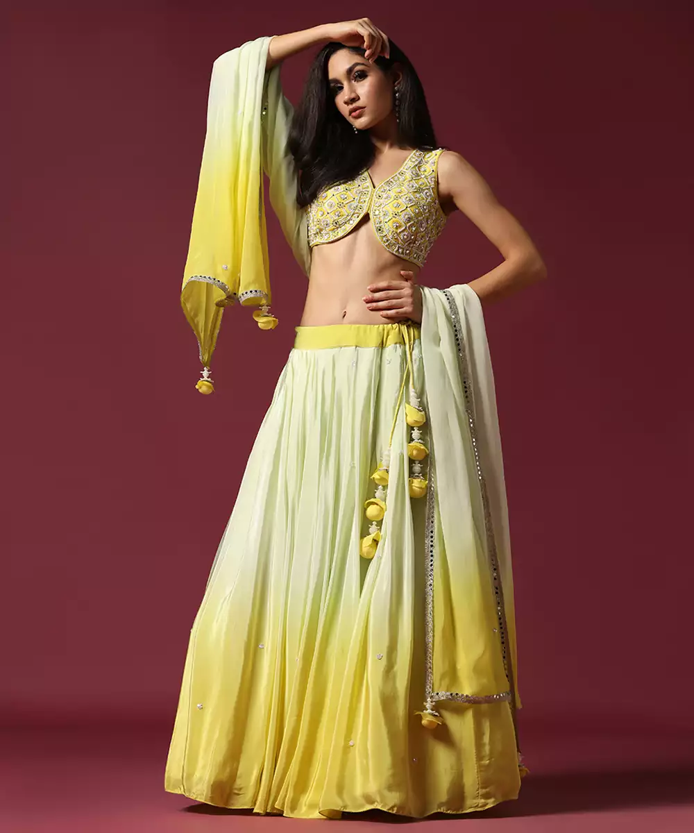 Yellow And Mint Ombre Crepe Silk Lehenhga Paired With Hand Embroidered Blouse Embellished With Pearls Sequins And Cutbeads. It Is Teamed Up Withombre Georgette Dupatta.