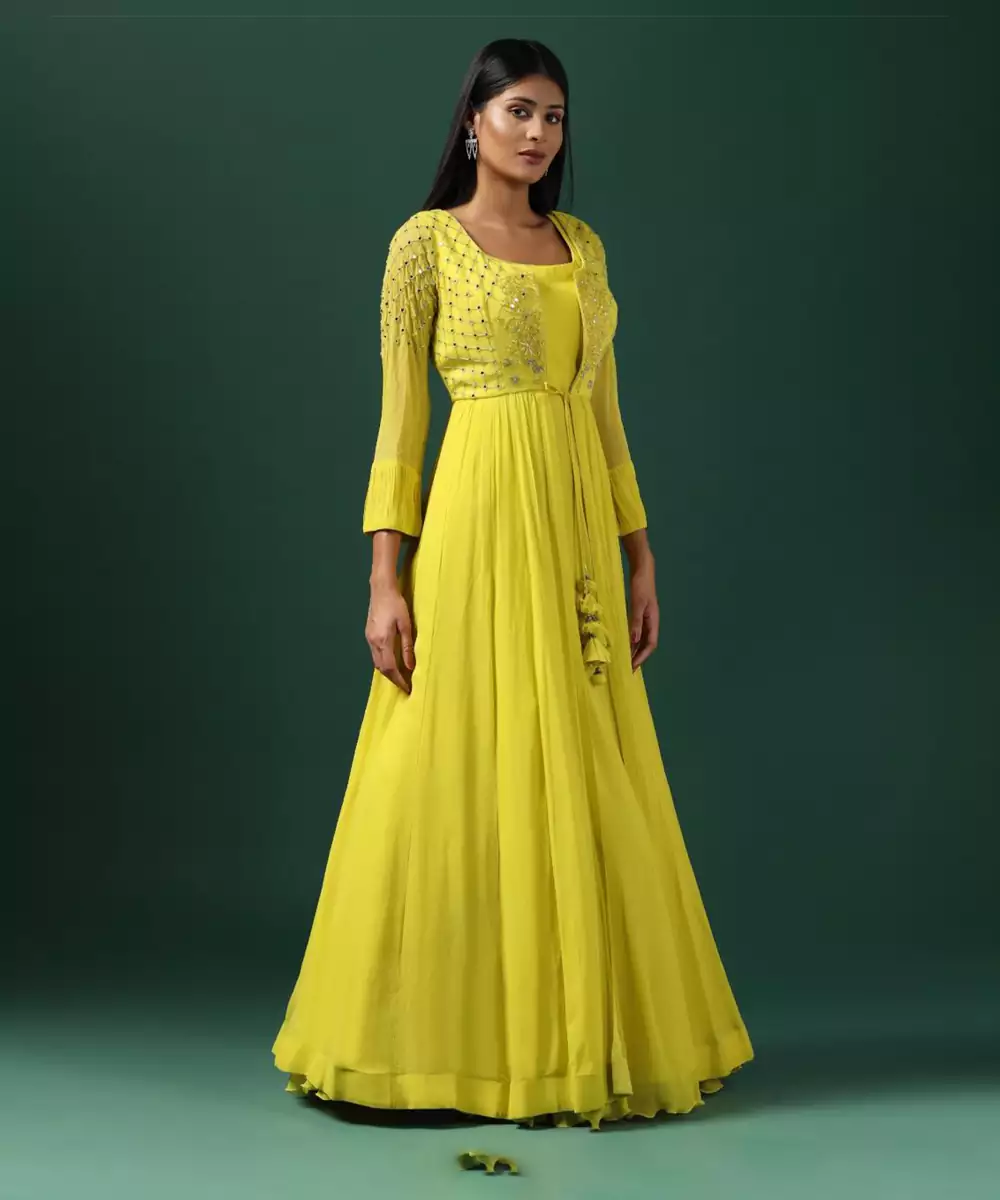 Radiate Elegance With Our Yellow Georgette Sleeveless Anarkali, Featuring A Cape Adorned With Cutdana, Mirror, And Sequins. Complete With 3/4 Sleeves And Tassel Dori, This Ensemble Is Perfect For Special Occasions, Ensuring You Captivate The Spotlight With Its Vibrant Color And Intricate Details.