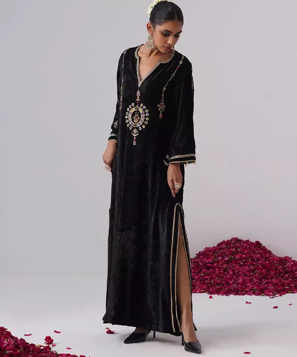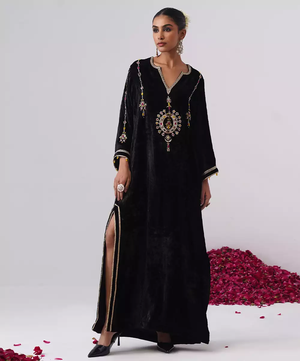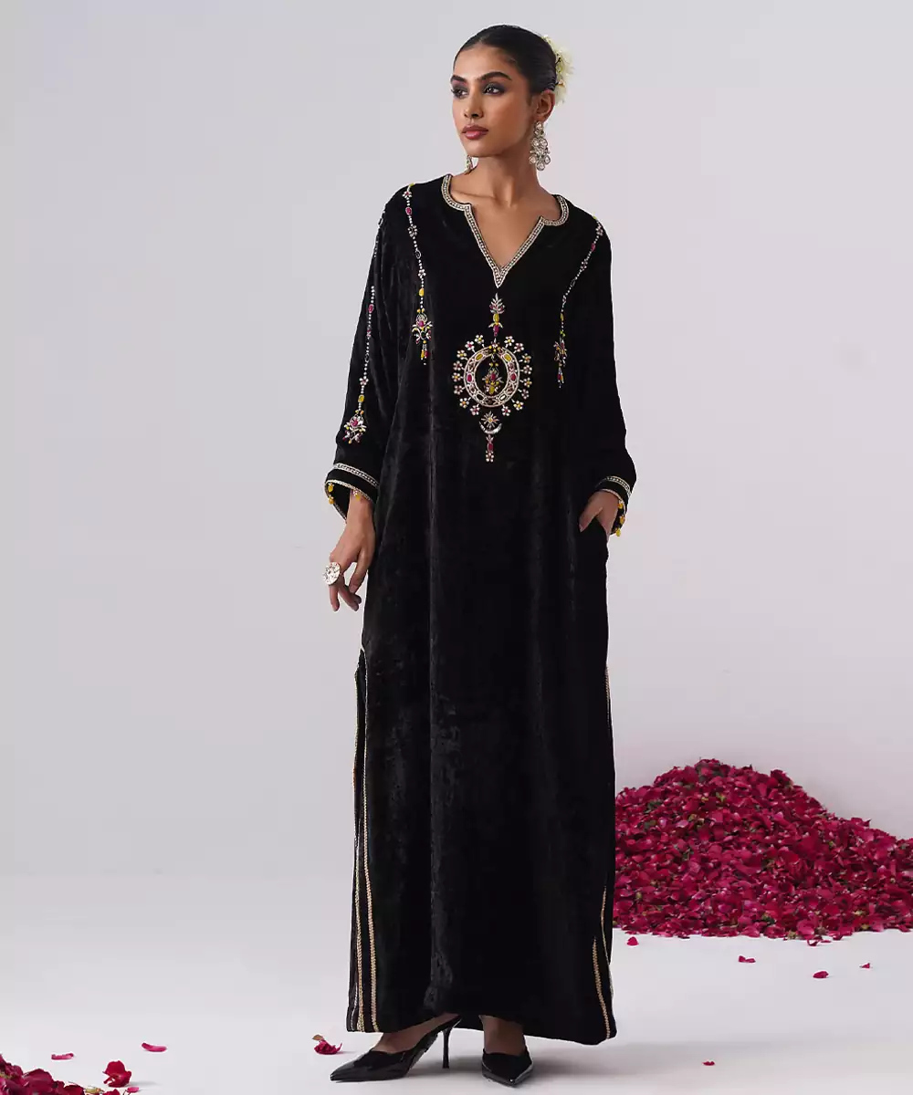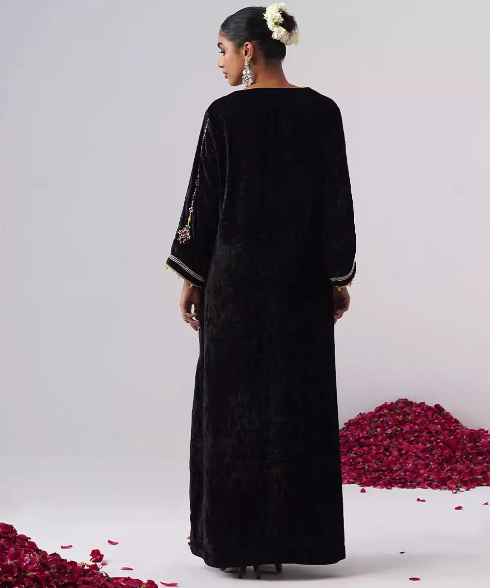 This Black Embroidered Velvet Kaftan Exudes Luxurious Elegance And Timeless Sophistication. Crafted From Rich, Soft Velvet, It Features Intricate Embroidery That Adds A Regal, Refined Touch. Perfect For Evening Gatherings And Festive Occasions, It Offers A Graceful Flow, Comfortable Fit, And Effortlessly Glamorous Appeal.