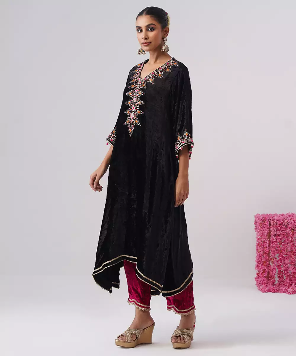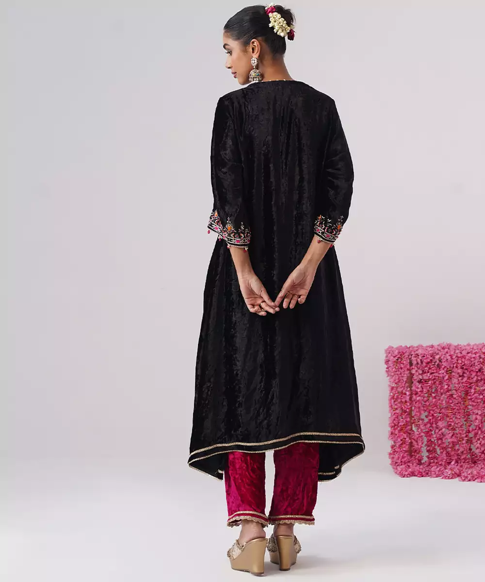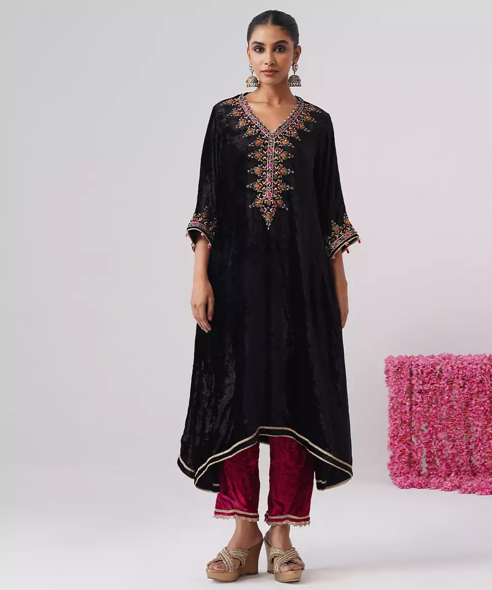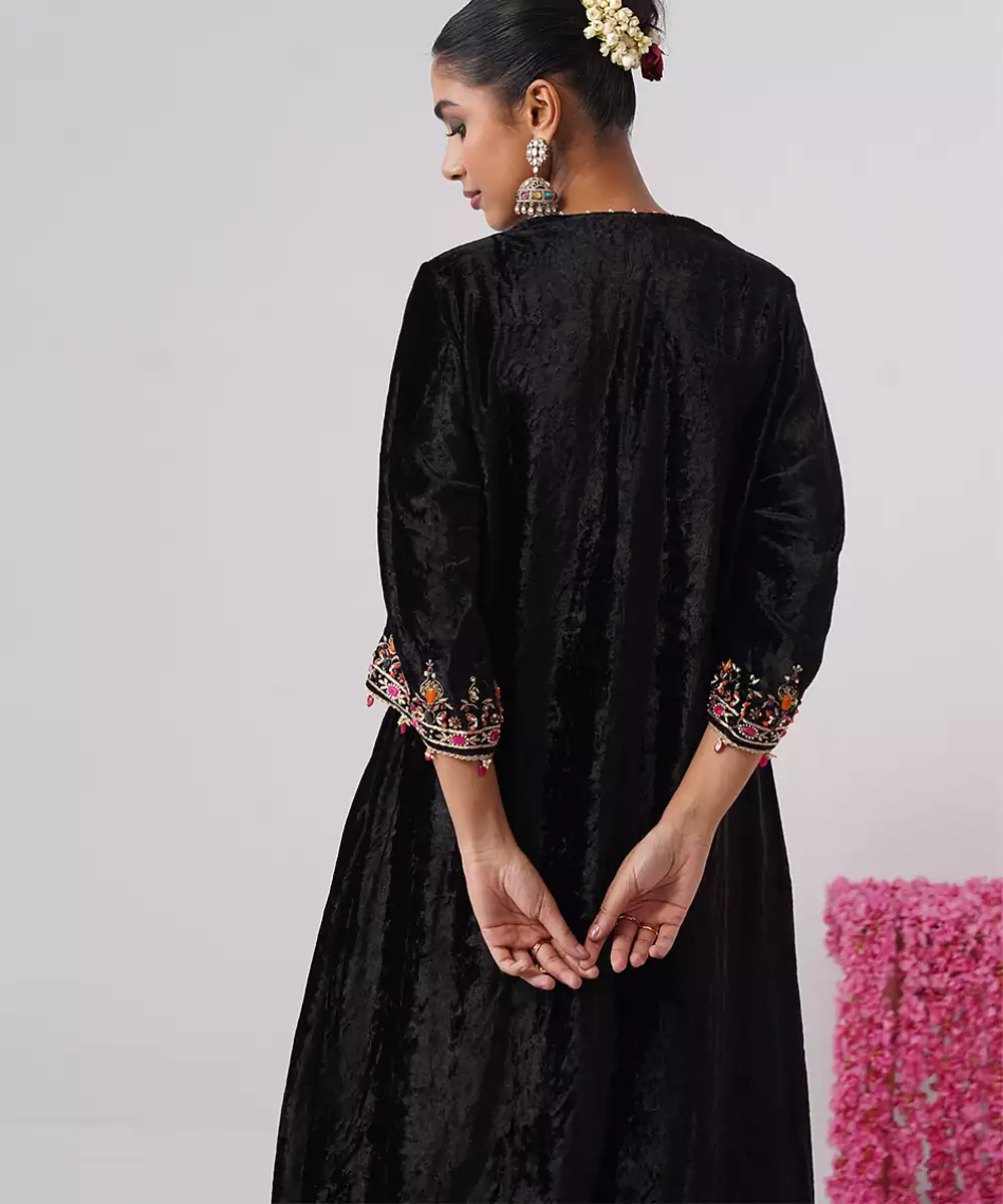This Black Embroidered Velvet Kaftan Exudes Luxurious Elegance And Timeless Sophistication. Crafted From Rich, Soft Velvet, It Features Intricate Embroidery That Adds A Regal, Refined Touch. Perfect For Evening Gatherings And Festive Occasions, It Offers A Graceful Flow, Comfortable Fit, And Effortlessly Glamorous Appeal.
