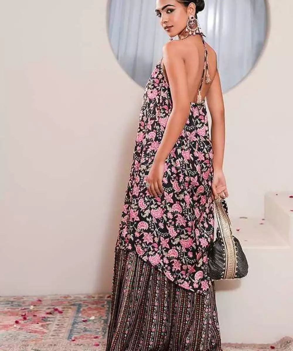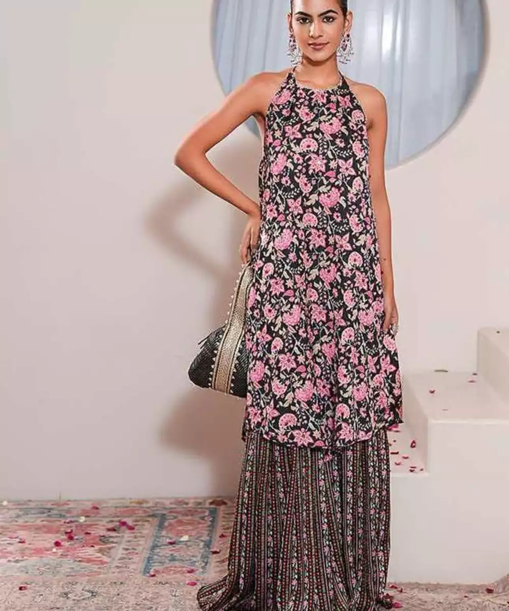 A Vibrant And Fun Rosheen Pearl Gharara Set Featuring A Straight Kurta With Ghararas. Executed In A Lustrous Crepe Silk Fabric With Black Chintz Print, The Kurta Features Pearl And Sequins Hand Embroidery All Over. The Halter Neck, Backless Kurta Has A Neckline Which Is Adorned With Gota Detailing.The Dori At The Back Has Hand Embroidered Latkans Beautifying The Look.