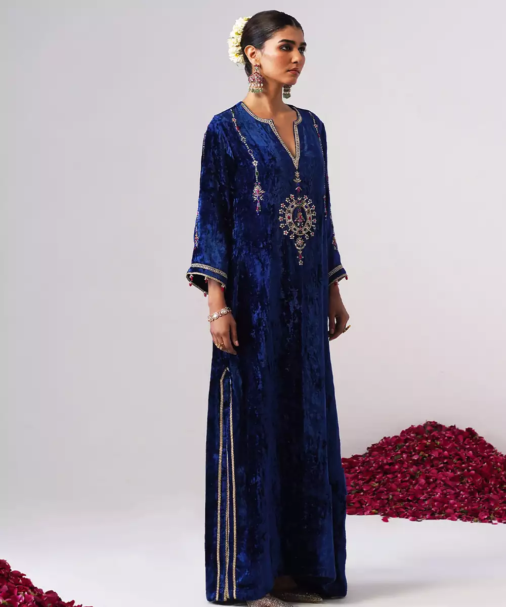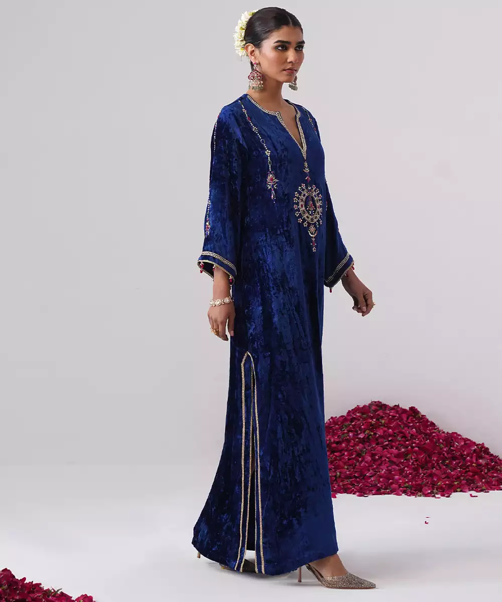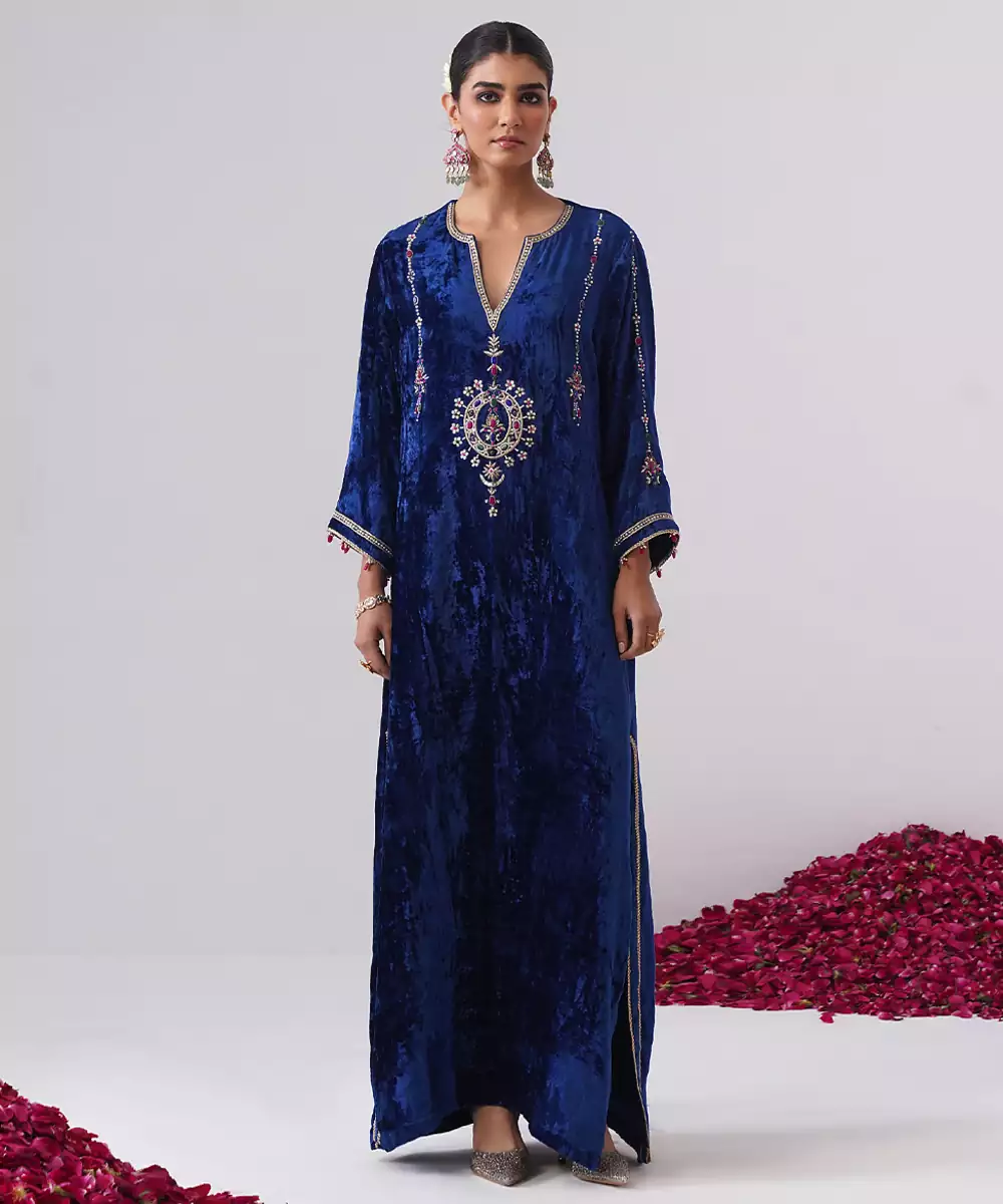 This Blue Embroidered Velvet Kaftan Exudes Luxurious Elegance And Timeless Sophistication. Crafted From Rich, Soft Velvet, It Features Intricate Embroidery That Adds A Regal, Refined Touch. Perfect For Evening Gatherings And Festive Occasions, It Offers A Graceful Flow, Comfortable Fit, And Effortlessly Glamorous Appeal.