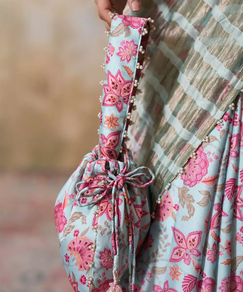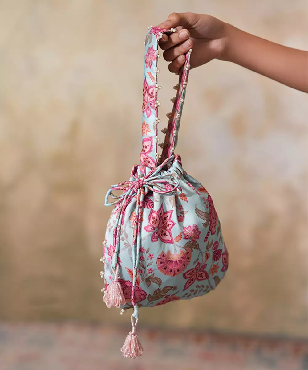 Blue Silk Printed Potli Bag Featuring A Smooth, Lustrous Texture And Charming Traditional Prints. Designed With A Secure Drawstring Closure And Delicate Detailing, It Adds A Graceful Touch To Festive And Ethnic Ensembles, Making It Ideal For Weddings, Celebrations, And Special Occasions.