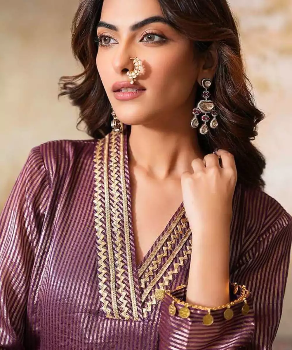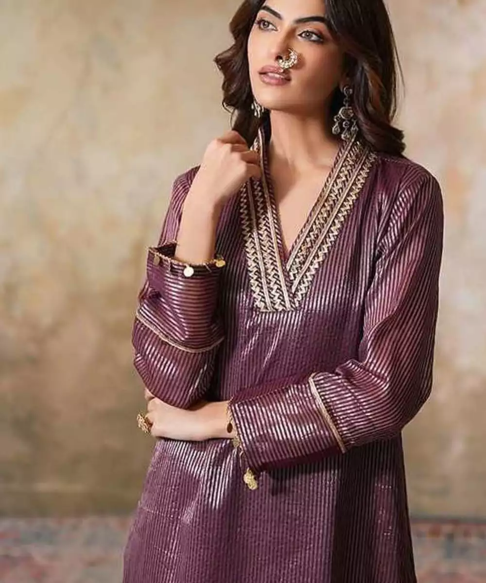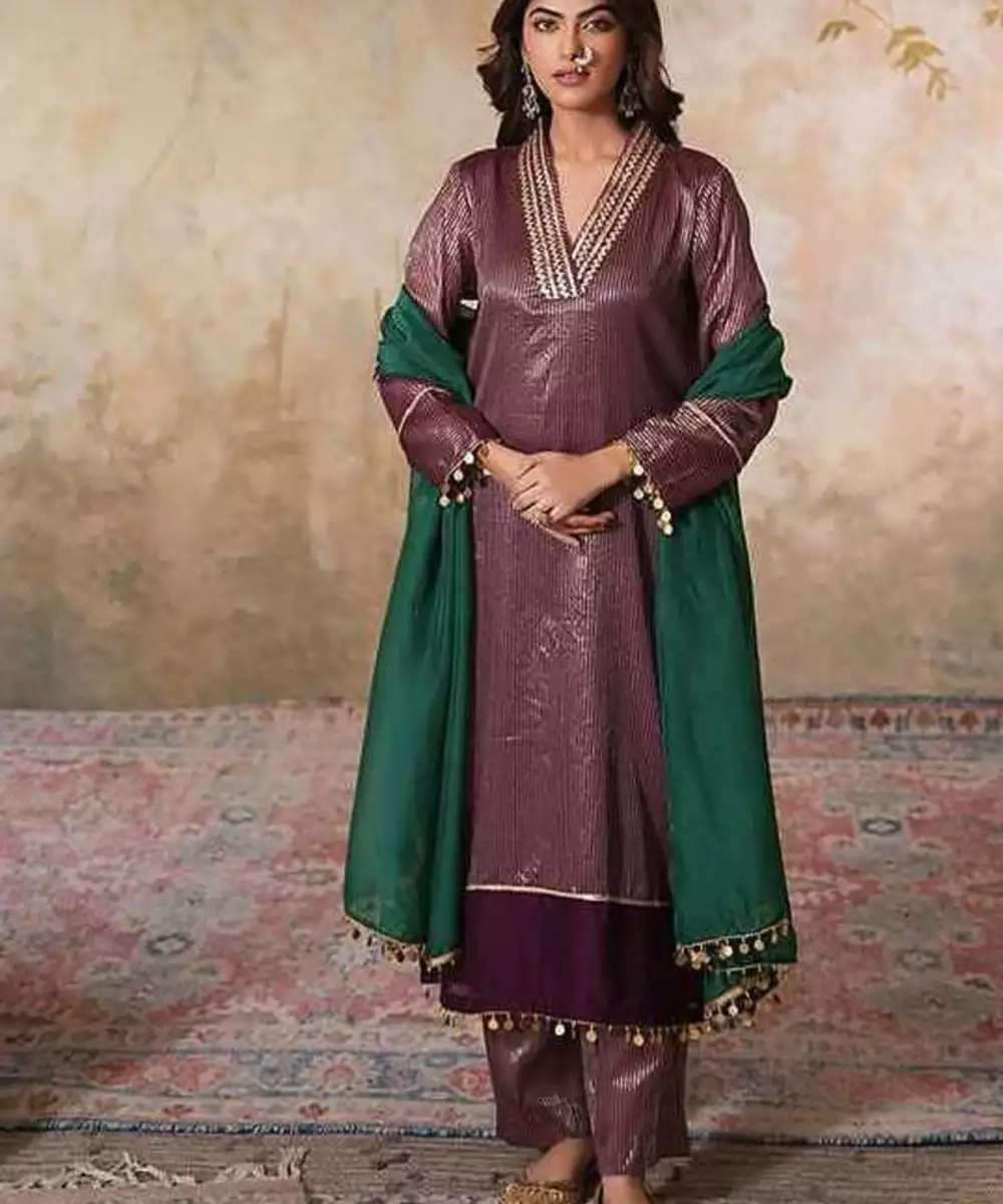 This Jamuni Gold Striped Chanderi Tissue Gauhar Gota Kurta Set Is A Vision Of Grandeur, Perfect For Festive Gatherings Or Special Events. The Kurta Is Adorned With Delicate Organza Detialing On The Hem And Sleeves Along With Gota Embellishments Throughout. The Overlap V Neckline Is Designed With Stunning Gota Embellishments In Gold, While The Sleeves Feature Delicate Gold Coin Hangings On The Cuffs, Complementing The Kurta's Luxurious Feel. The Kurta Is Lined With A Cotton Mul Lining To Add Ease And Comfort.