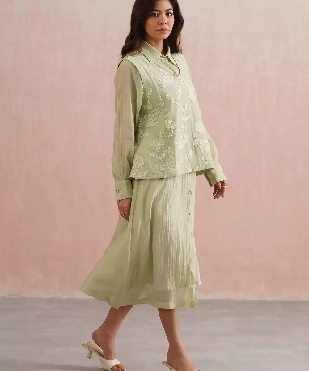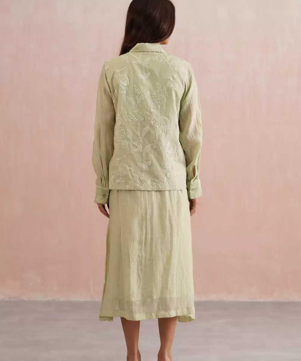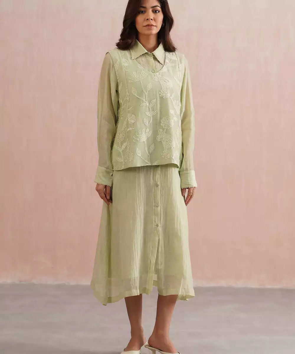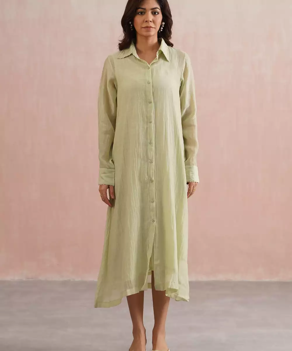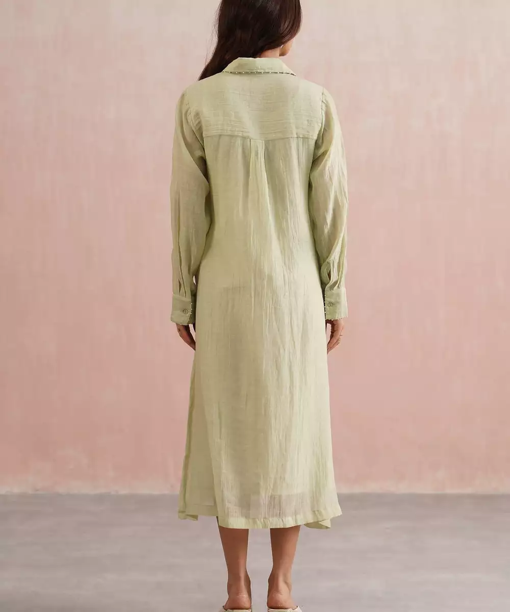 This Elegant Pastel Sage Green Shirt Dress Is Crafted In Breathable Pure Mul Chanderi, Ideal For Warm Weather Dressing. Featuring A Classic Front Button Placket And Delicate Pearl Detailing At The Collar And Cuffs, It Effortlessly Blends Sophistication With Comfort.