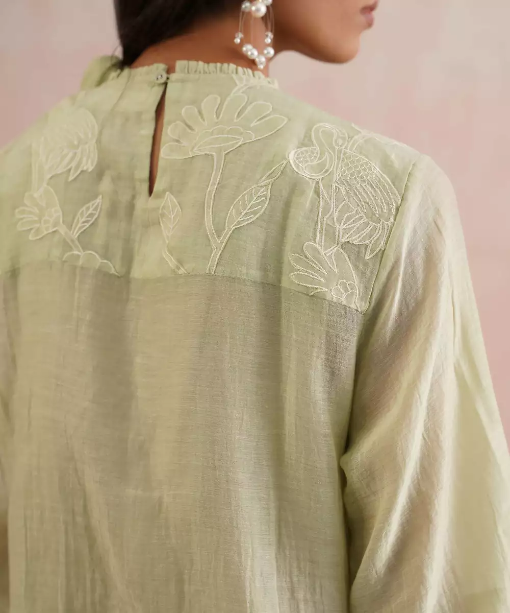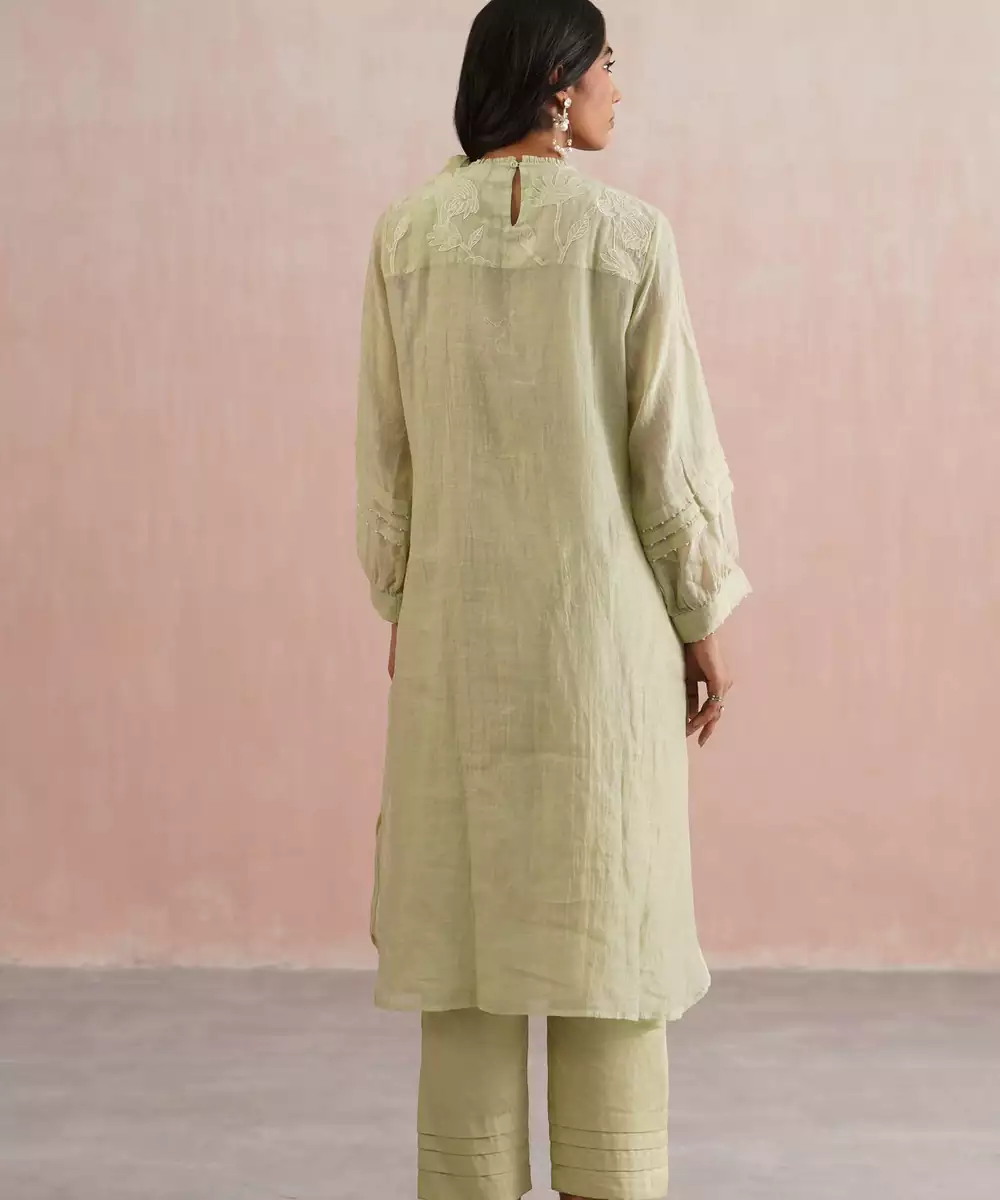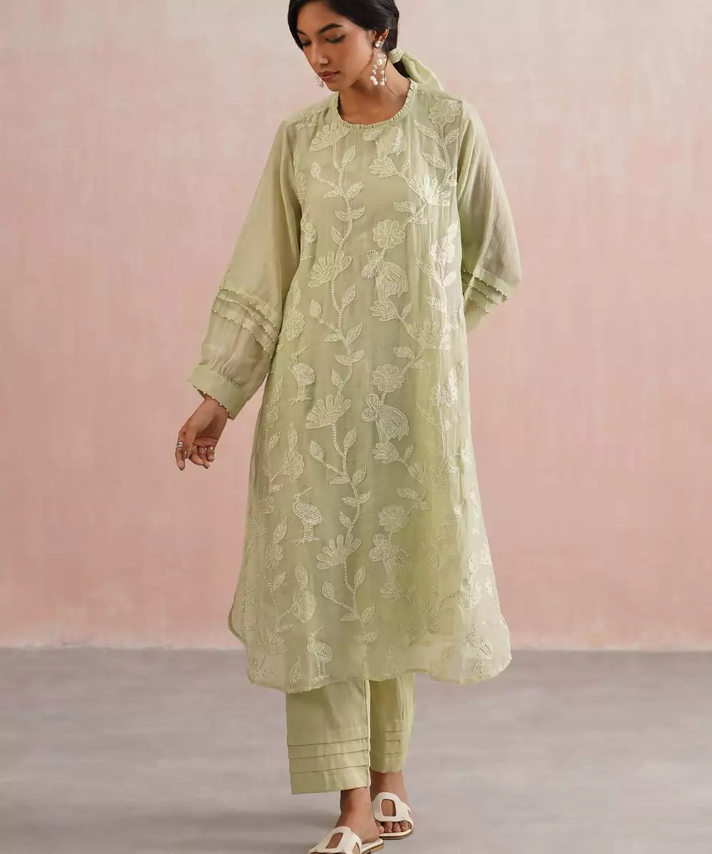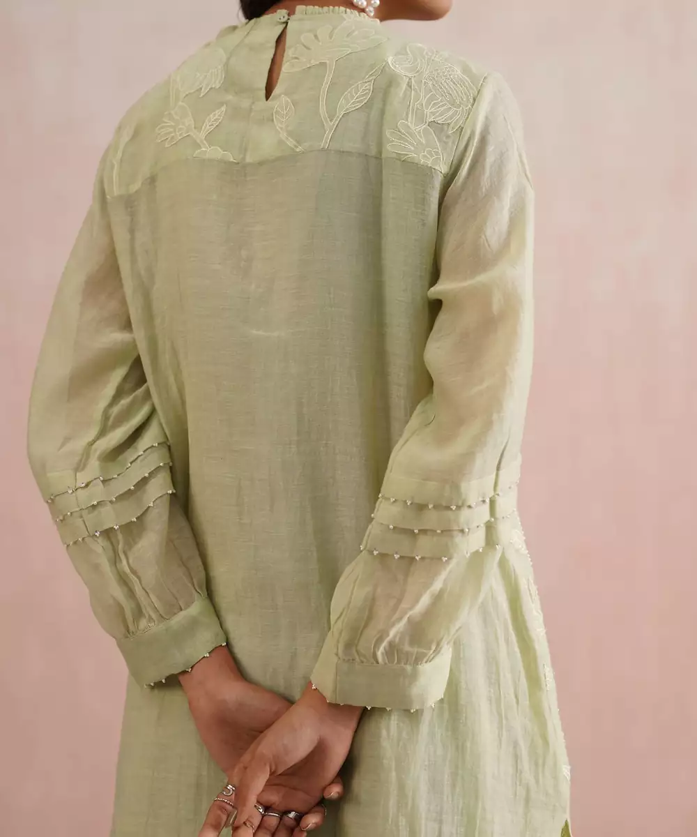 Soft, Graceful, And Timeless The Willow Set Is Crafted In A Serene Sage Green Mul Chanderi, Designed For Effortless Elegance. The Kurta Features Full Sleeves With Pleated Detailing And Pearl Embellishments, Adding A Delicate Touch To Its Structured Silhouette. It’s Adorned With Handcrafted Appliqué Embroidery And Scattered Pearls, Creating An Ethereal, Textural Charm. It Has A Straight Fit With Slits.