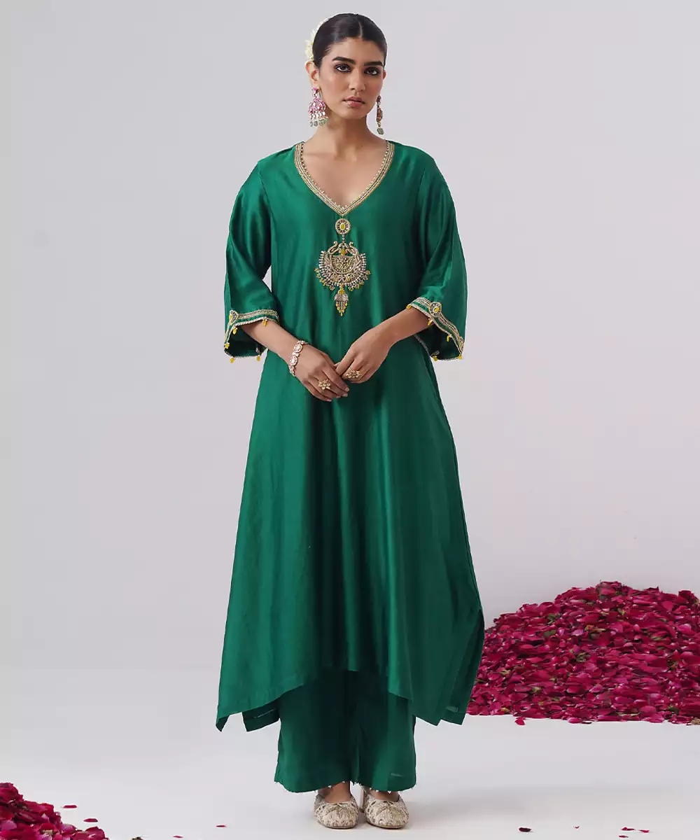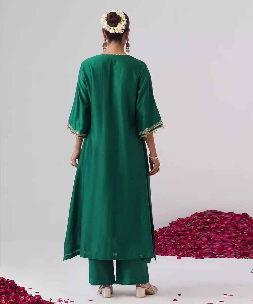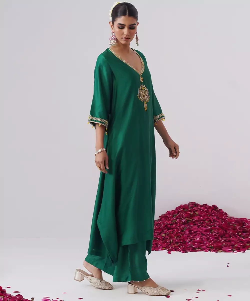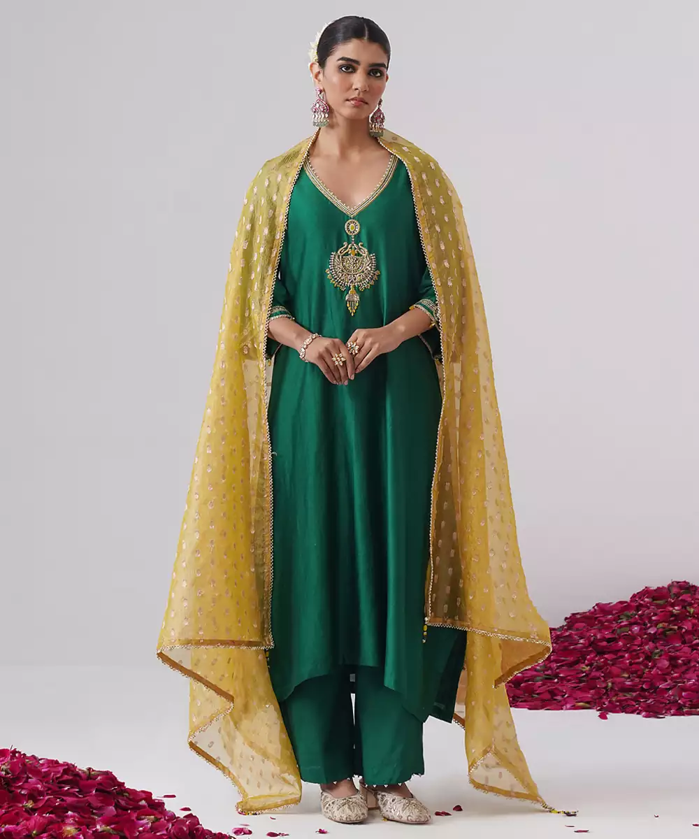 This Green Embroidered Chanderi Silk Kurta Set Radiates Festive Elegance And Graceful Charm. Crafted From Lightweight, Lustrous Chanderi Silk, It Features Intricate Embroidery That Adds A Refined, Traditional Touch. Perfect For Celebrations And Special Occasions, It Offers Comfort, A Flattering Silhouette, And Timeless Ethnic Appeal.