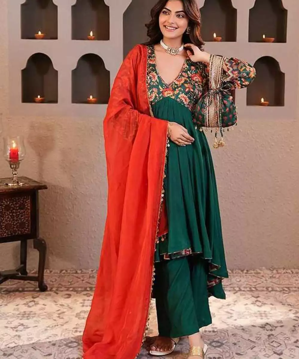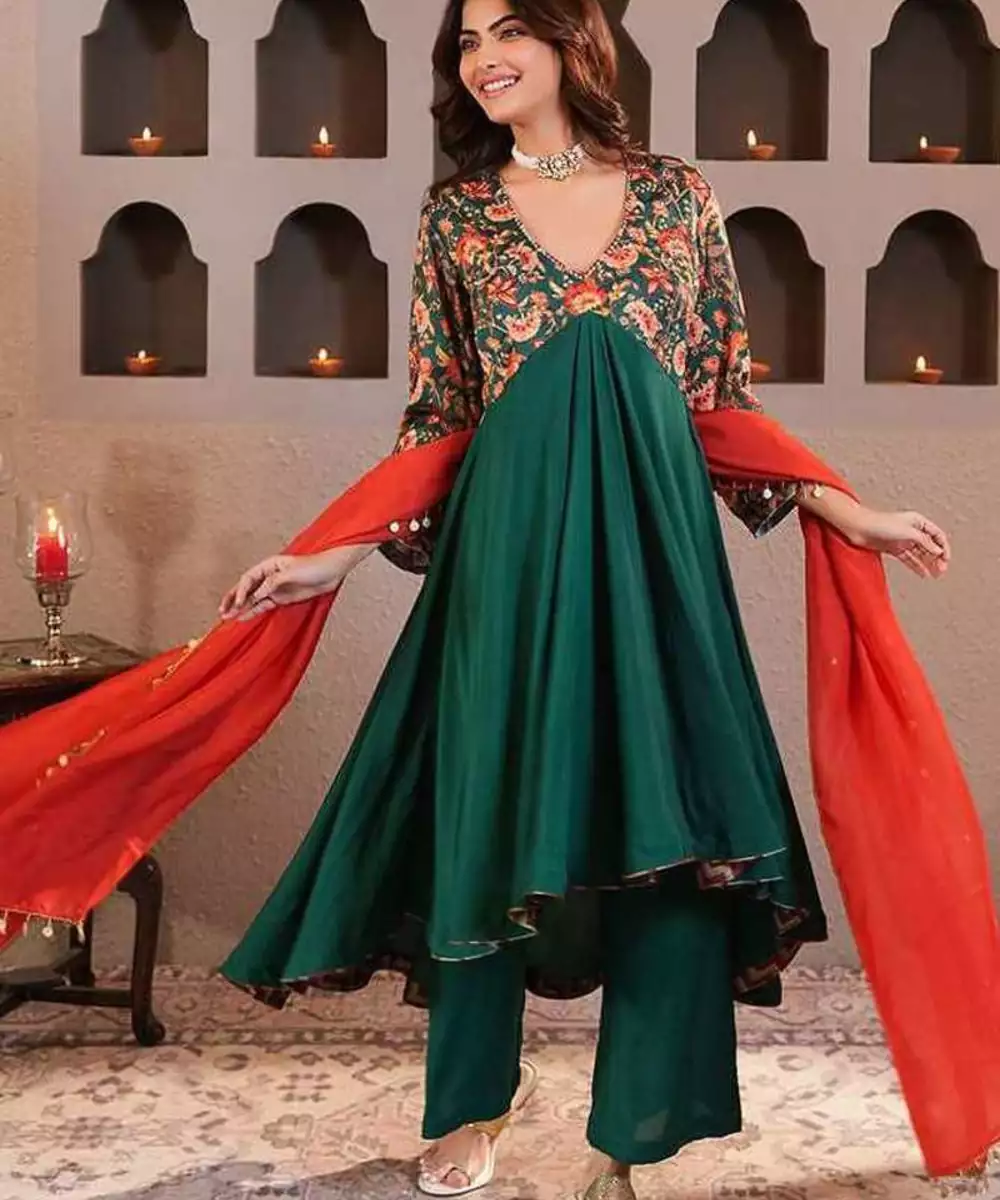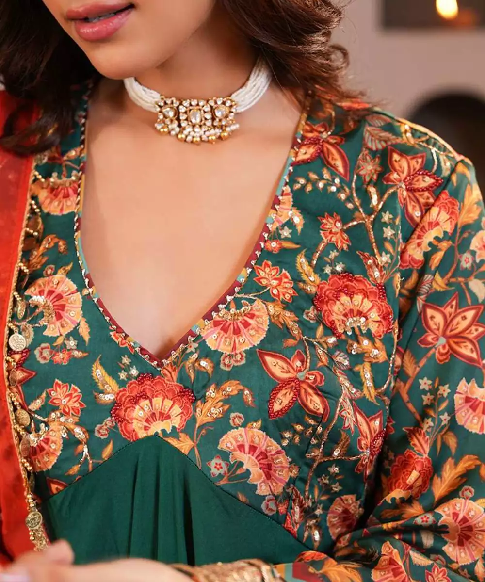 Step Into The Spring Season With Sabz Chintz Anarkali Set, Designed To Make A Bold Statement While Maintaining Traditional Elegance. The Kurta Is Crafted In Emerald Green Muslin Silk, Featuring A Flattering High Low Silhouette That Ensures Comfort And Style For Any Occasion.The Pants Complement The Kurta In Emerald Green Muslin Silk Fabric With A Straight Fall Adding Comfort And Flow.